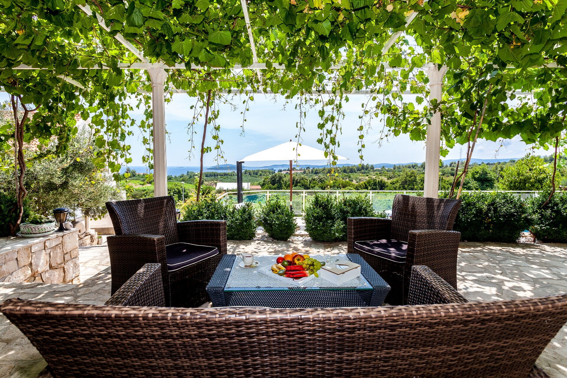 Villa Azurit’s location in the hills offers incredible views of the sea, which is less than a kilometer away. There are panoramic views from the pool, the hot tub embedded in stone, the relaxation areas, and the dining areas in the furnished pergolas.