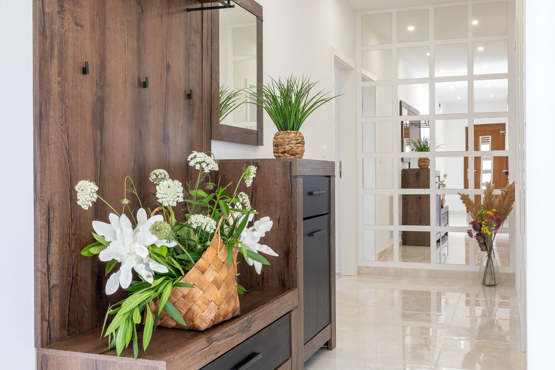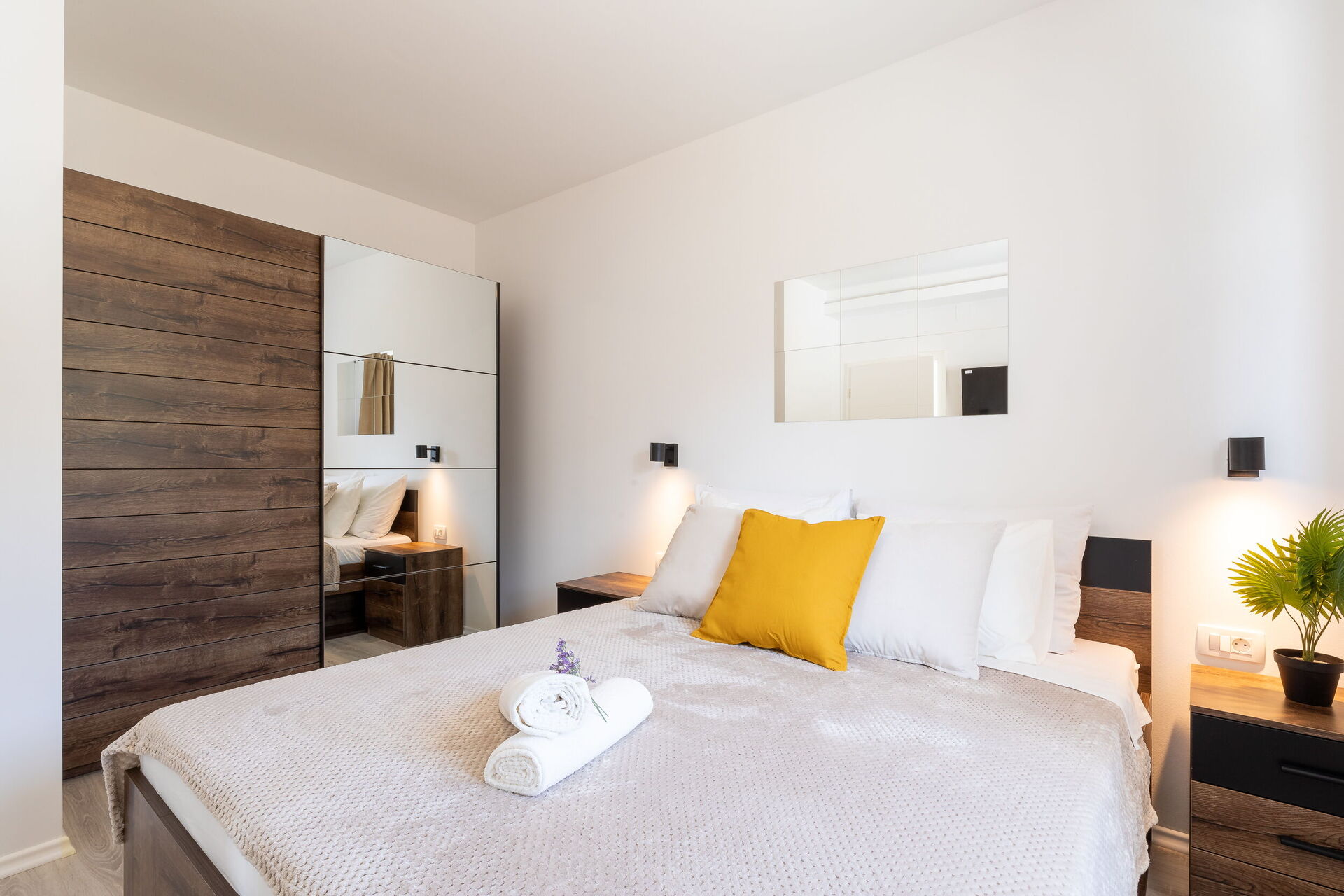 Ground floor:large open plan living room, kitchen and dining area, 2 double bedrooms, bathroom with shower, double bedroom with private bathroom with shower.
