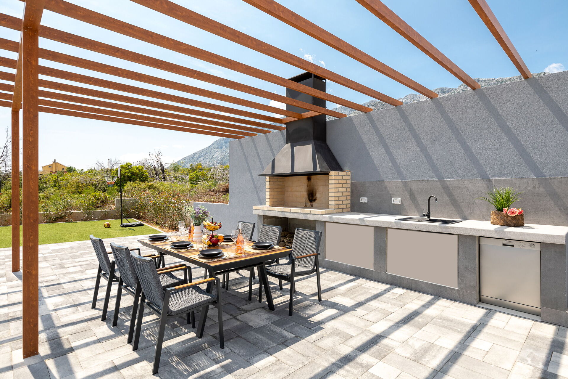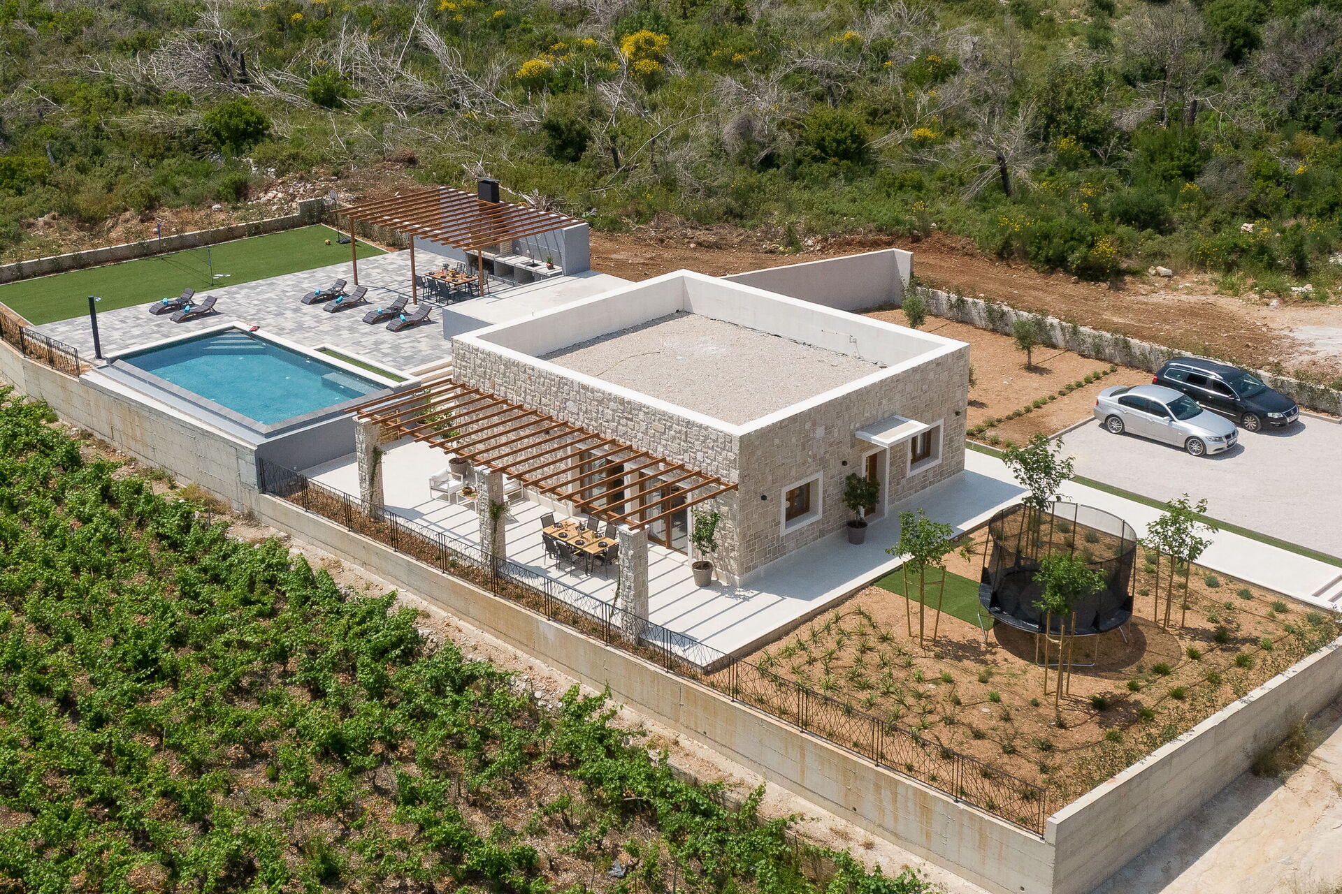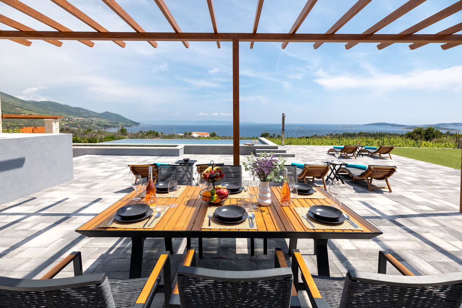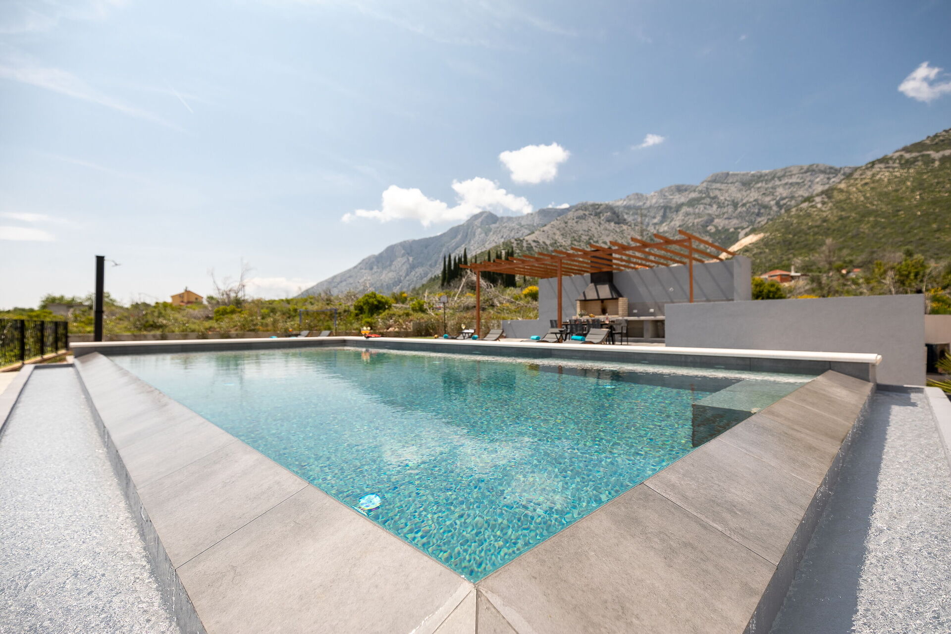 You can enjoy the same breathtaking view from the pool area. It has an elegant infinity pool and a second pergola equipped with a modern outdoor kitchen with barbecue and dishwasher, and another with an outdoor dining area. The entire area is on a large paved patio.