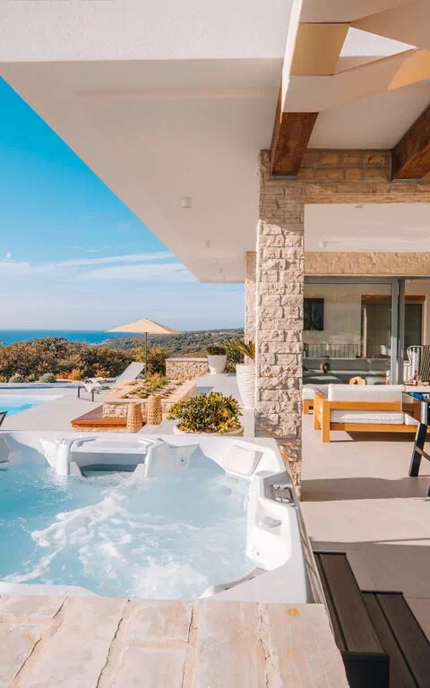 Not only does this enchanting villa have fantastic views of the sea and surrounding scenery, it is a relaxing and tranquil place for your vacation. There is a lovely pool by a large patio with sun loungers, and an outdoor hot tub where you can enjoy beautiful days outside.