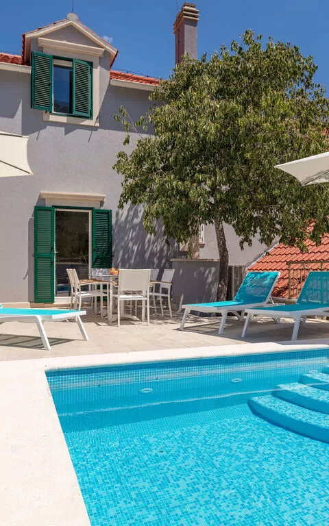 The villa’s exterior is very private and offers a beautiful pool with a sun deck and barbecue.