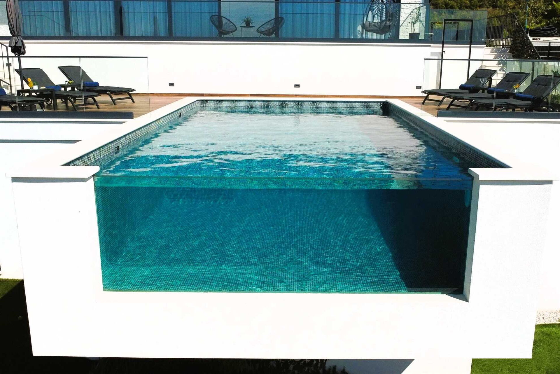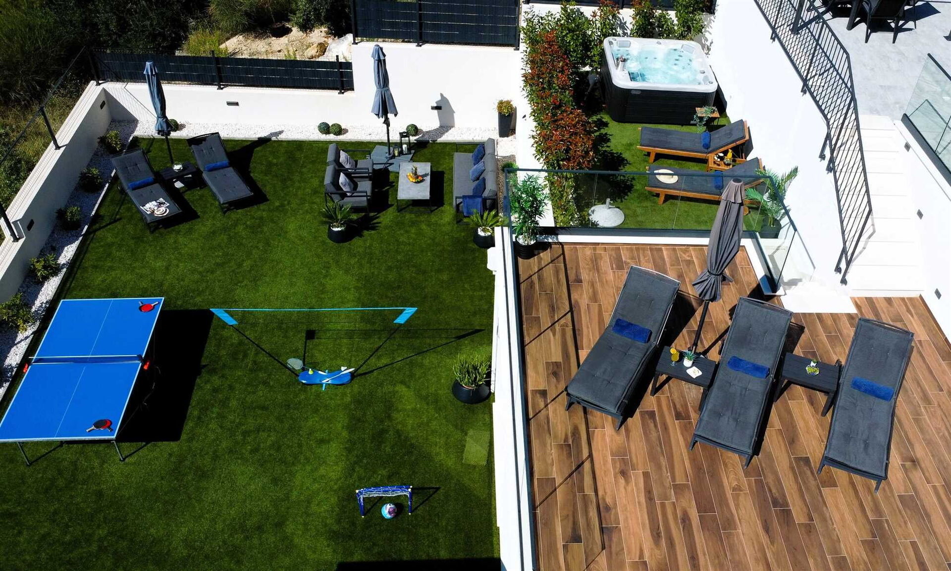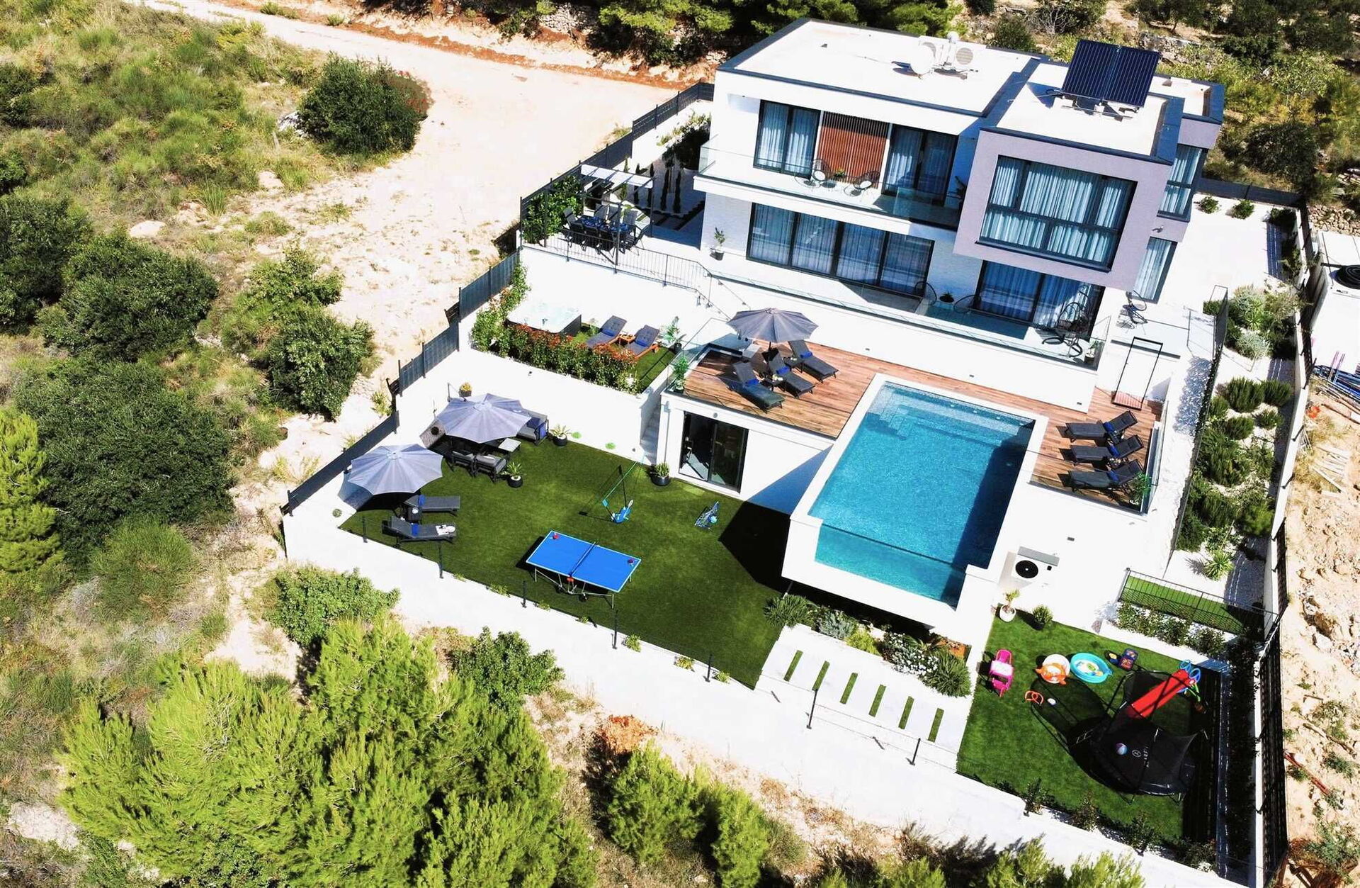 Villa Nikta has multiple levels both inside and outside. Inside, the house has two floors, 5 bedrooms and 5 bathrooms to accommodate up to 10 people. Outside, the terraced garden has an area with a hot tub, a spectacular pool, and a children’s play area with a trampoline and ping pong table.