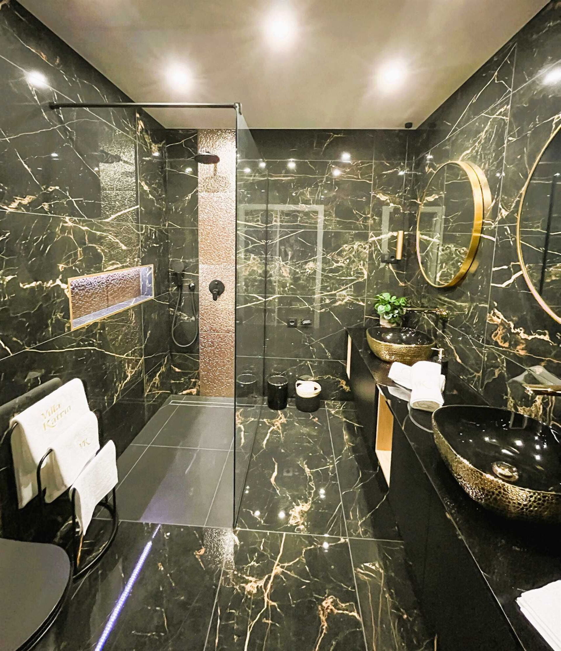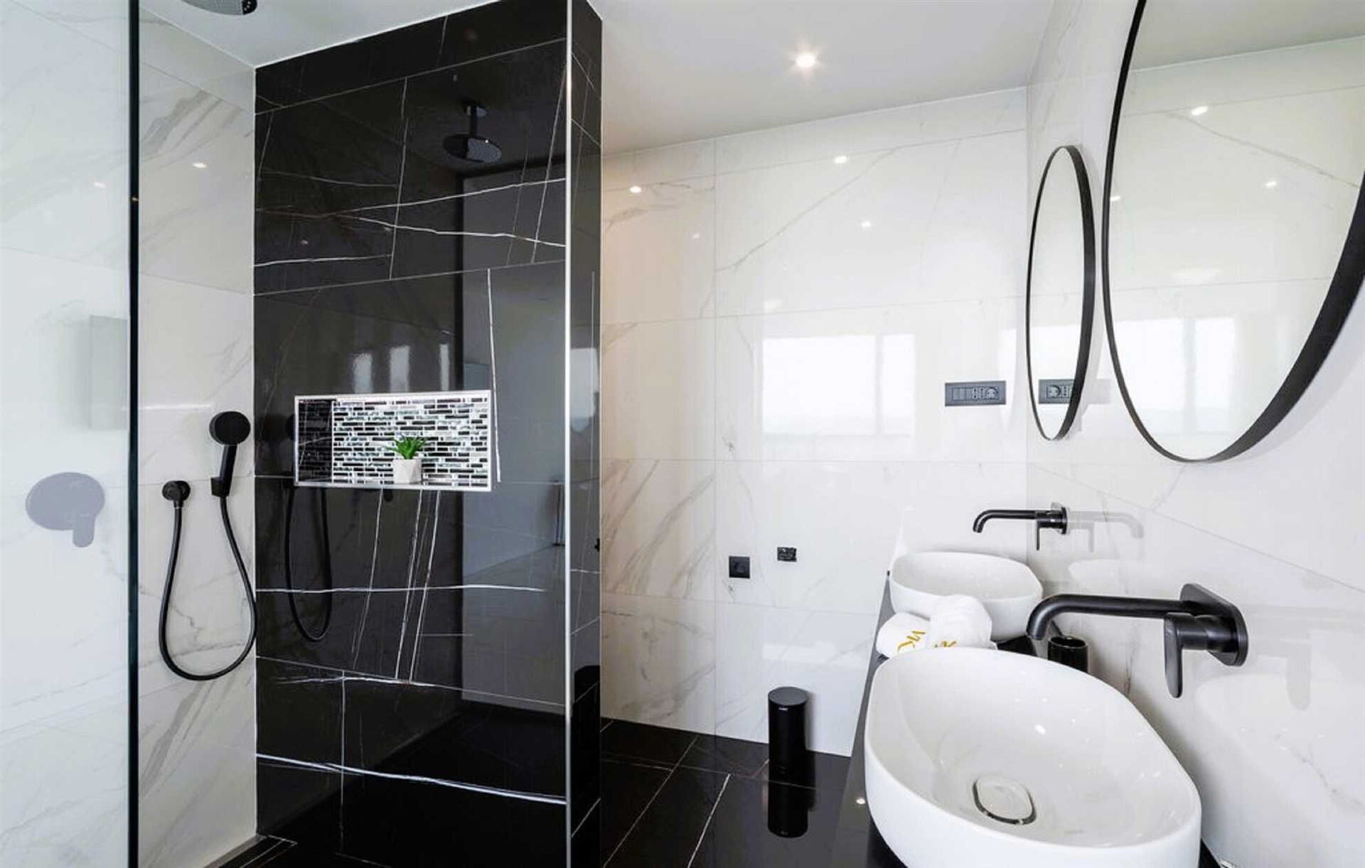 First floor 3 double bedrooms with balcony access, 3 bathrooms with shower, double bedroom with private bathroom with shower and bathtub in the bedroom.