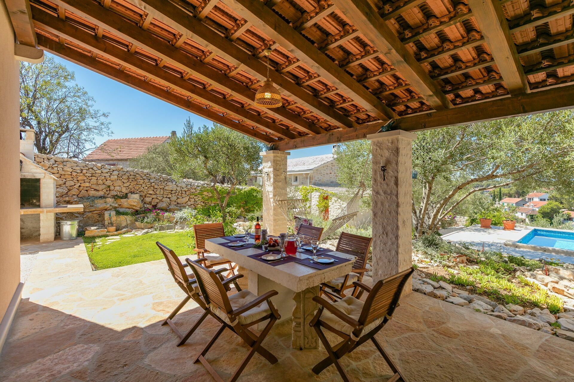 This splendid villa is surrounded by a lovely multi-level garden, and offers a private pool with sun loungers and umbrellas: the ideal spot for relaxing with family and friends. Under the portico, there is an outdoor dining area where you can savor al fresco meals and take in breathtaking views of Milna bay.