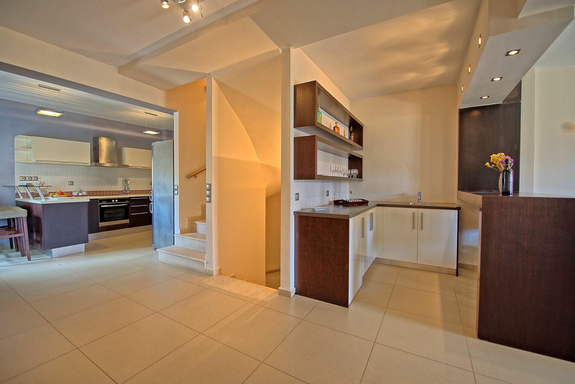 First floor: large living room (satellite TV) with dining area, bar corner (refrigerator) and kitchen (oven, freezer, dishwasher, American coffee maker, microwave); this floor also has direct outside access.