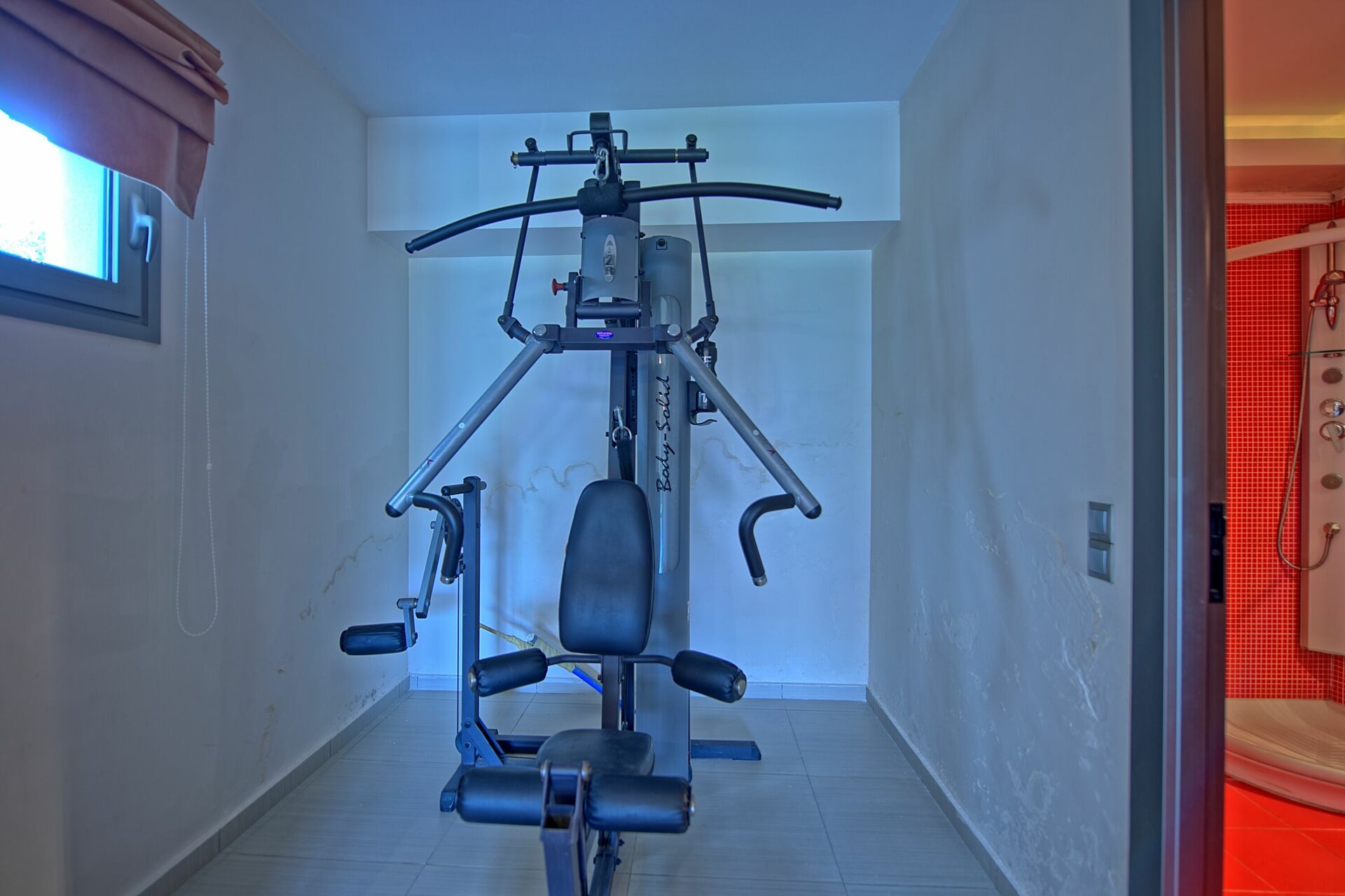 Ground floor: living room (satellite TV) and gym corner (treadmill, weight machine); double bedroom; bathroom with shower (no window); room with washing machine.