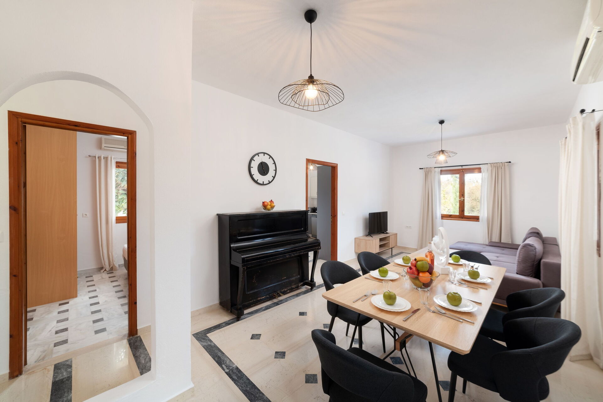 Ground floor: living room (air conditioning, tv) with dining area, kitchen (cooktop, oven, freezer, refrigerator, dishwasher, coffee machine, toaster), double bedroom (air conditioning) with bathroom with shower, bedroom with two single beds (air conditioning), bathroom with shower, double bedroom (air conditioning).