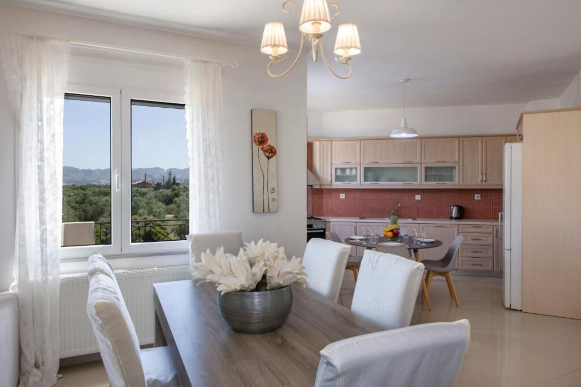Distances: Kounoupidiana (shops of all kinds) 5 km, Kalatas (beach) 5 km, Chania airport 3 km, Stavros (beach) 8 km, Seitan Limania (beach) 10 km, Chania (shops, old Venetian harbor) 12 km, Suda (harbor) 14 km, Rethimno 67 km.
