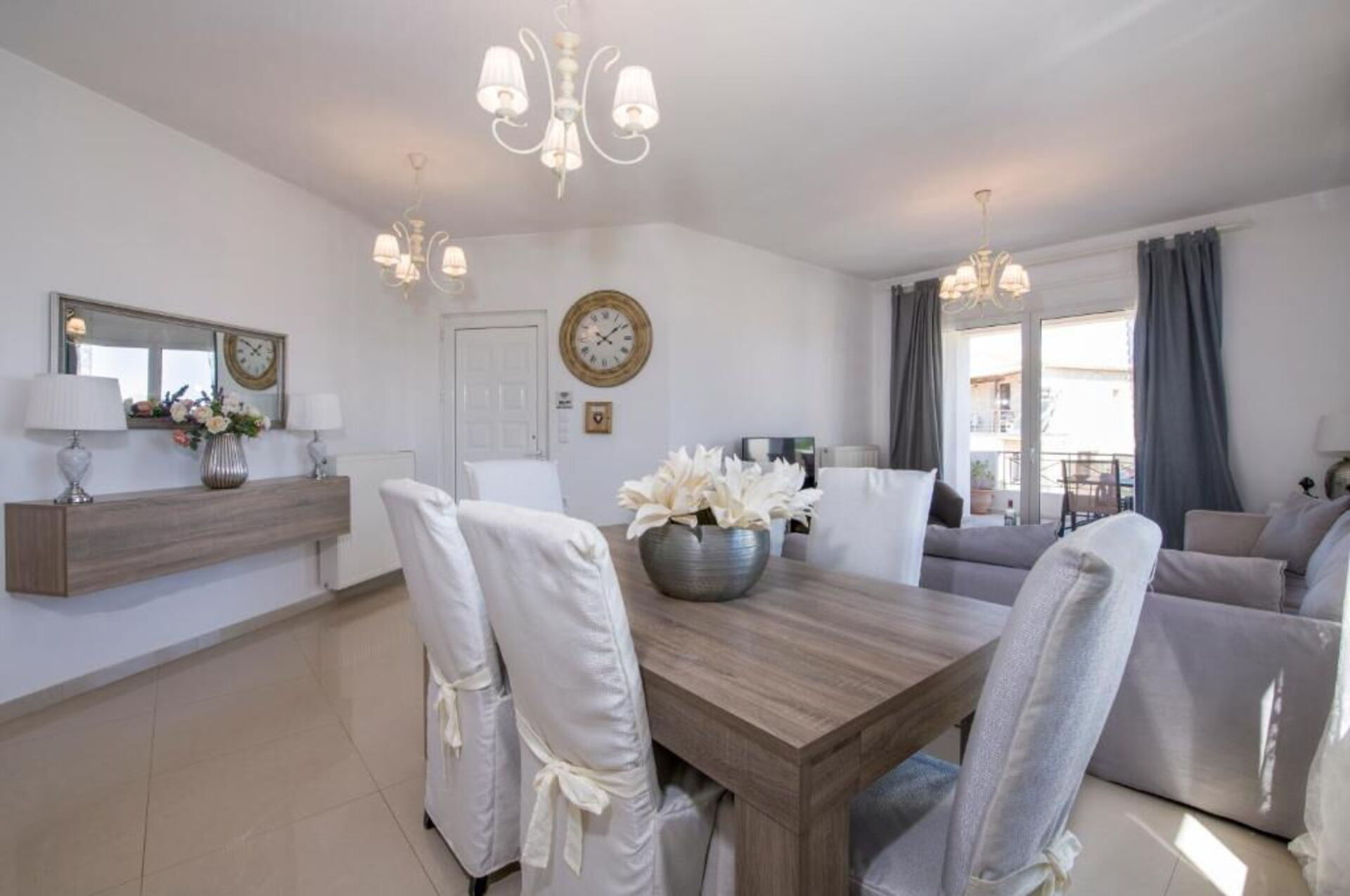 The bright living room has access to the terrace with an outdoor dining area furnished with a table and chairs.