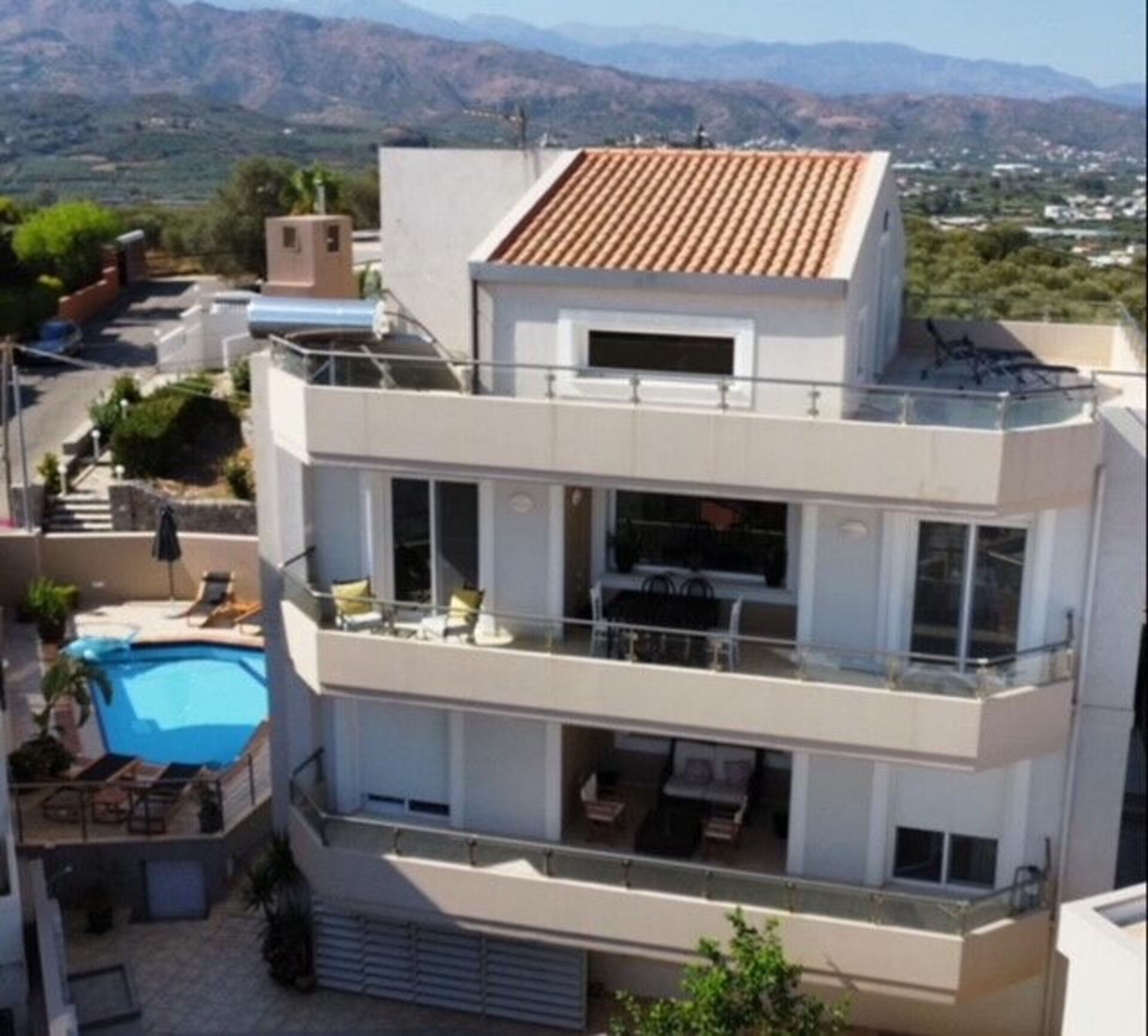 Vacation rental with panoramic views and a private pool in Crete, close to the sea and the beaches of Chania and Agios Apostoli.