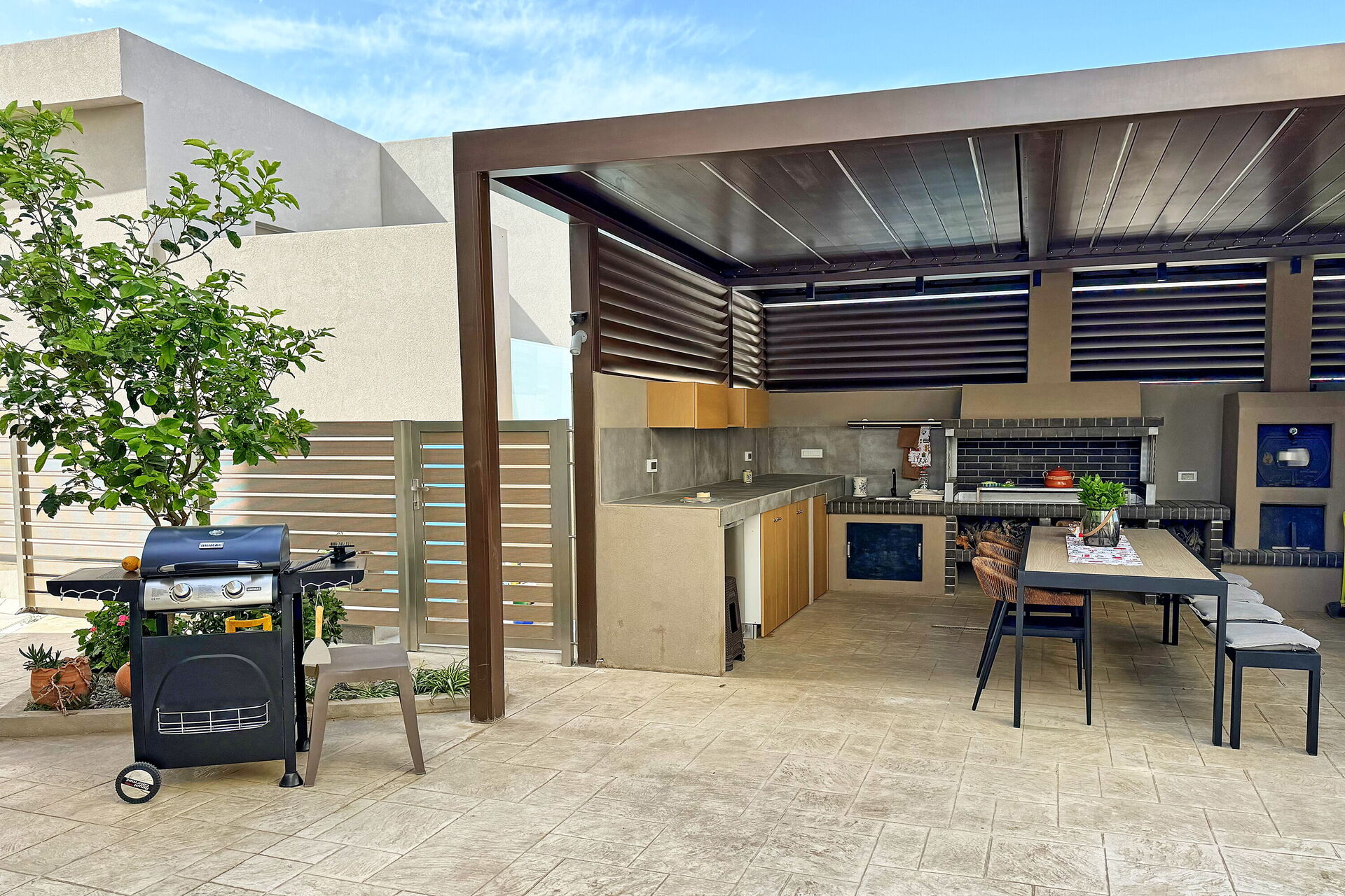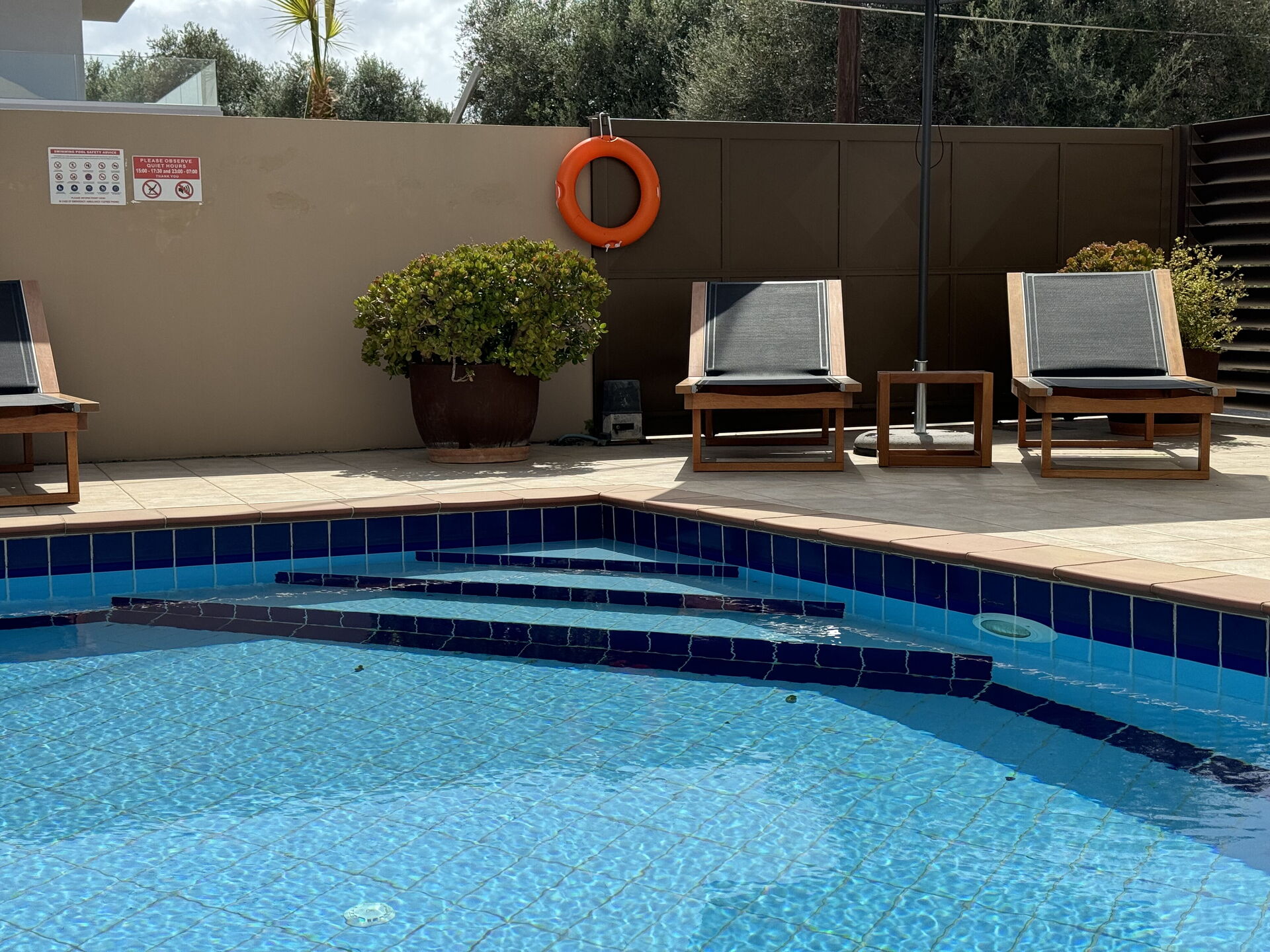 The pool looks great, sunbeds are there, and there is also a barbecue with a terrace that looks cool.