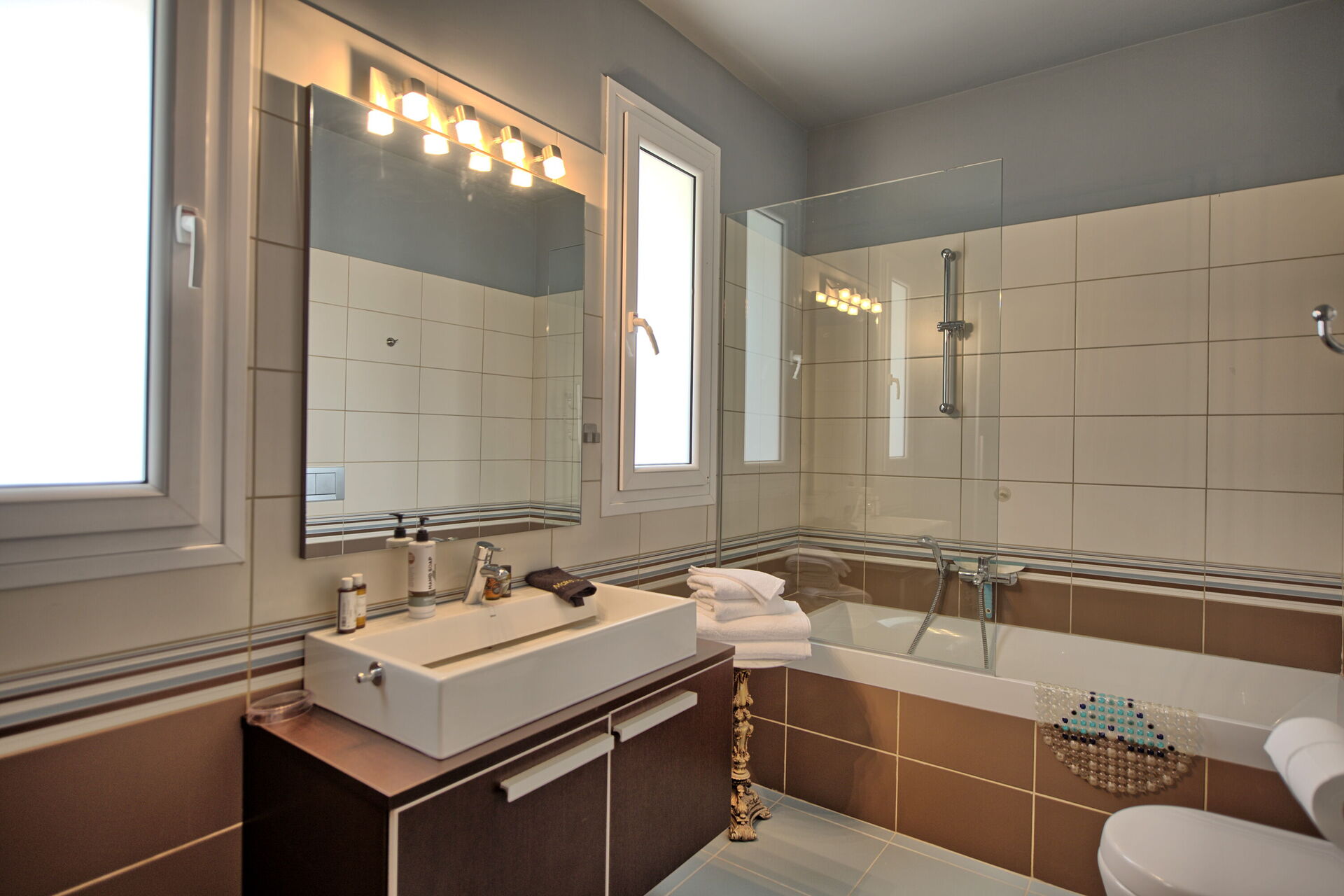 Ground floor: bedroom (queen size bed: 160cm x 200cm) with a private bathroom with bathtub, double bedroom (bed: 160cm x 200cm), bathroom with shower, laundry room with washing machine.
