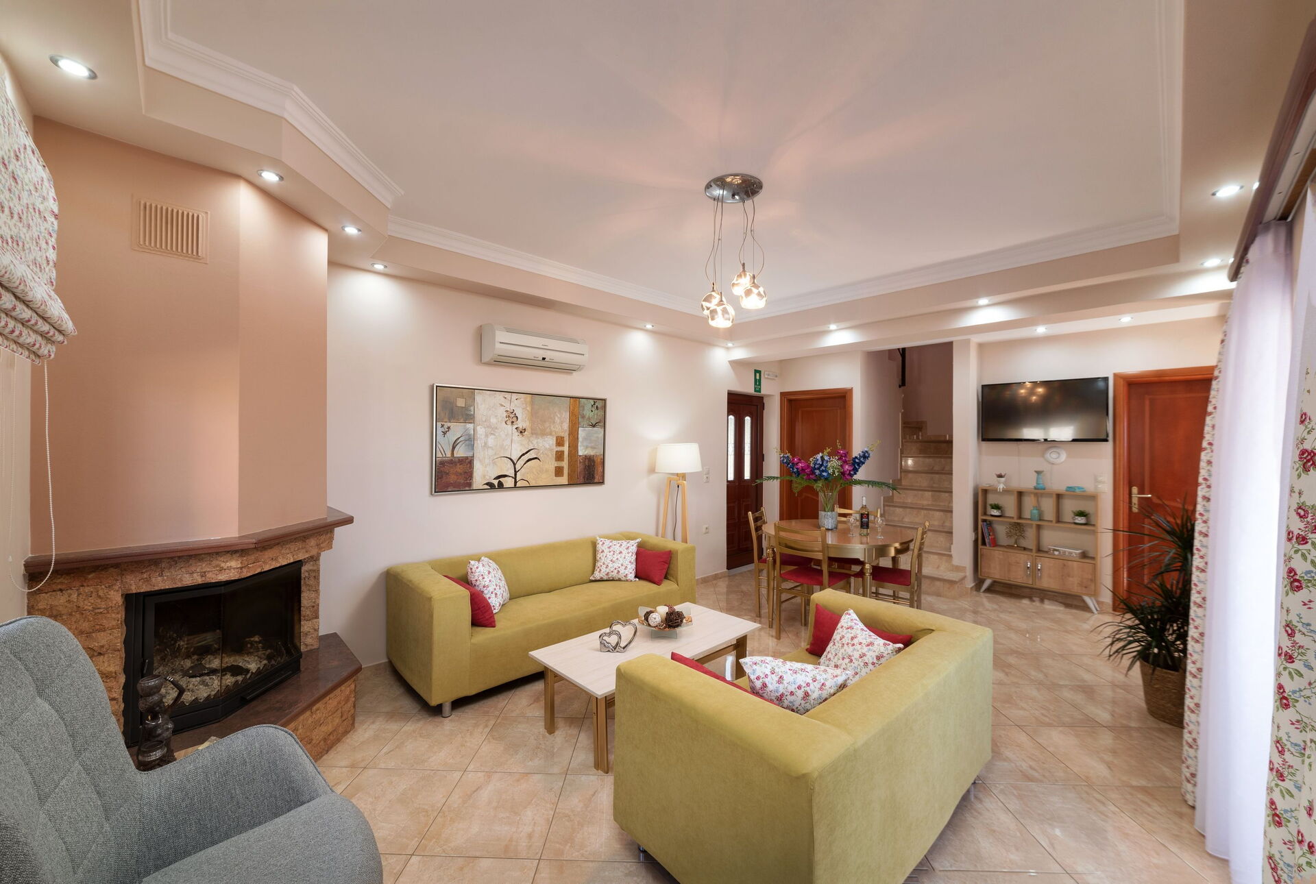 Ground floor: living room (air conditioning) with dining area, fireplace and kitchen corner (oven, dishwasher, freezer, microwave, electric kettle, toaster); access to furnished terrace with panoramic views.