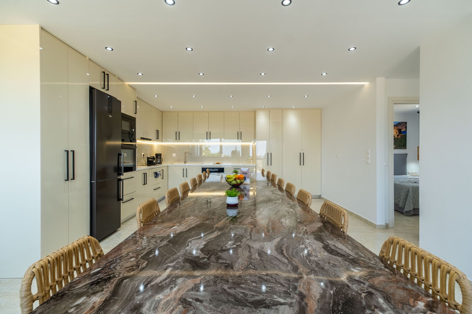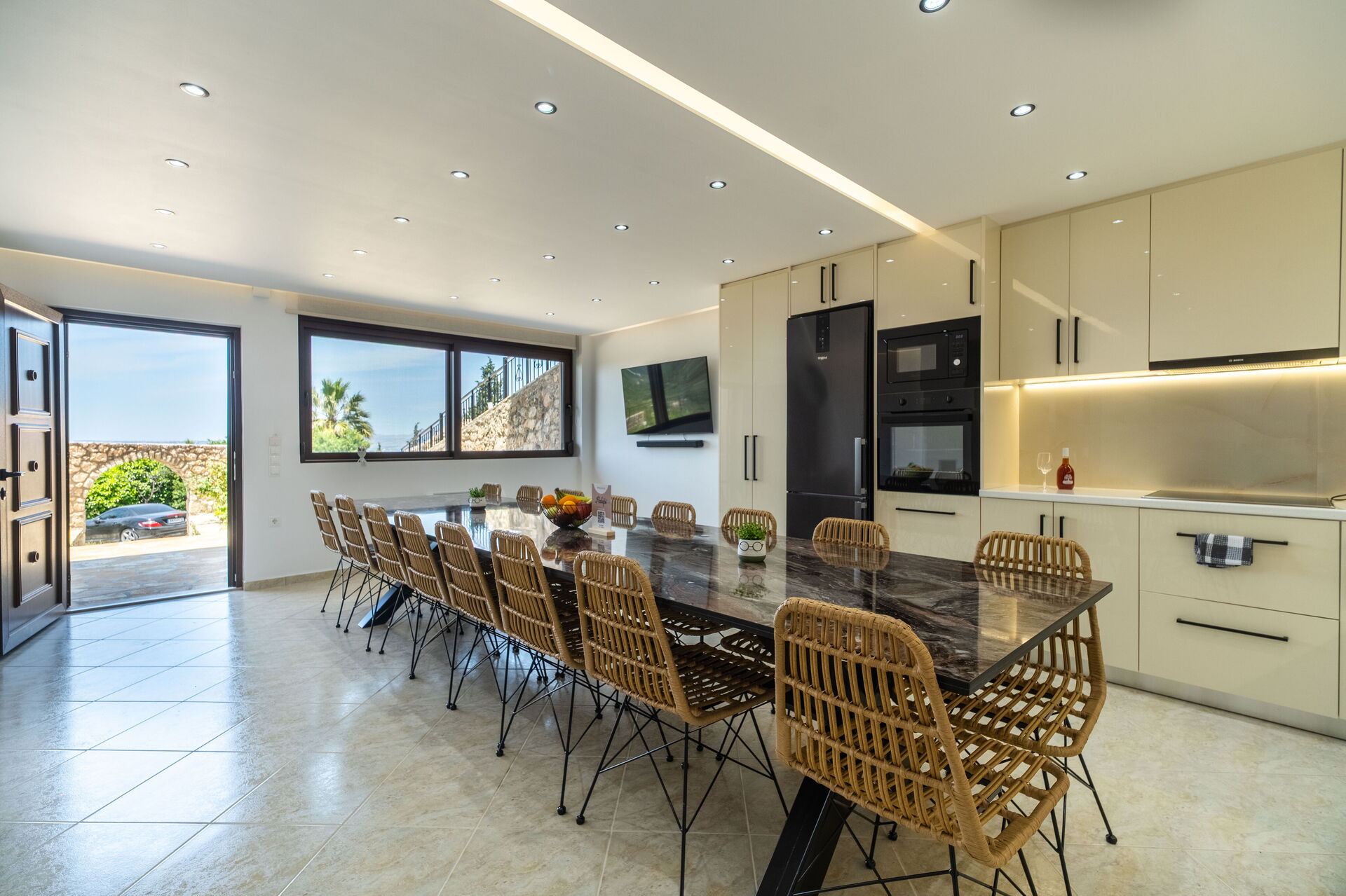 Ground floor: large dining room( air conditioning, table for 18 guests) and big kitchen ( oven, dishwasher, fridge), 2 double bedrooms