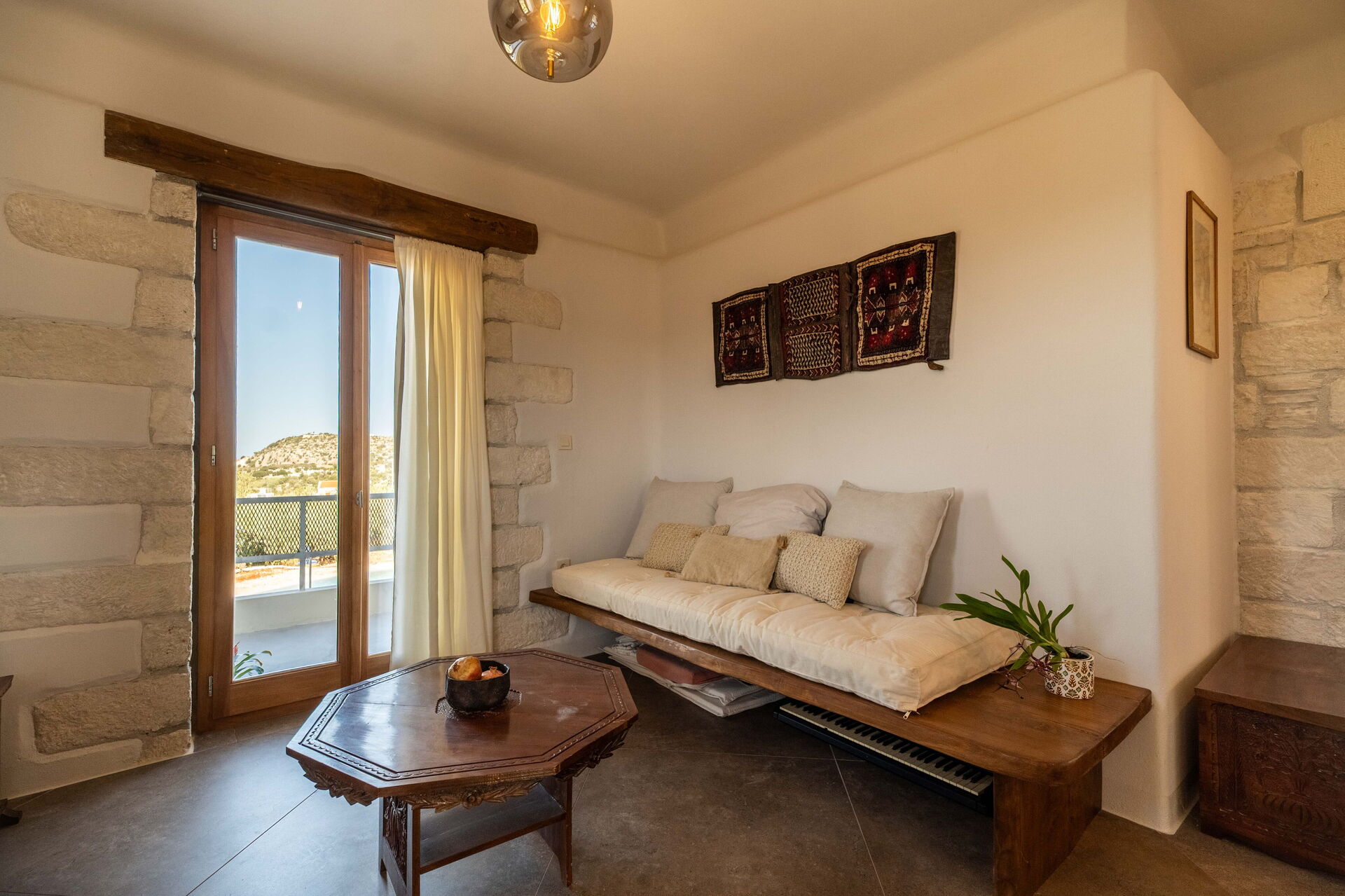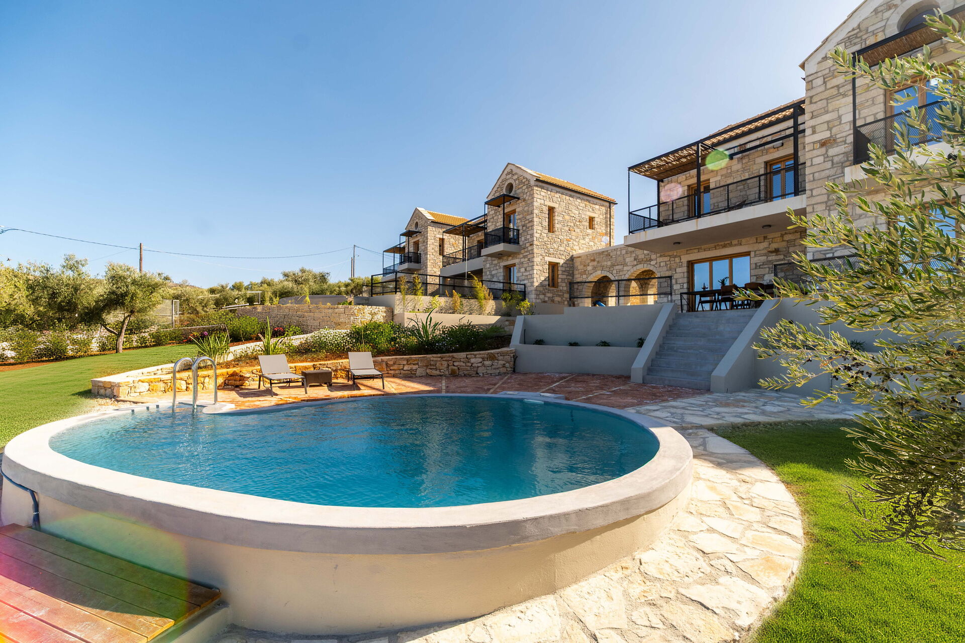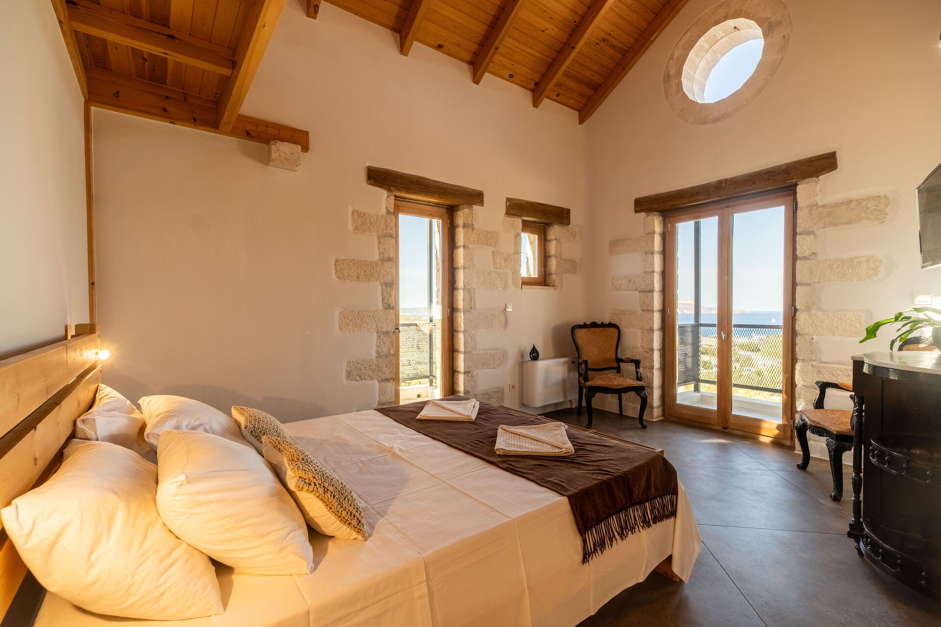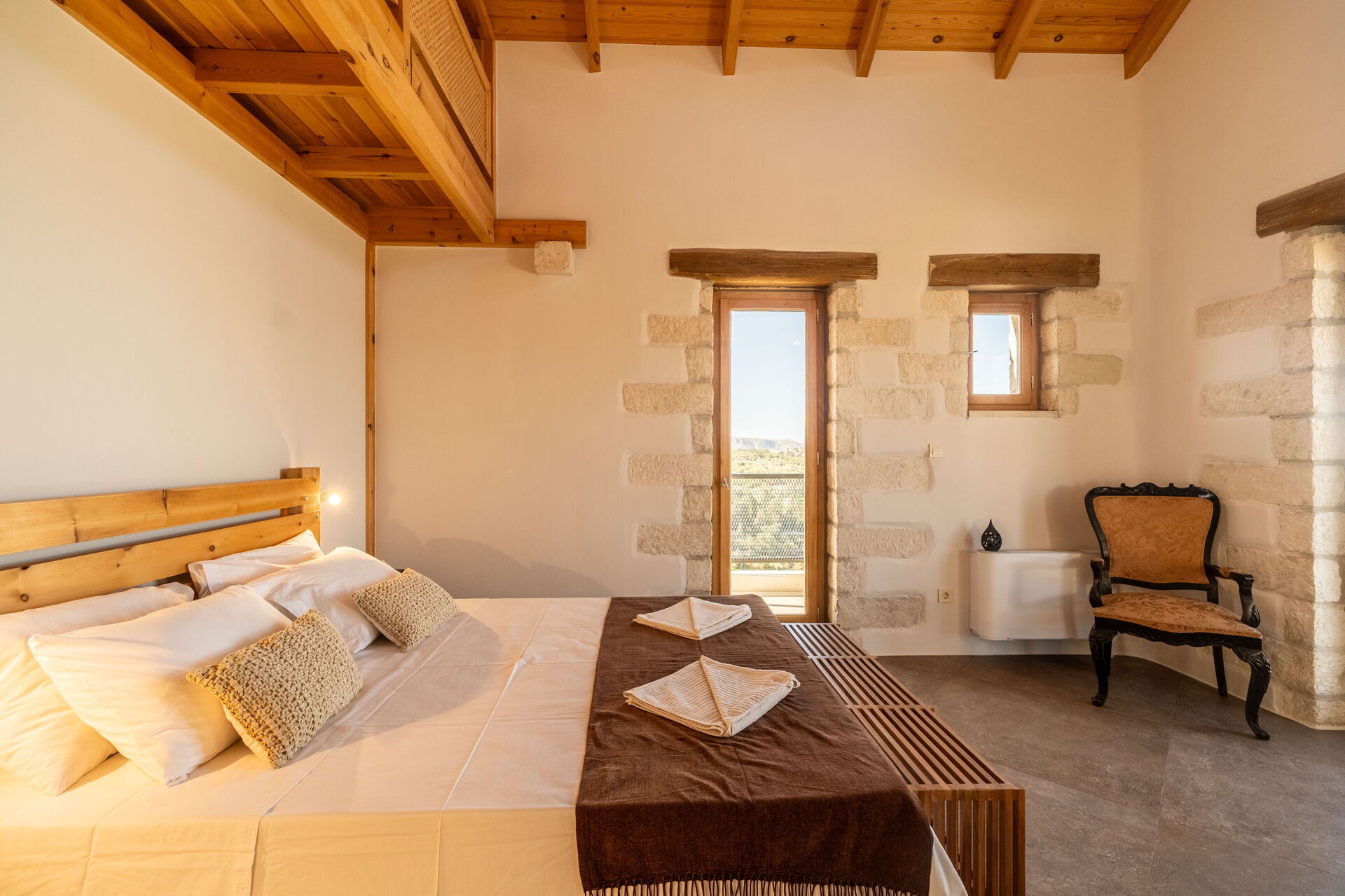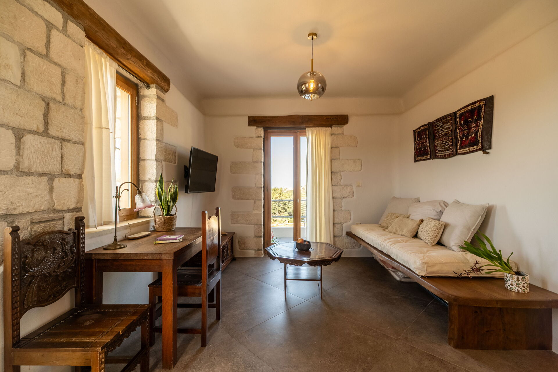 On the grounds, there is an area furnished with a barbecue and outdoor dining table, and a private pool where you can cool off on summer days and enjoy the peace and tranquility of the countryside; splendid panoramic views of Crete’s crystal clear sea are the icing on the cake.