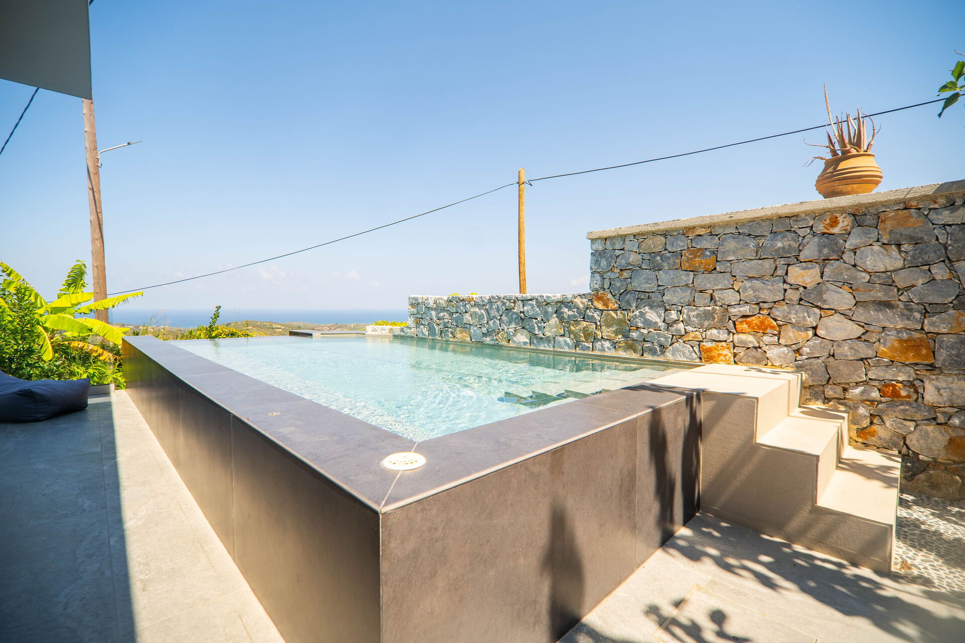 On the grounds of Villa Katrina there is a garden and an outdoor dining area with a table and barbecue. On sunny summer days, cool off in the private pool with a whirlpool corner (heatable upon request); enjoy fantastic sunsets and splendid vistas of the surrounding countryside reaching all the way to the sea.