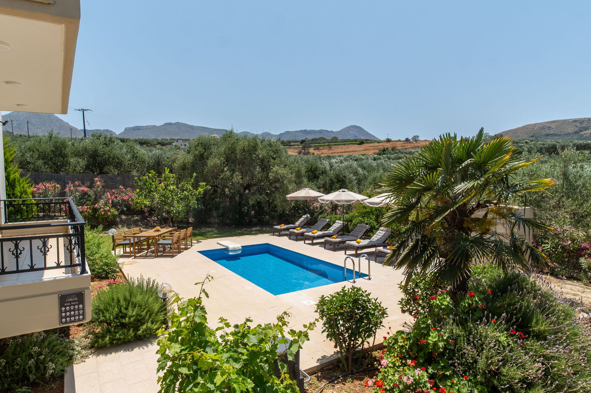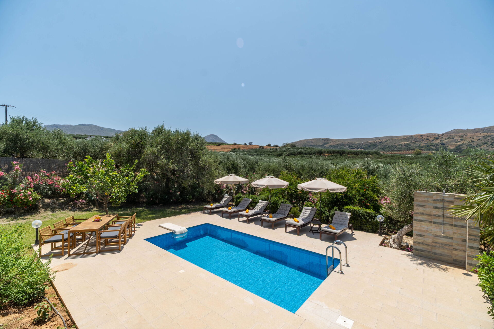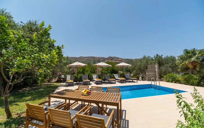 The grounds surrounding the house have a well-tended garden and various scenic terraces. One has an outdoor dining area, and a beautiful pool with a sunbathing area, sun loungers and tables. It is the perfect place to relax under the Cretan sun and cool off with friends or family while enjoying views of the sea and surrounding hills.