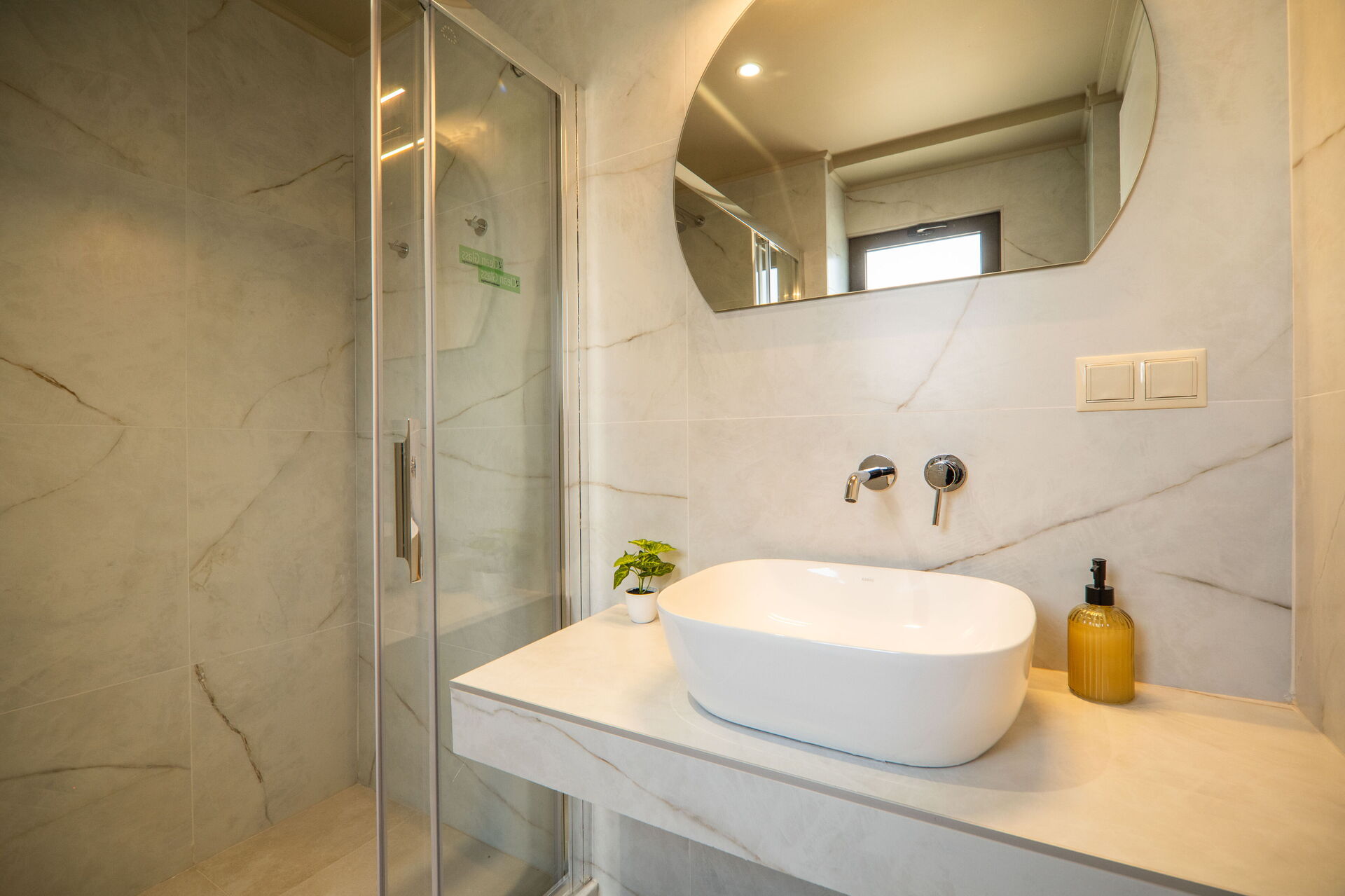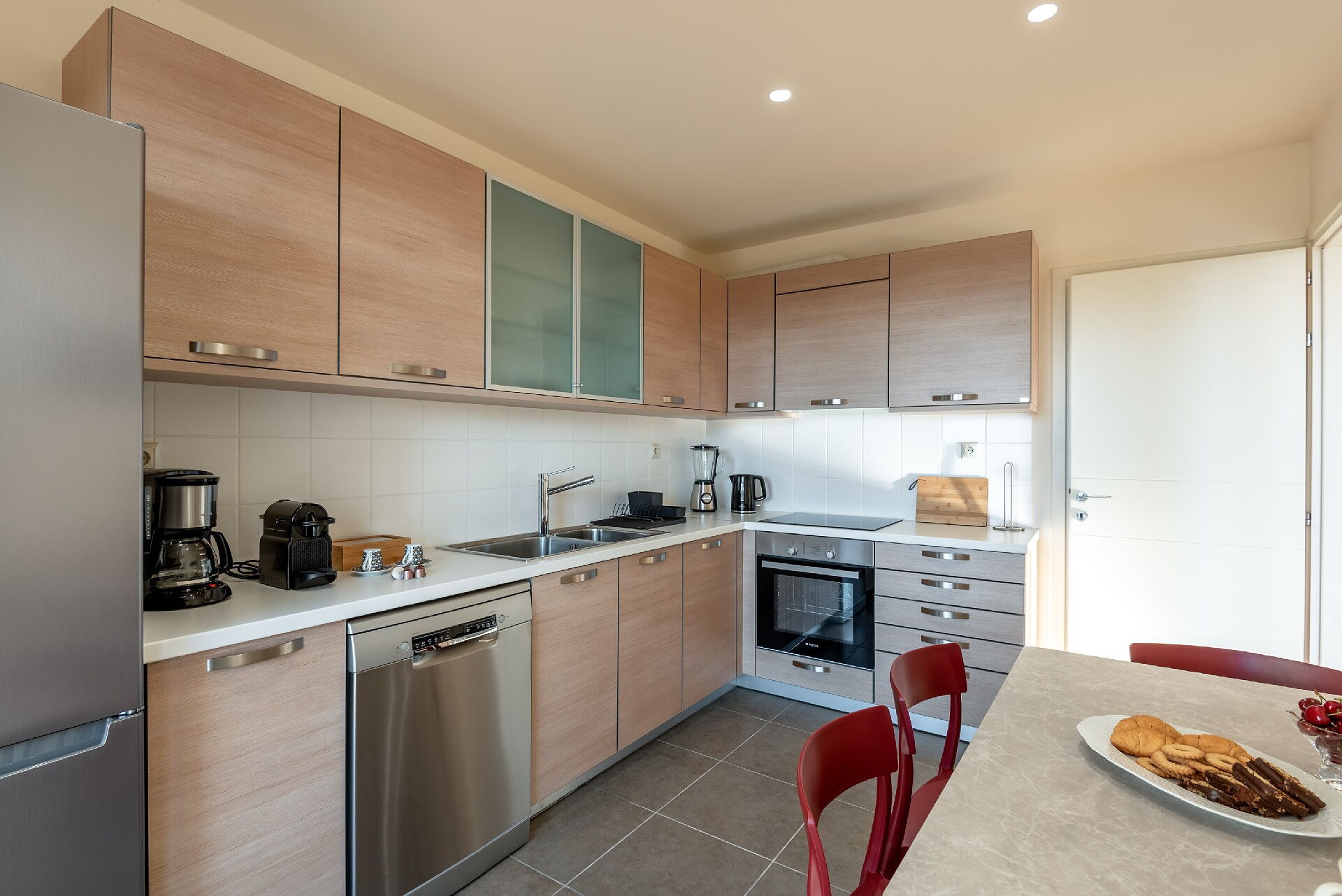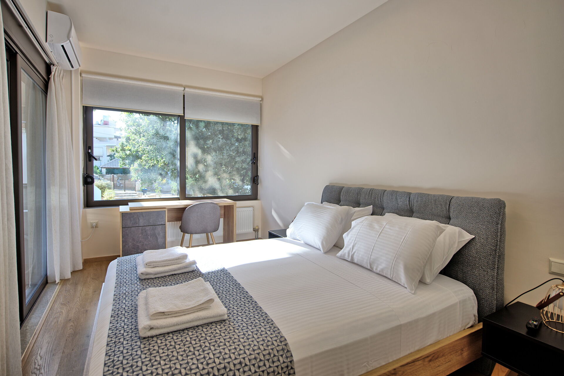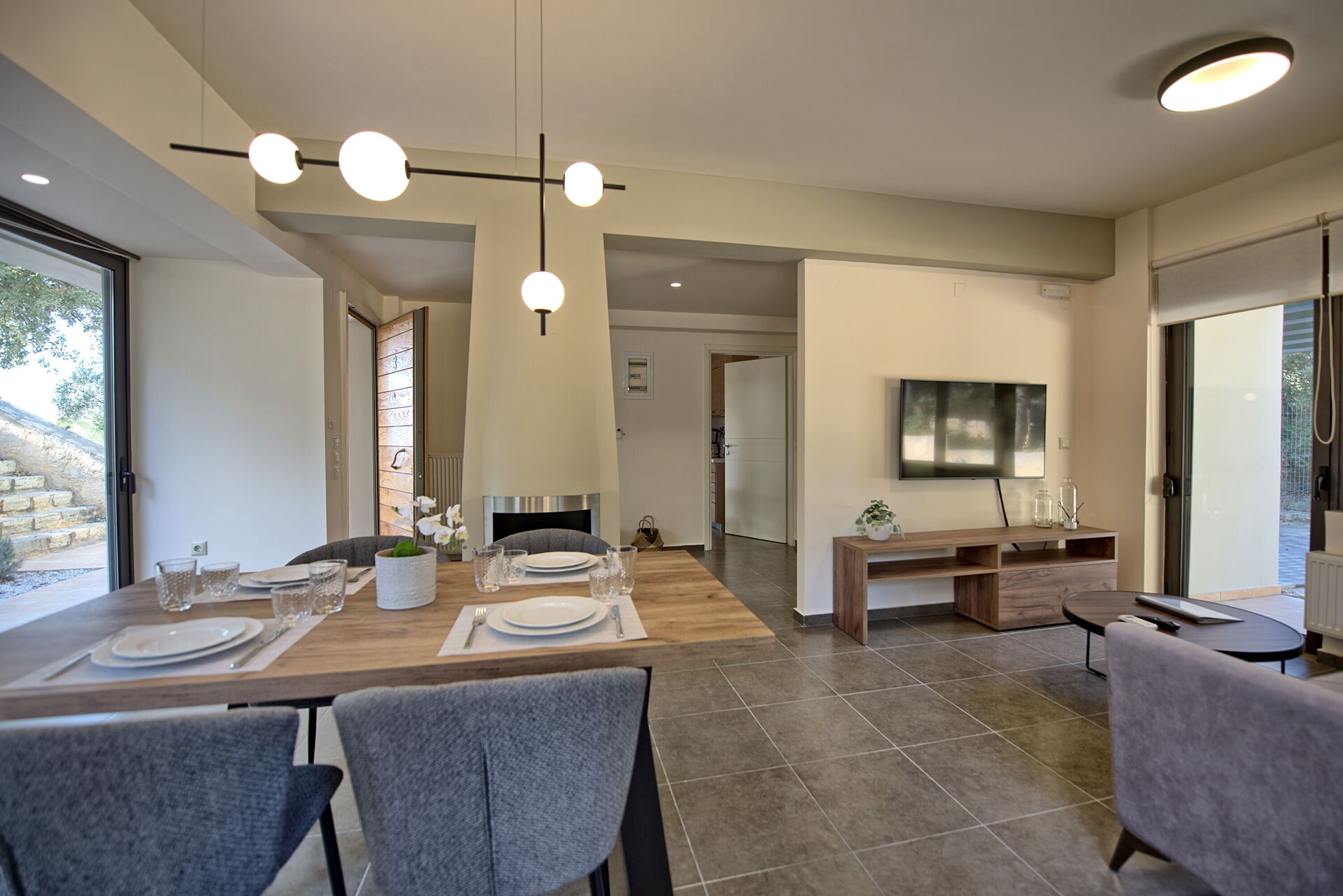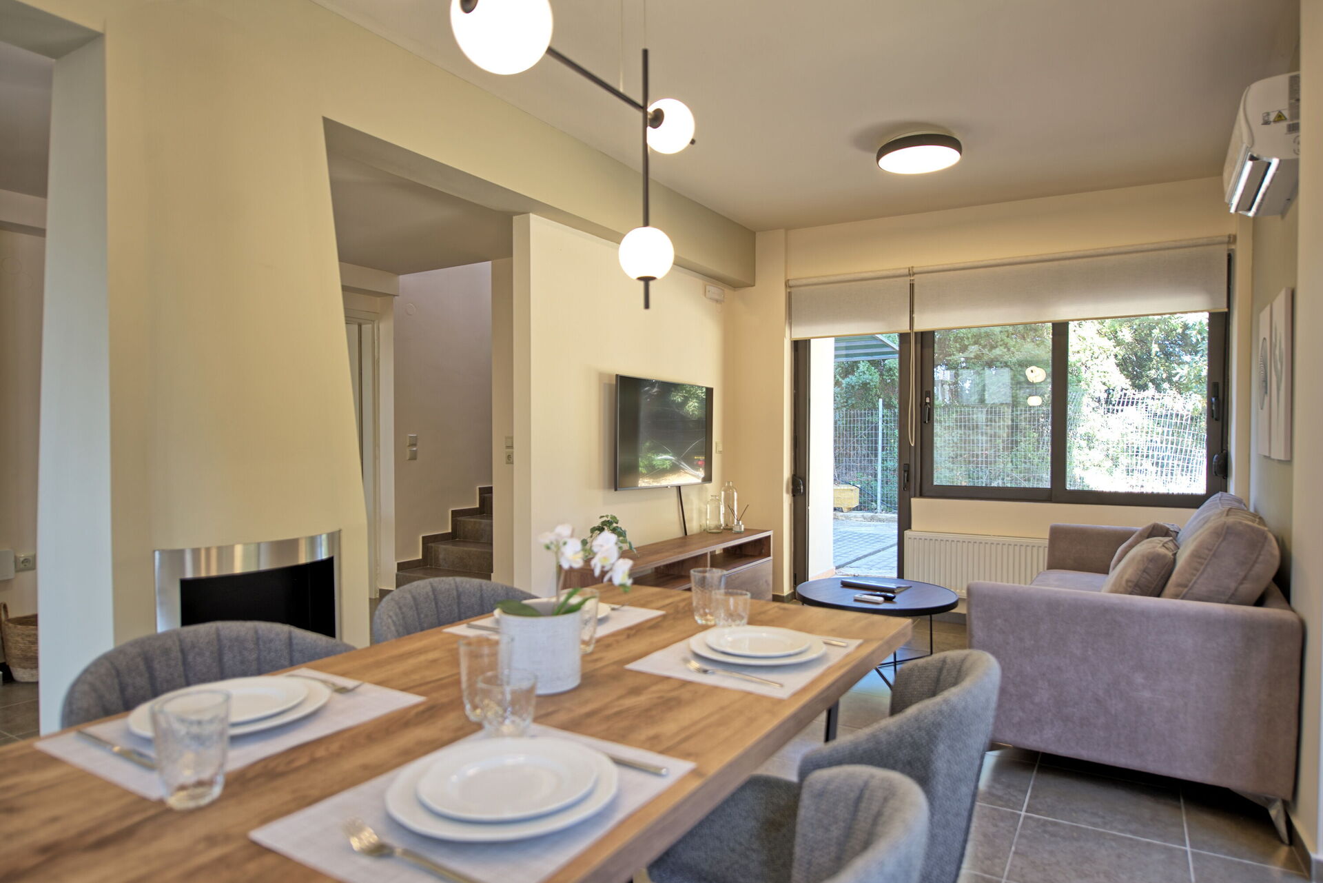 The marvelous villa rental is part of a complex of 4 sister houses, all of them featured in our website (Dioni, Phaedra, Iris e Aelia). The beautiful, 3-level share of a villa offers 2 bedrooms and a room with a sofa bed, to accommodate up to 5 people. This ultra modern house features not only prestigious furniture but also plenty of light: the large windows make every room in the villa rental incredibly bright.