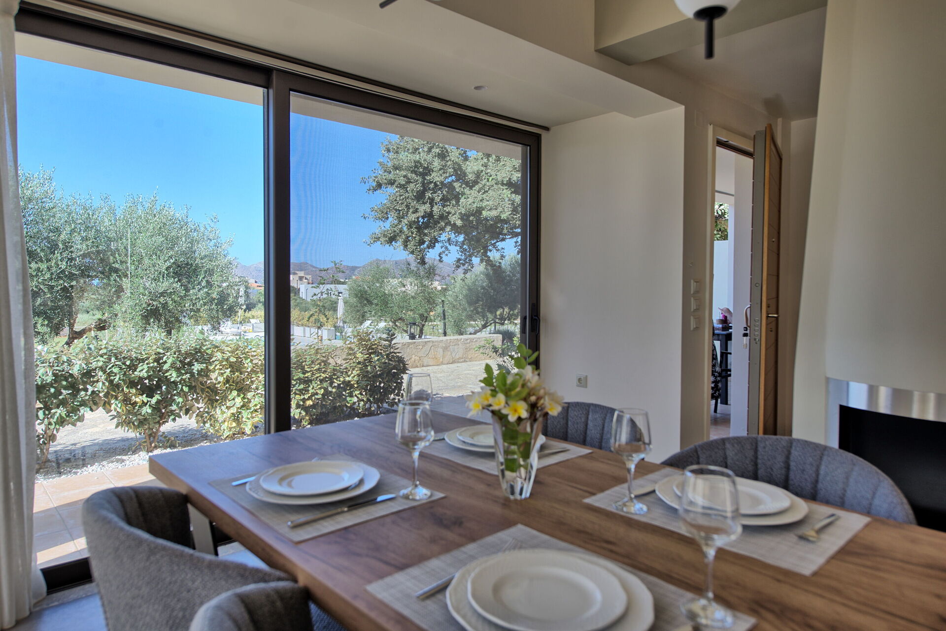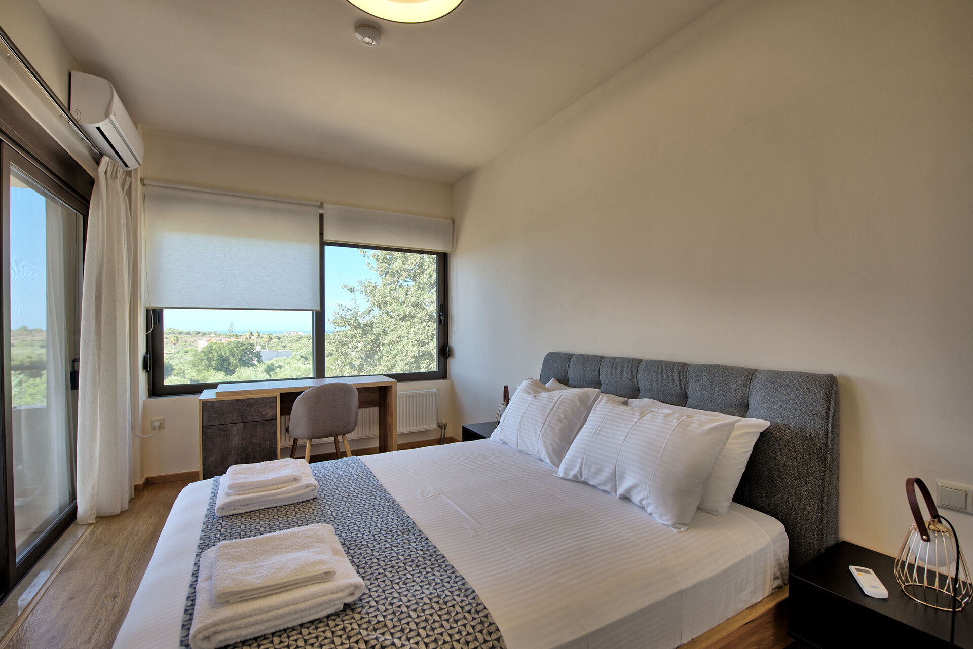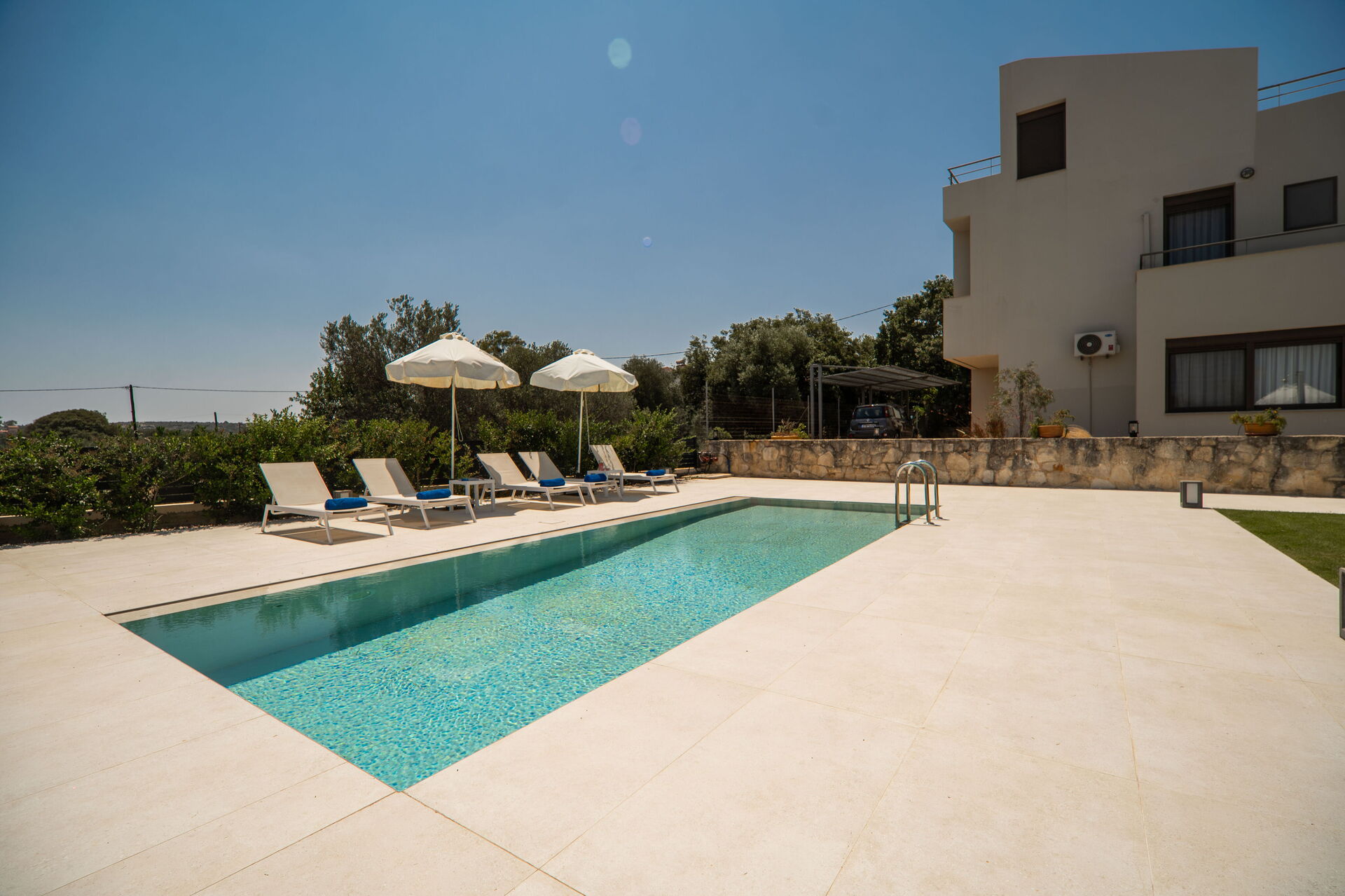 The marvelous villa rental is part of a complex of 4 sister houses, all of them featured in our website (Phaedra, Dioni, Iris e Aelia). The beautiful, 3-level share of a villa offers 2 bedrooms and a room with a sofa bed, to accommodate up to 5 people. This ultra modern house features not only prestigious furniture but also plenty of light: the large windows make every room in the villa rental incredibly bright.