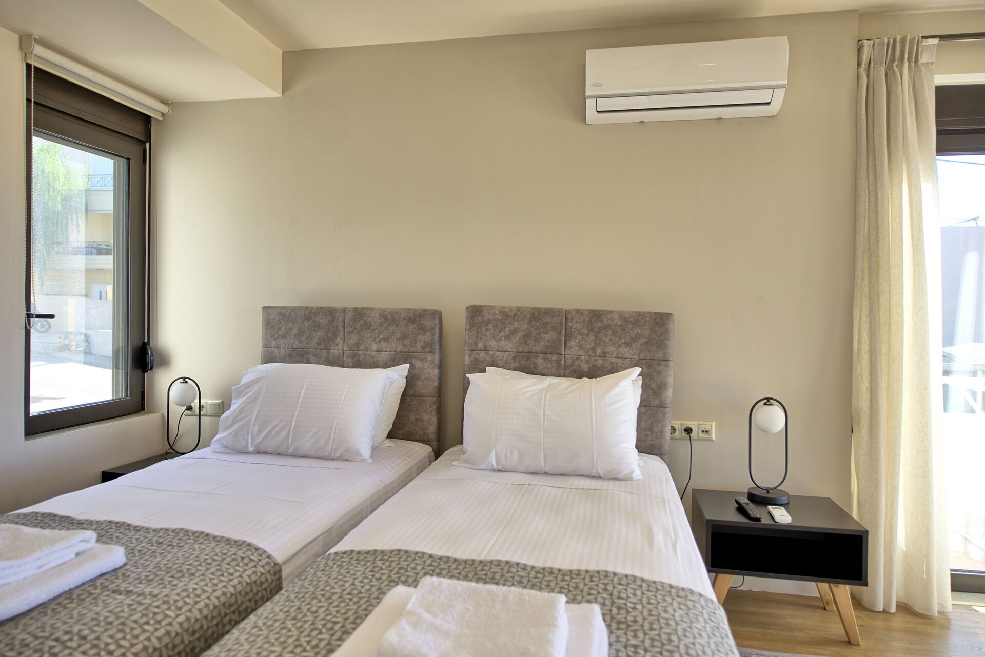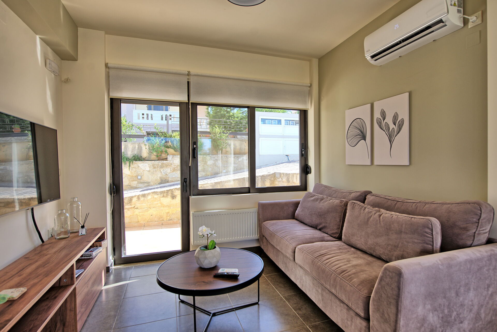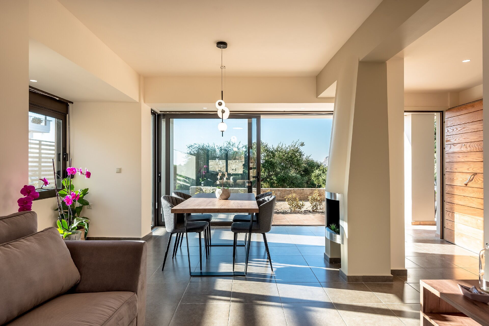 The marvelous villa rental is part of a complex of 4 sister houses, all of them featured in our website (Phaedra, Dioni, Iris e Aelia). The beautiful, 3-level share of a villa offers 2 bedrooms and a room with a sofa bed, to accommodate up to 5 people. This ultra modern house features not only prestigious furniture but also plenty of light: the large windows make every room in the villa rental incredibly bright.