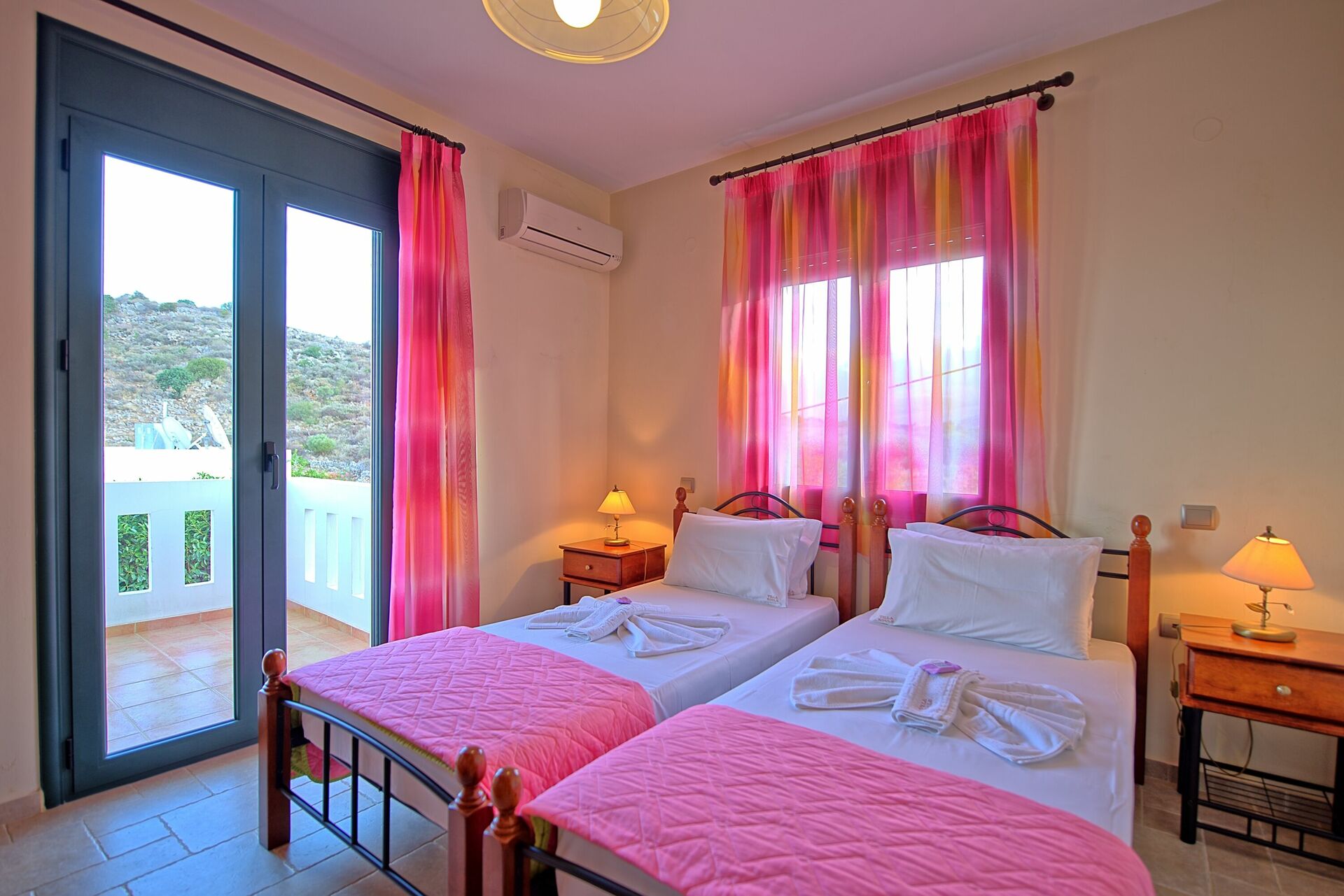 First floor: double bedroom (air conditioning and satellite TV) with access to terrace with panoramic views and furnished with loveseats; bedroom with 2 single beds (air conditioning) and access to balcony overlooking the pool; private bathroom with whirlpool tub and washing machine.