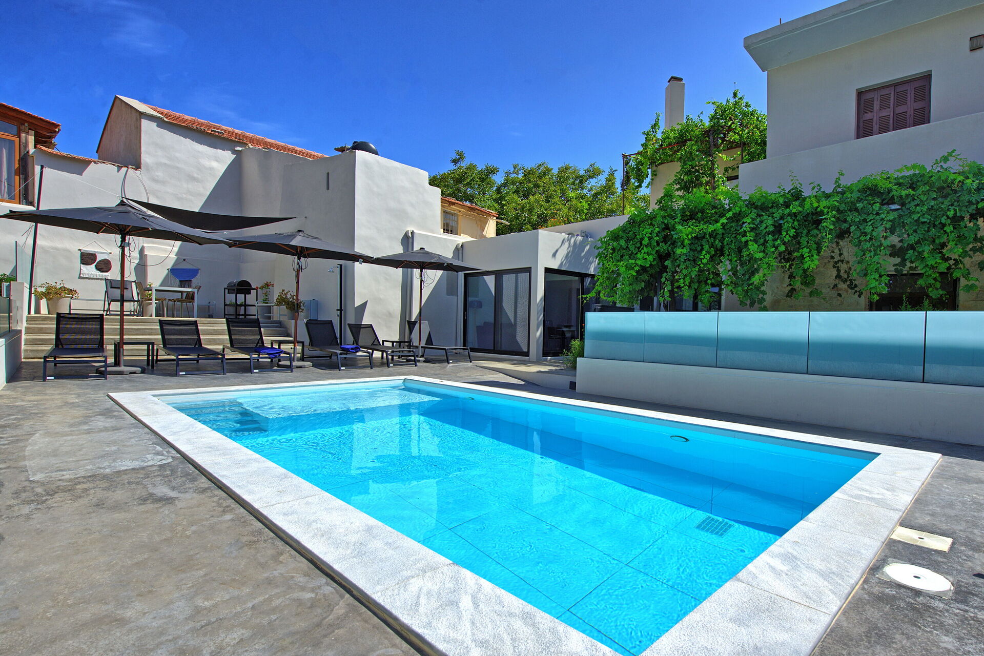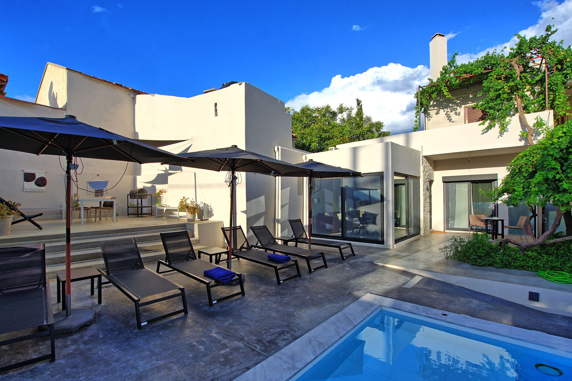One of Villa Casa Cafenio’s most distinctive features is its unique layout. Just a few steps from the entrance gate, guests will find a traditional Greek café and an excellent local taverna—perfect for lovers of authentic, locally sourced cuisine. Beyond the private gate, the atmosphere changes completely: guests are welcomed into a serene outdoor space featuring a raised patio shaded by a sail canopy, complete with barbecue and furniture for al fresco meals. The sun terrace and private swimming pool, reserved exclusively for guests, provide a rare luxury within a village centre.