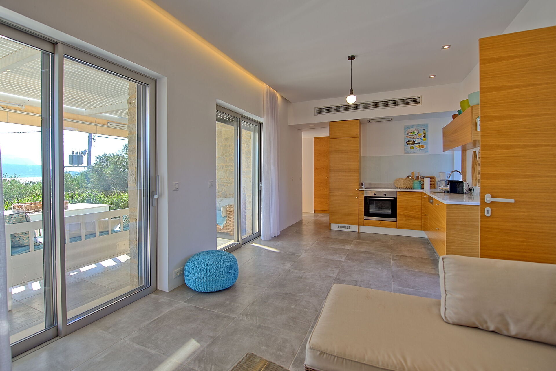 Ground floor: living room with dining area and kitchen corner (oven, refrigerator, freezer, dishwasher) and access to furnished outdoor area with panoramic sea views; double bedroom with private bathroom with shower; double bedroom with private bathroom with bathtub/shower.