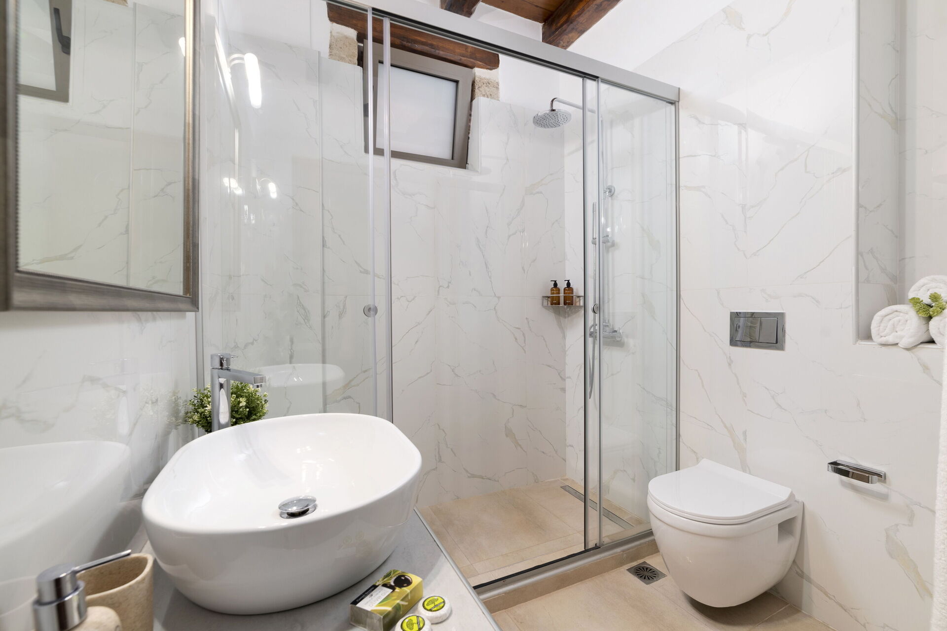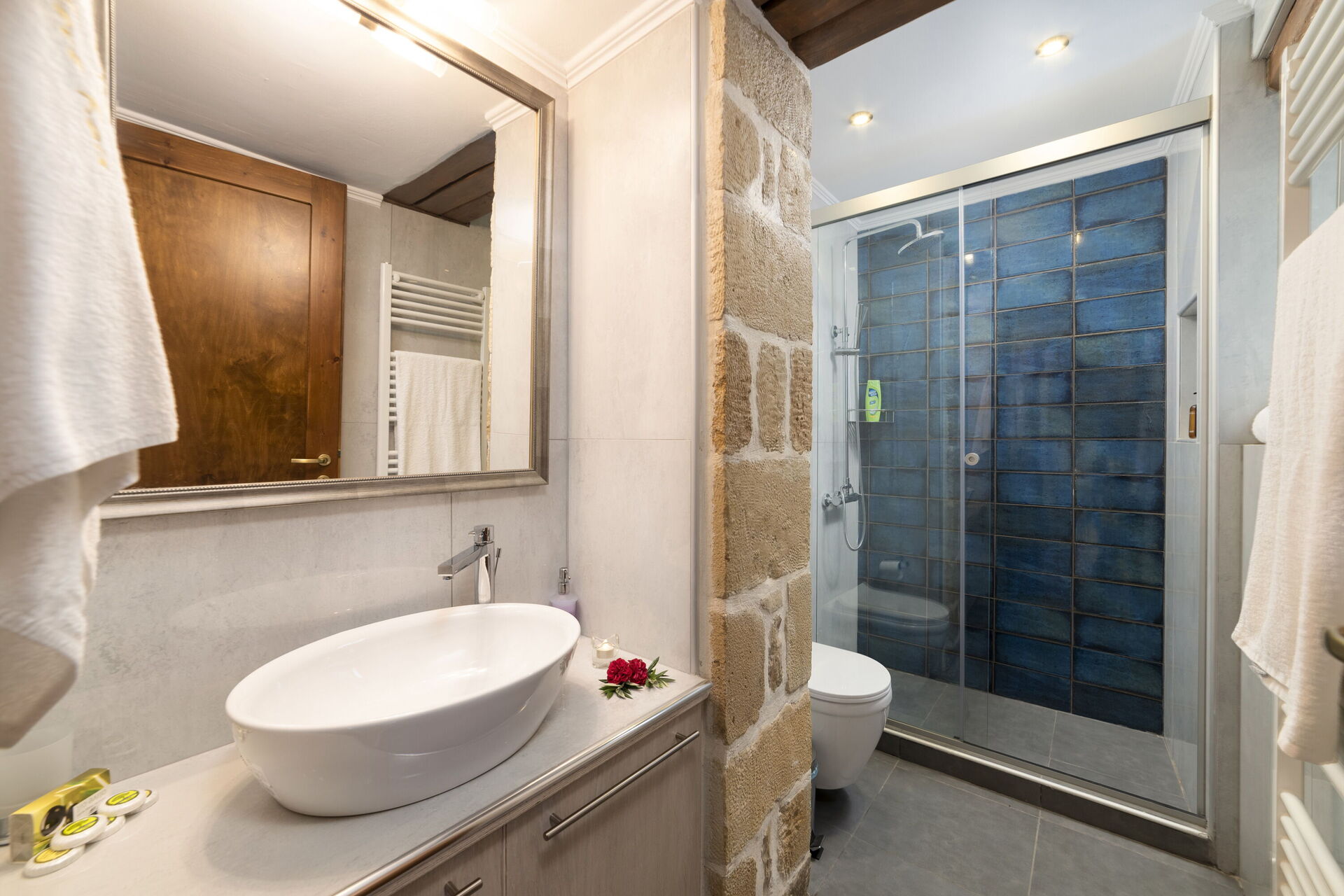 First floor: small kitchen (cooktop, refrigerator), double bedroom (air conditioning) with private bathroom with shower and access to large scenic terrace, 2 bedrooms each with 2 single beds (air conditioning) and access to a private balcony, bathroom with shower.