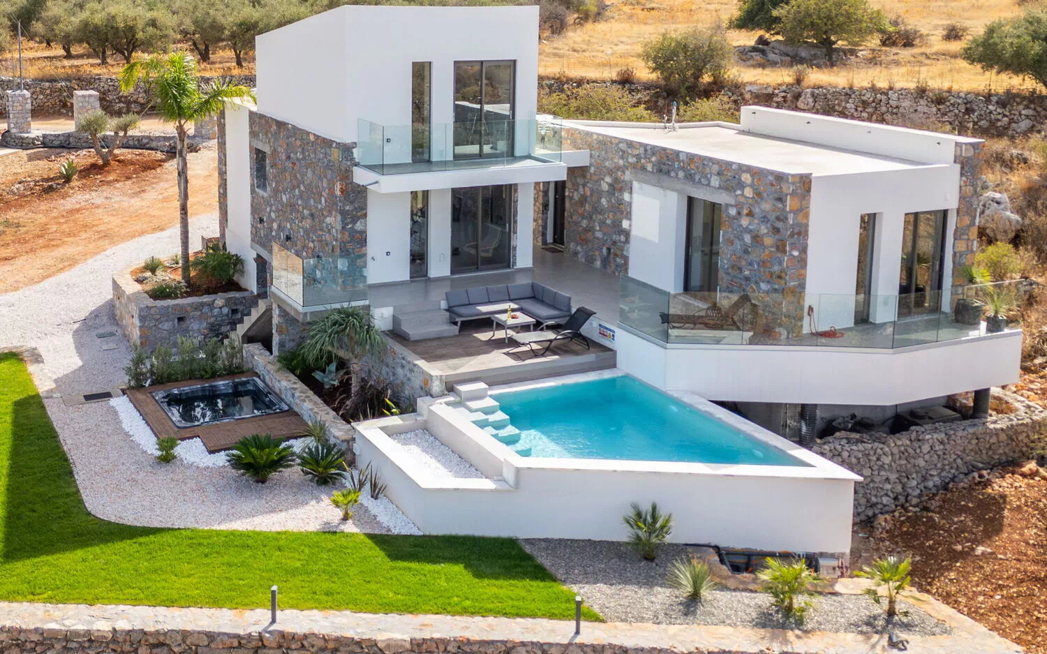 Beautiful villa with a private pool and outdoor hot tub, ideal for a vacation in Crete, Greece.