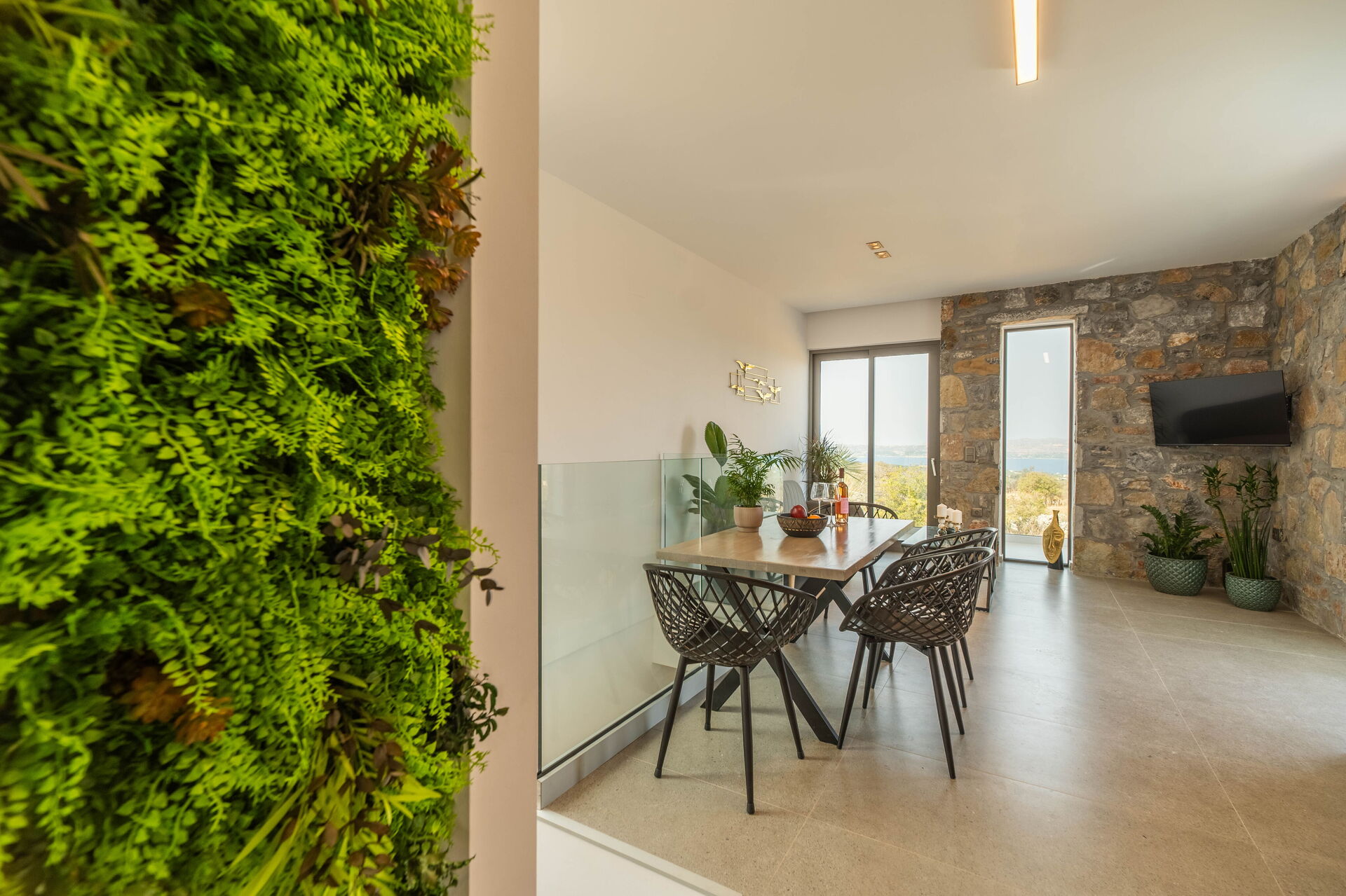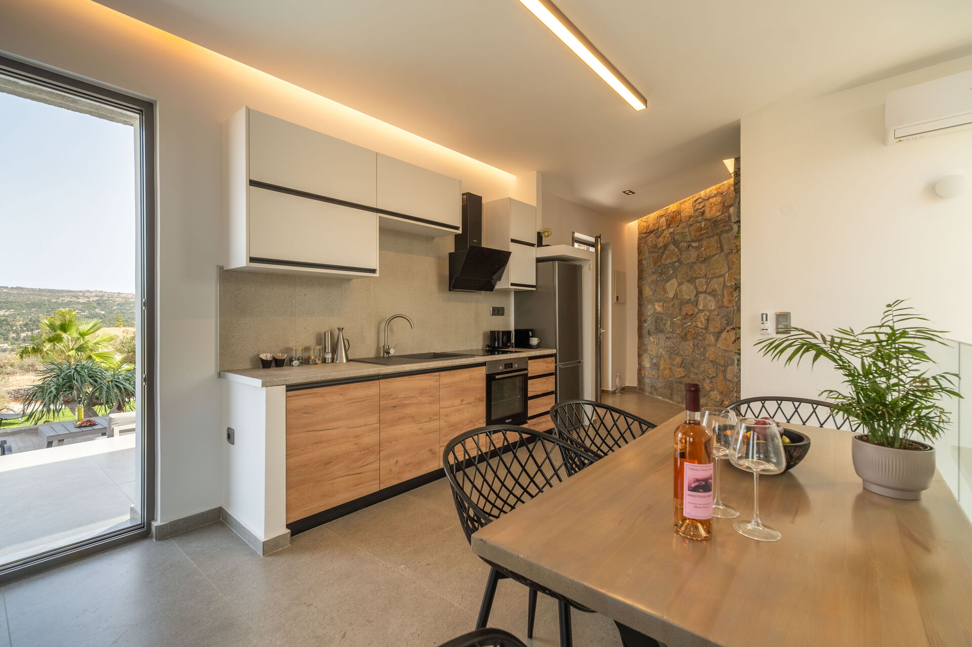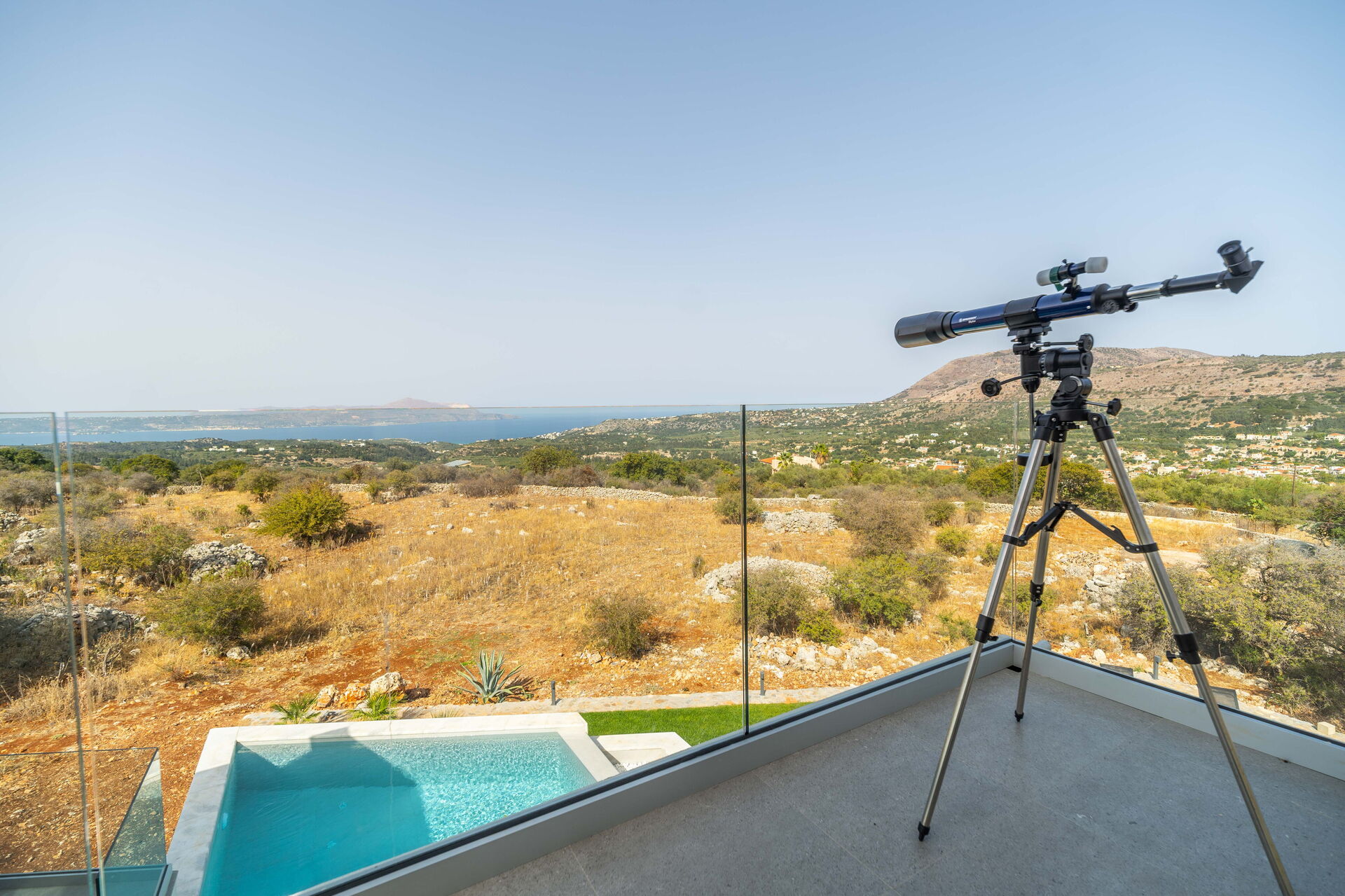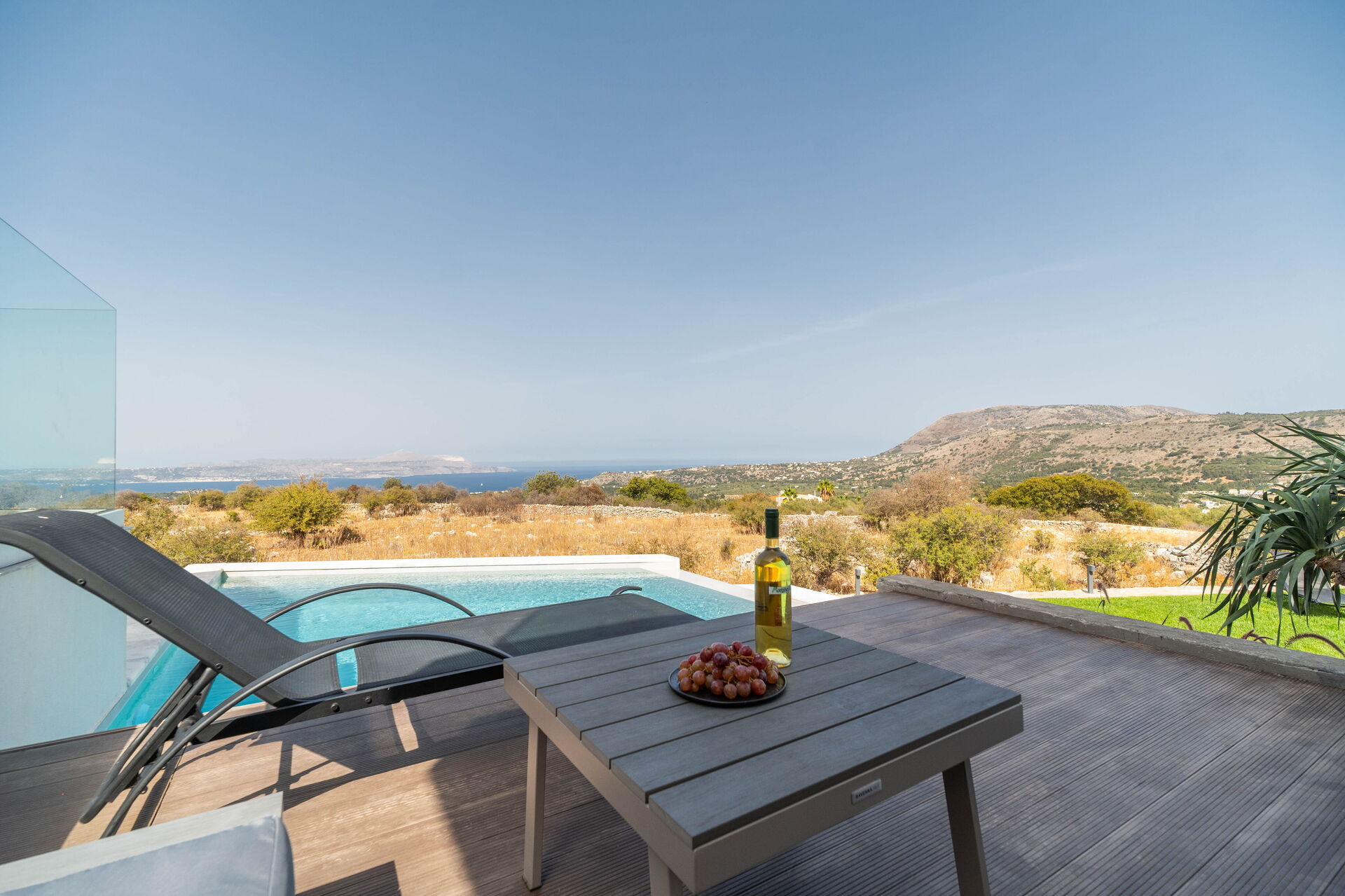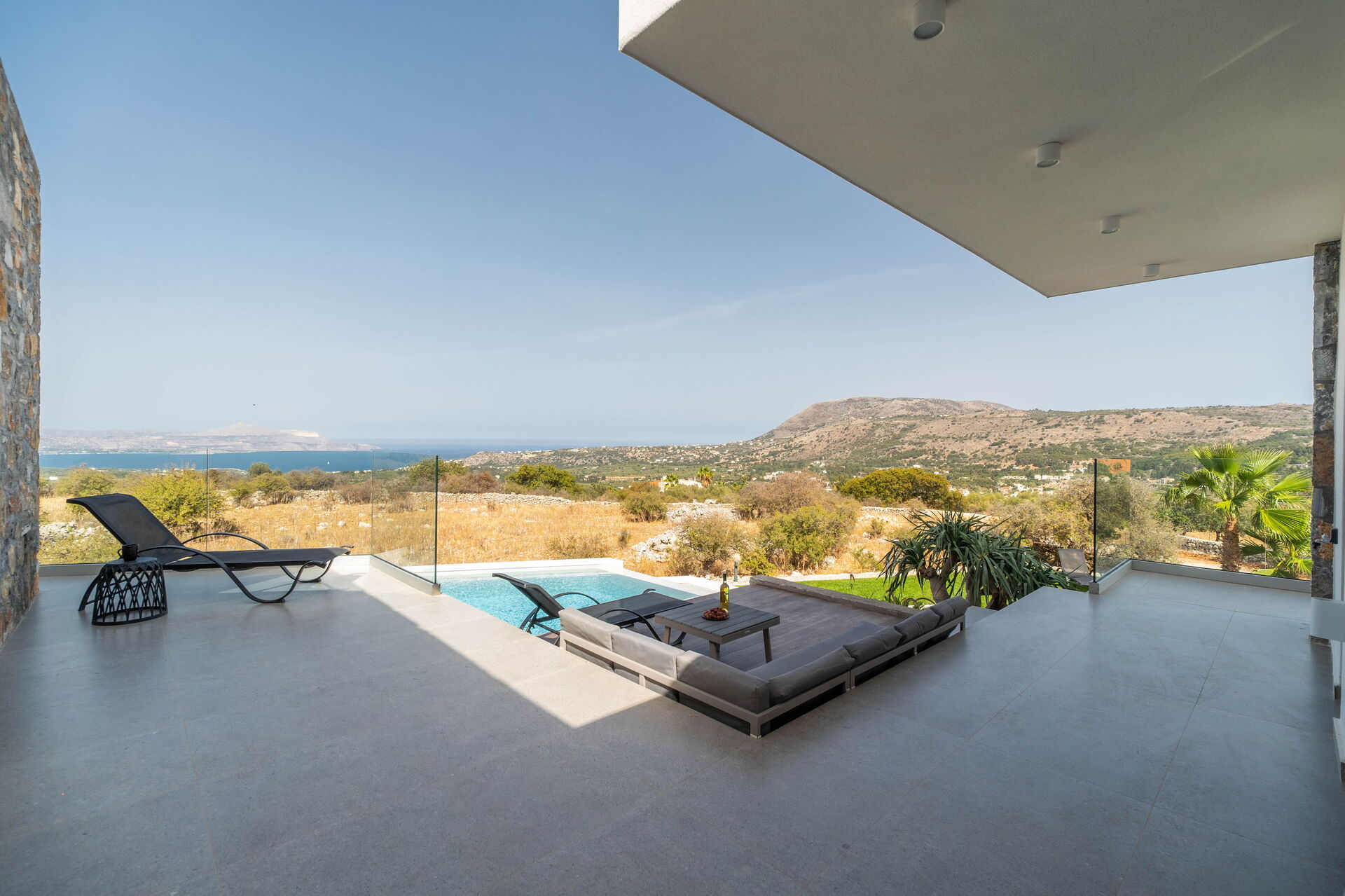 Outside there are a private pool with panoramic views, a hot tub, and a lovely outdoor dining area. The interiors are modern and very comfortable.