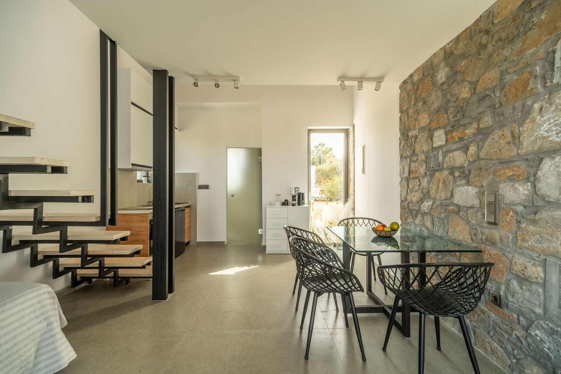 Ground floor: living room with single sofa bed and dining area with kitchen corner.