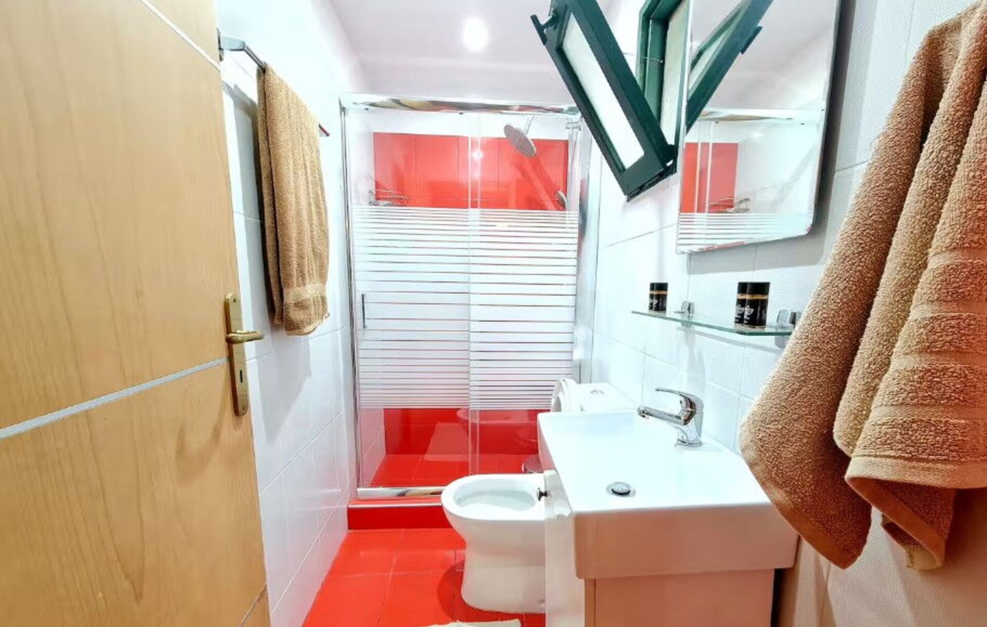 Ground floor: entrance and living room with TV, dining area and kitchen, double bedroom, bedroom with 2 single beds, bathroom with shower, double bedroom with private bathroom with shower.