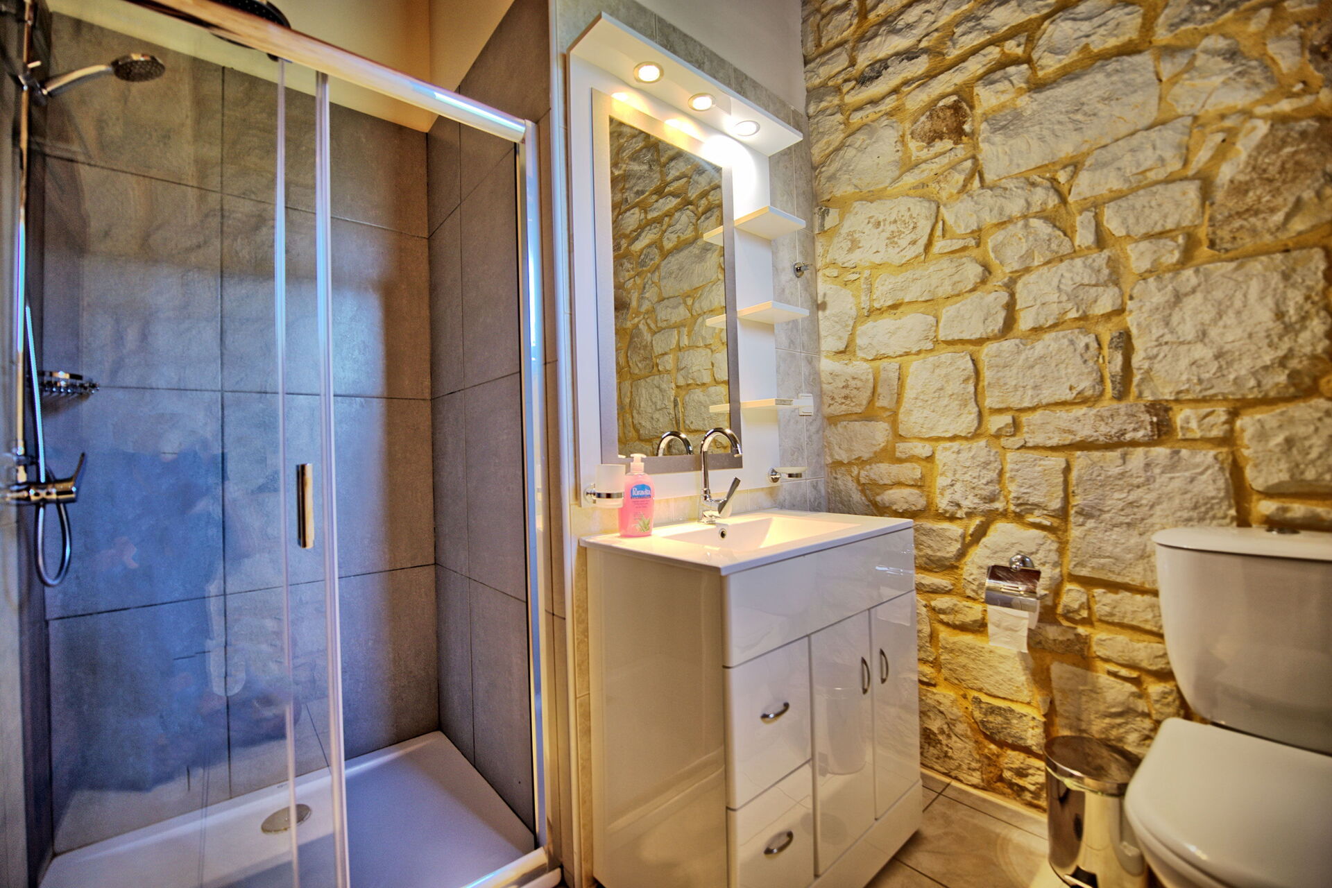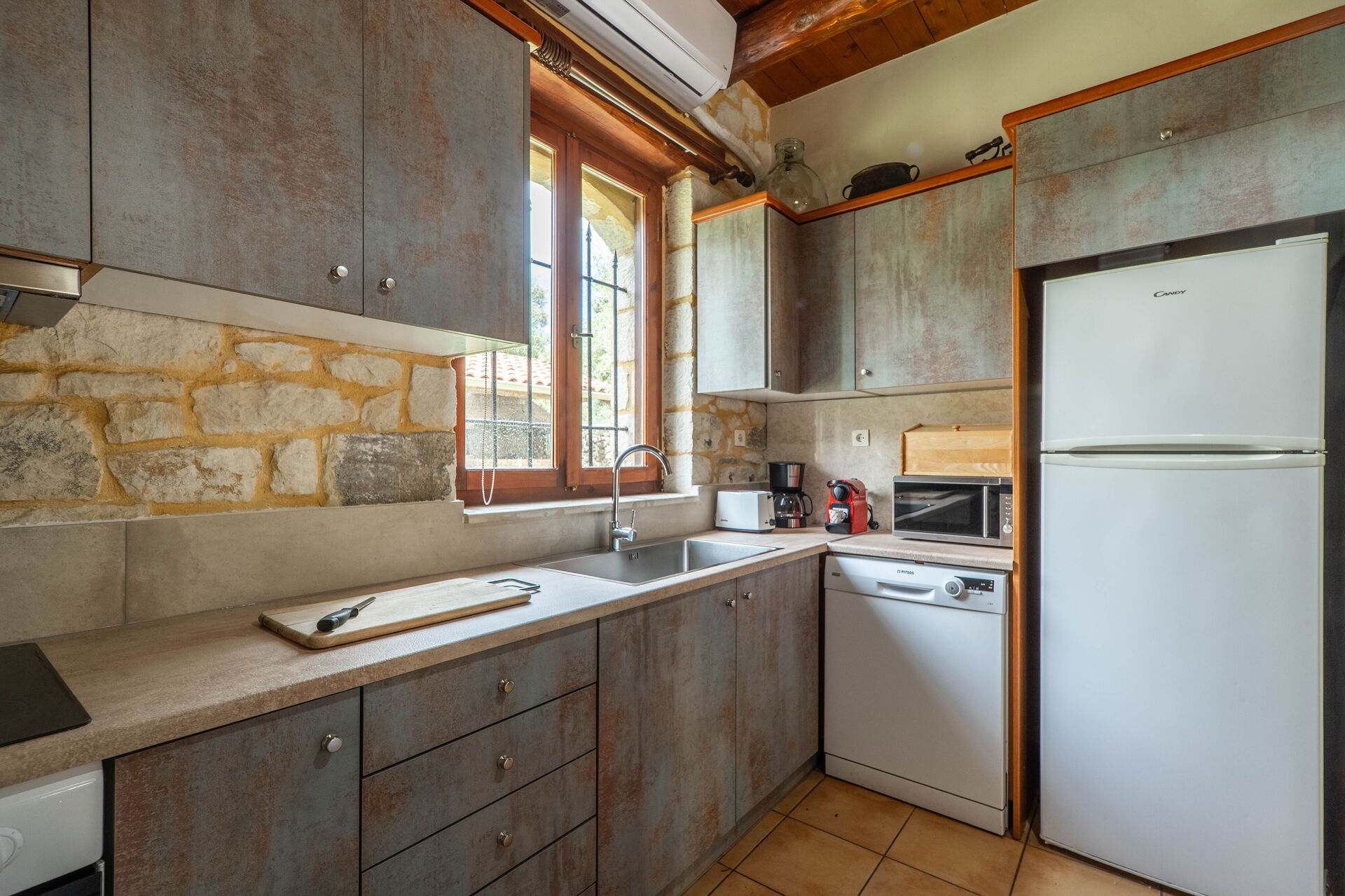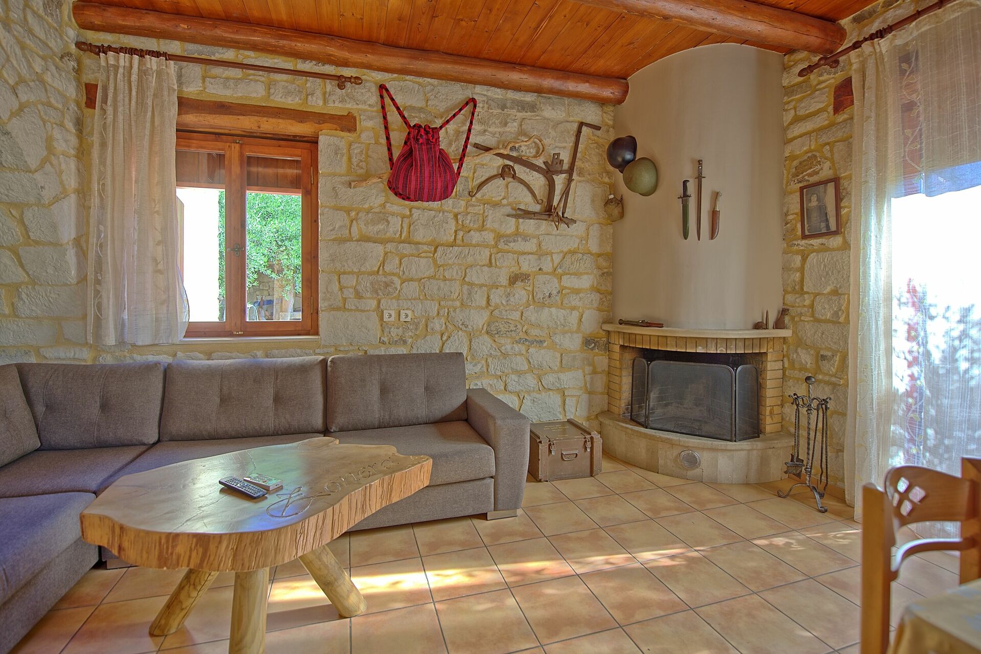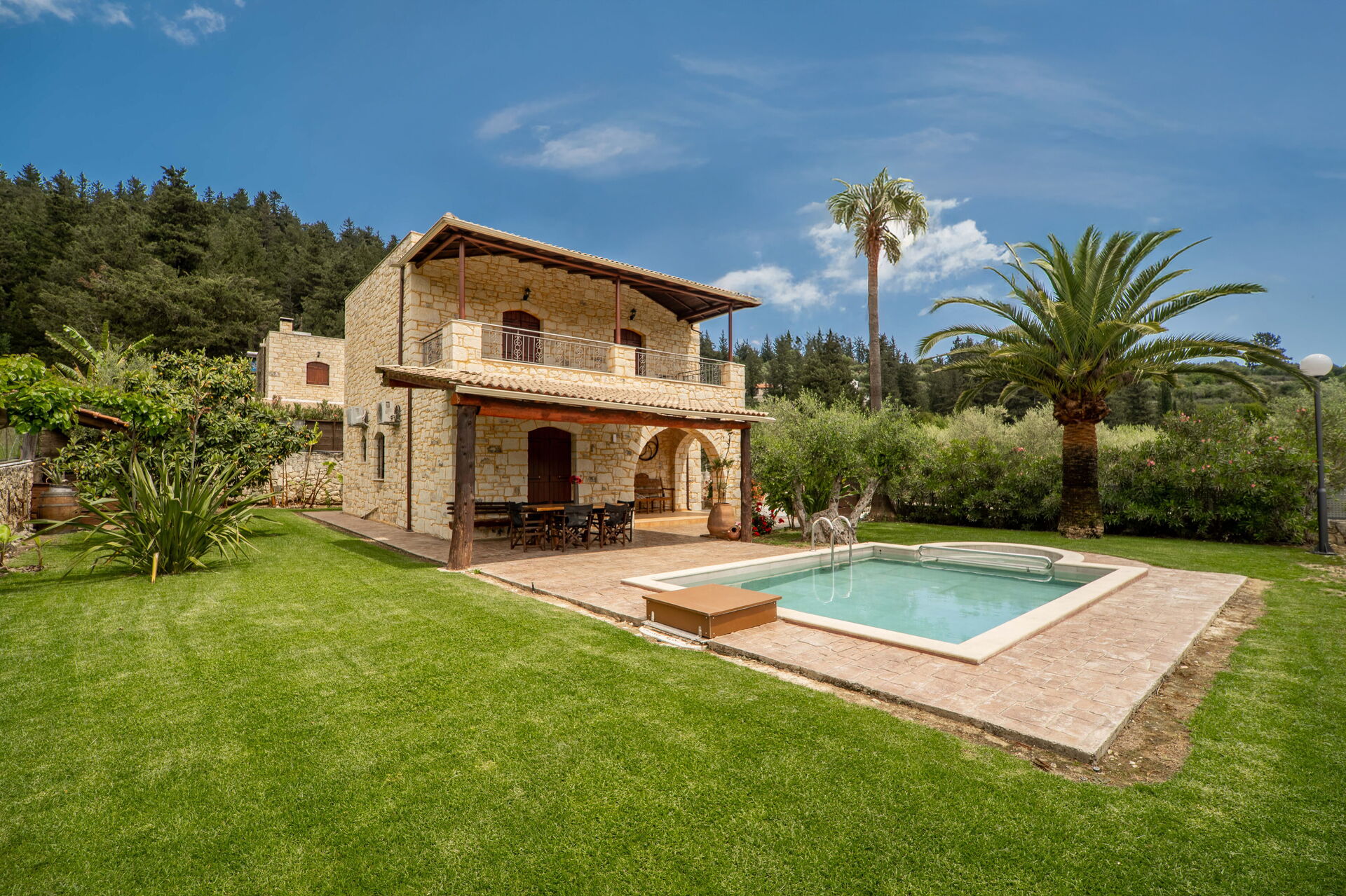 Inside, the villa rental is set over 2 floors. The interiors are fully air-conditioned (included in the rental price), and finished with taste and style making wide use of local stone and traditional Cretan elements. On the ground floor there is a large lounge with adjoining kitchen and dining area. The lounge is equipped with comfortable sofas (as well as a sofa bed for the 7th guest), TV, direct access to the veranda. The well equipped kitchen (4 cooking, fridge/freezer, oven, washing machine) opens straight to the lounge area where a table for 6/7 guests is located. On the ground floor there is also a spacious twin bedroom opening straight onto the garden. A family bathroom with shower is also located on this floor. On the upper floor there are 2 further airy bedrooms and a family bathroom with baththb. The bedrooms are respectively a double and a twin and have access to a lovely furnished terrace providing relaxing views over the countryside.