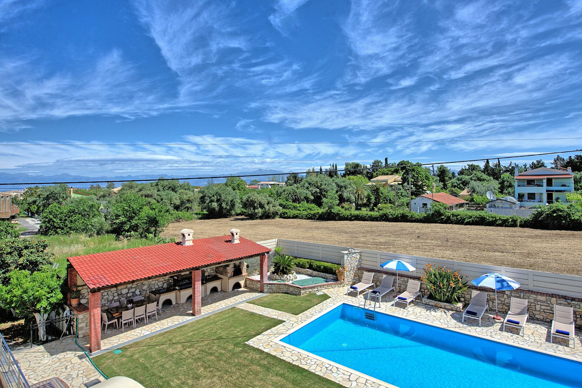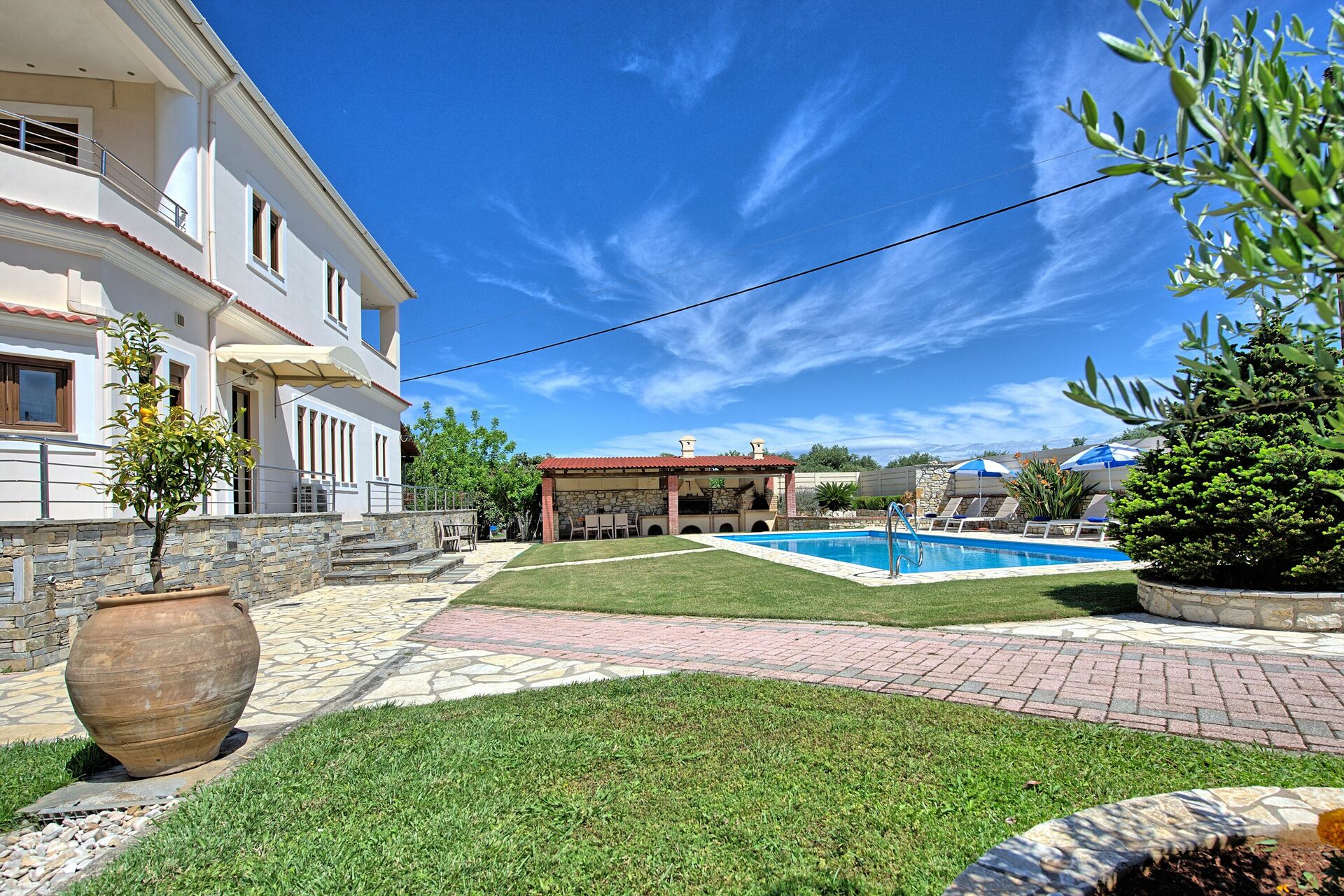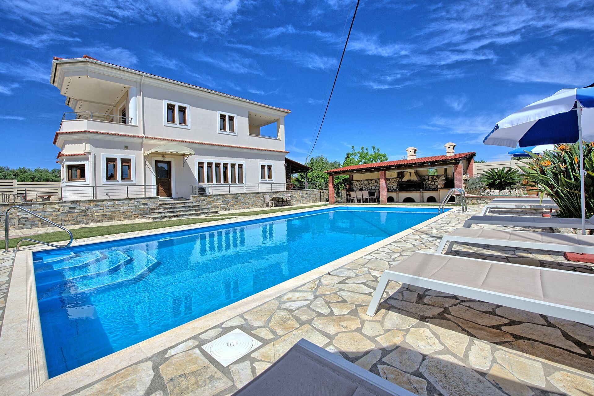 The outdoor areas of the villa, equally impressive, are completely fenced. The newly installed swimming pool measures 10m x 5m (Roman Steps, depth 1.5m) and is surrounded by beautifully kept gardens with lawn. Comfortable sunbeds for all the guests and parasols are provided. The lovers of al-fresco dining will truly fall in love with the huge outdoor kitchen, equipped with brick-built barbecue and even a wood burning oven! Table and chairs for enjoying long meals under the Greek sky are provided both by the barbecue and in the rear terrace. The grounds are beautifully lit at night, for further enjoyment. Secure parking for 2 cars is also available.