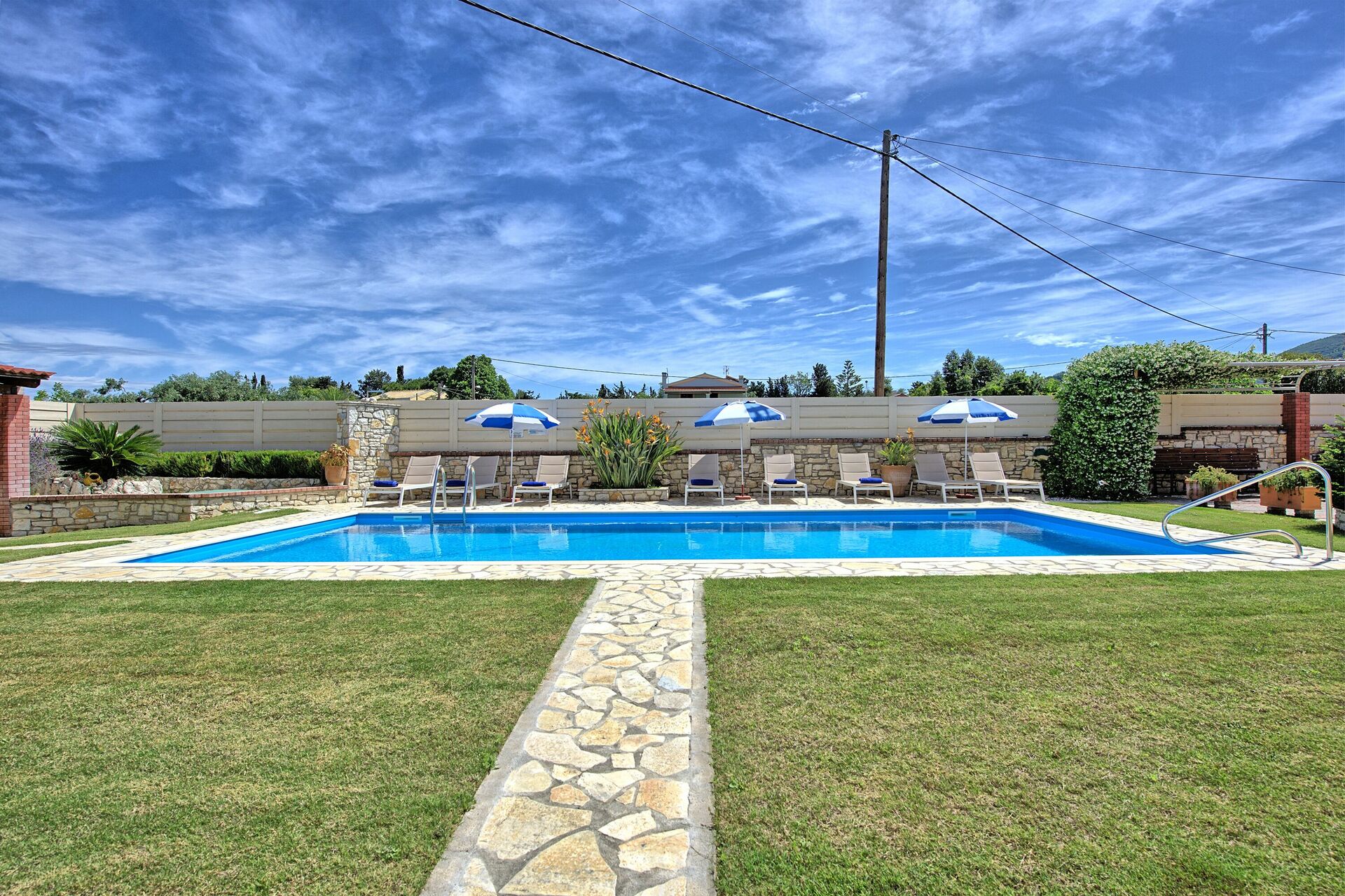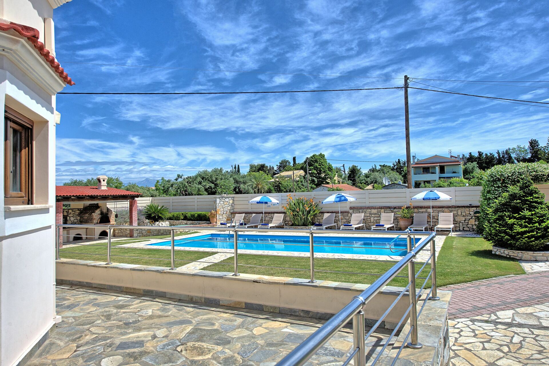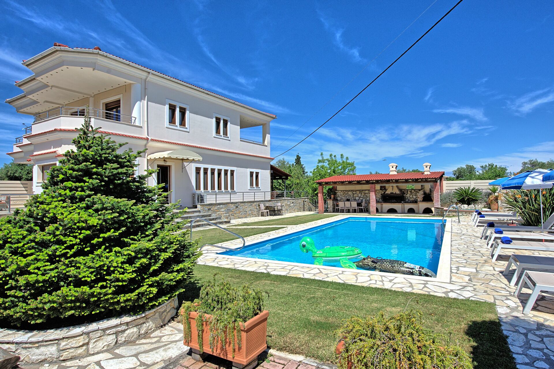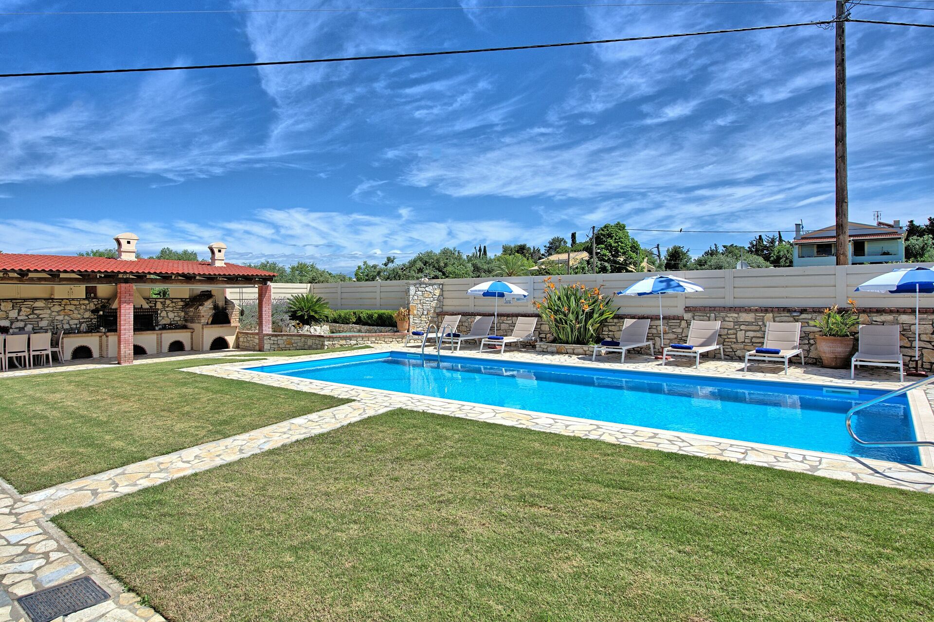 The outdoor areas of the villa, equally impressive, are completely fenced. The newly installed swimming pool measures 10m x 5m (Roman Steps, depth 1.5m) and is surrounded by beautifully kept gardens with lawn. Comfortable sunbeds for all the guests and parasols are provided. The lovers of al-fresco dining will truly fall in love with the huge outdoor kitchen, equipped with brick-built barbecue and even a wood burning oven! Table and chairs for enjoying long meals under the Greek sky are provided both by the barbecue and in the rear terrace. The grounds are beautifully lit at night, for further enjoyment. Secure parking for 2 cars is also available.