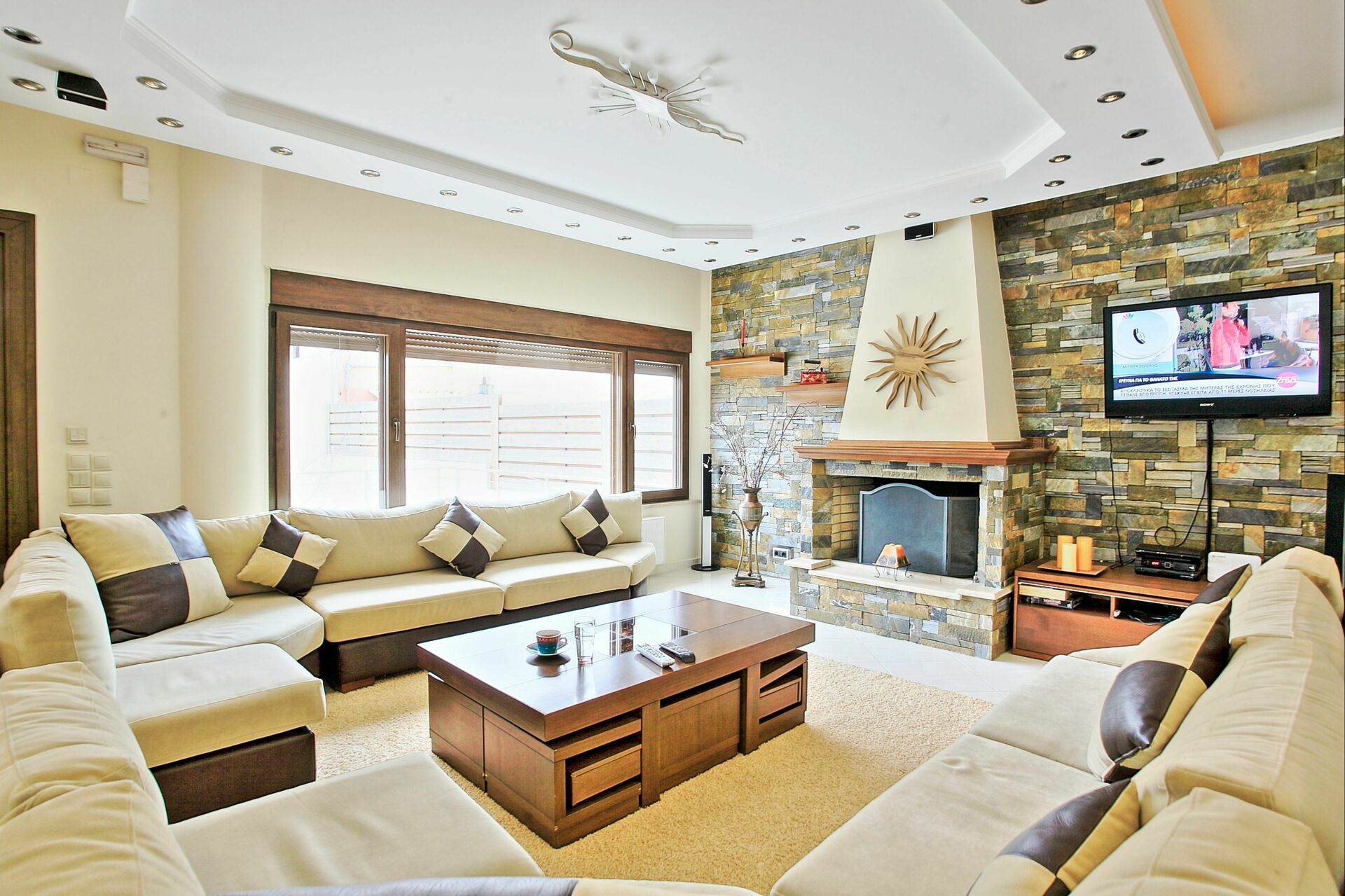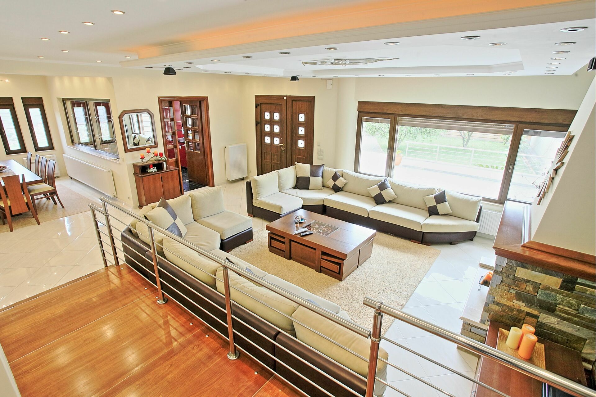 Inside, this luxury vacation rental is set over 2 floors and is accessible via an imposing staircase. Entrance is onto a large lounge, featuring comfortable sofas, stone fireplace, satellite TV and dining table for 10. Large windows and hundreds of spotlights on the ceiling provide a feeling of space and freedom. The separate kitchen, purposely built for this villa, features marble surfaces and the best Miele appliances available on the market (including dishwasher, oven, microwave etc). On the ground floor there are also a WC for guests, a double bedroom (with access to a secluded rear balcony), a family bathroom with bathtub + washing machine, a shower room.