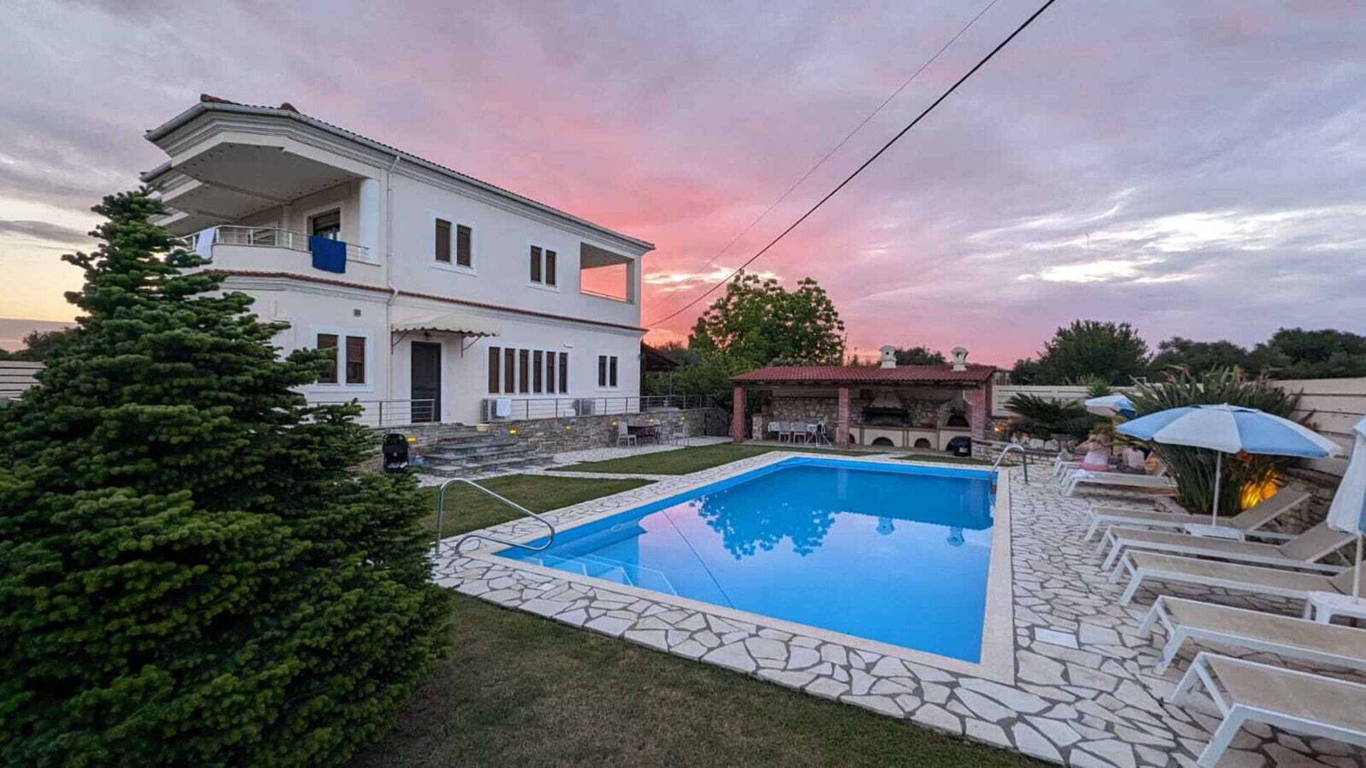 The villa is very well suited for a family or large group vacation. 2 minute walk to the main Acharavi town with restaurants, ice cream, bars, supermarkets, and shops. 10 minute walk or quick drive down to the beach. The nearby beaches are rocky (bring water shoes), or it’s a 5-10 minute drive up to Almyros beach which is sandy if that’s what you’re looking for. Corfu has a ton of different style beaches, so you have lots of options with a car. The villa has air conditioning with two units (one for each floor), so you’ll need to keep bedroom doors open to keep each room cool. AC is necessary in July while we were there (at least for our group of Americans). Highly recommended. As advertised. The large electrical wire over the pool really didn’t bother us during our stay.