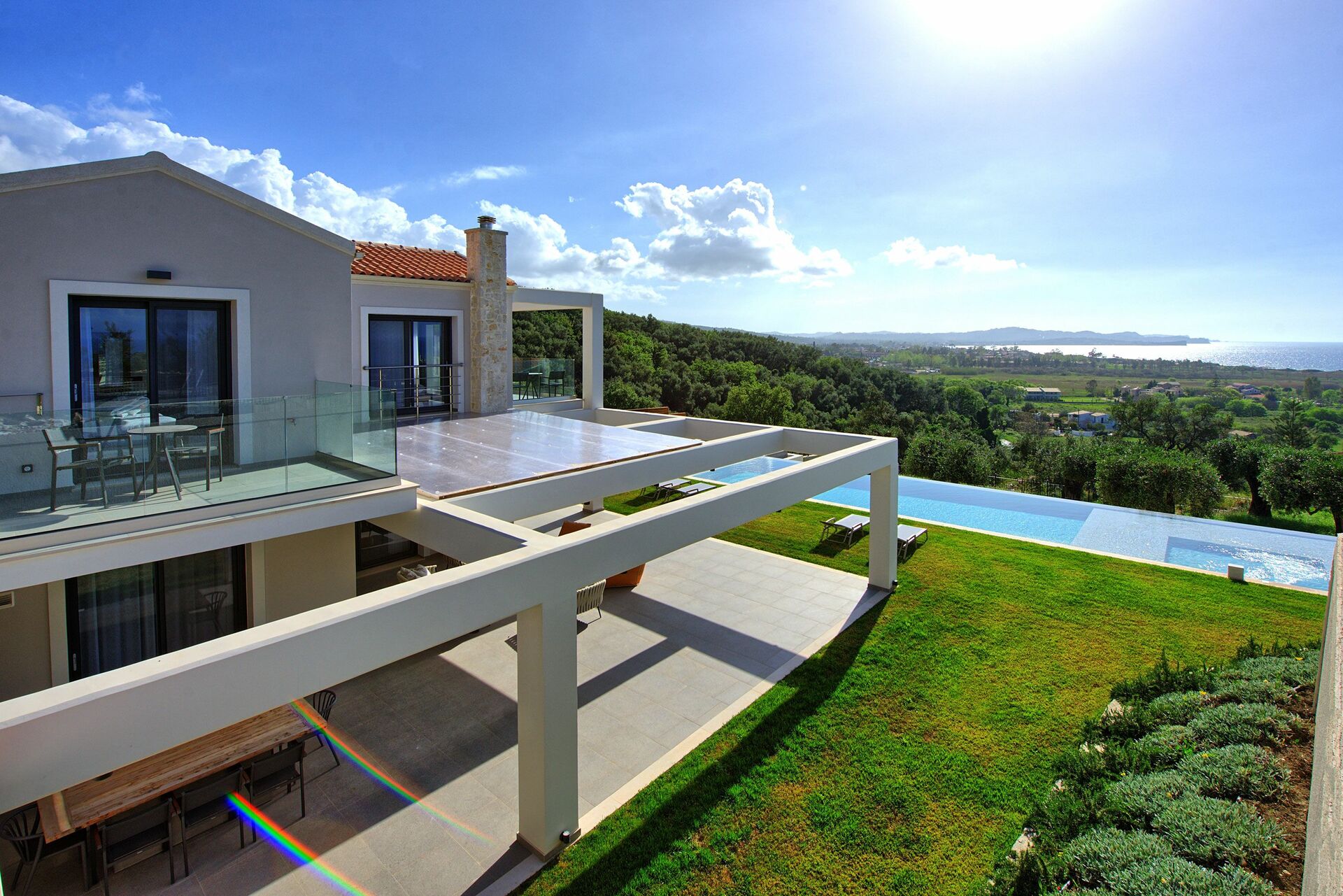 A beautiful, modern and spacious property perched on a hill with views from all the rooms overlooking the sea and the Albanian mountains in the distance.
