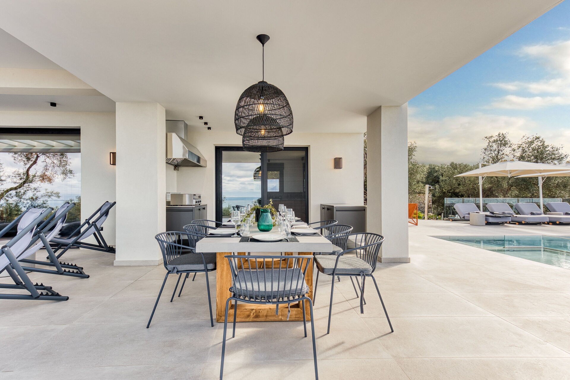Villa Dominante’s scenic garden has a lovely private pool where you can watch the sun set over the sea of Corfu, and an outdoor dining area.