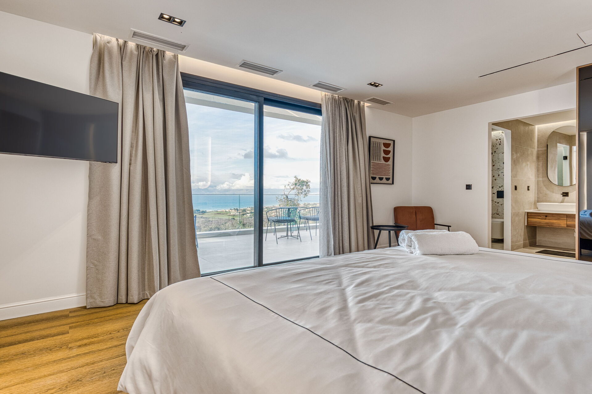 This luxury vacation villa rental in Corfu sits in a scenic location overlooking the sea and countryside. It offers exclusive, well-appointed interiors, and 4 bedrooms, each with a private bathroom, to accommodate up to 8 people.