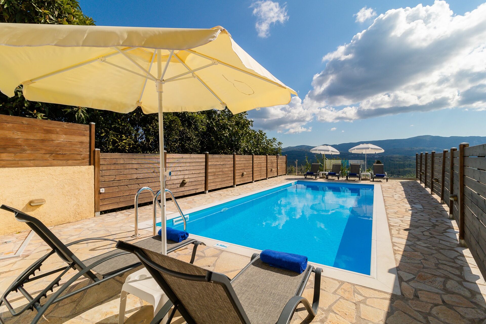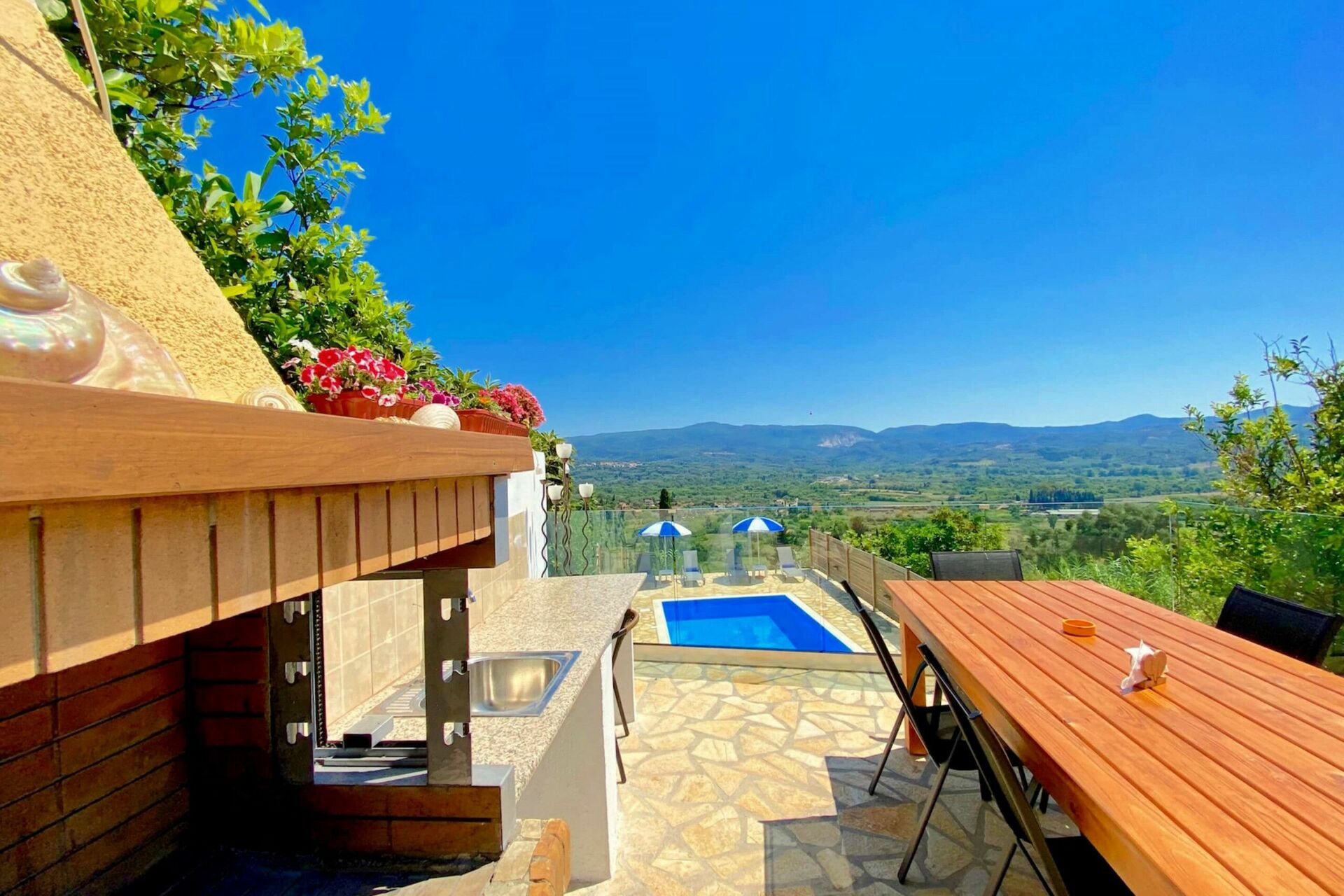 The villa keeps up to the big expectations you get by seeing the pictures. The house is beautiful and has classy furniture. The pool area is characterized by a very pleasant water temperature and an astonishing view and is very practical too: the dining table and the grill area can offer a beautiful dinner ambiente. The owners are very courteous and helpful. There are a few minor flaws, as for example the very small streets and parking spaces you have to deal with, but in total I can absolutely recommend the villa.