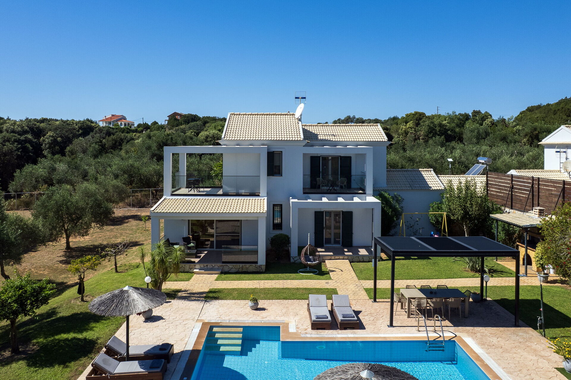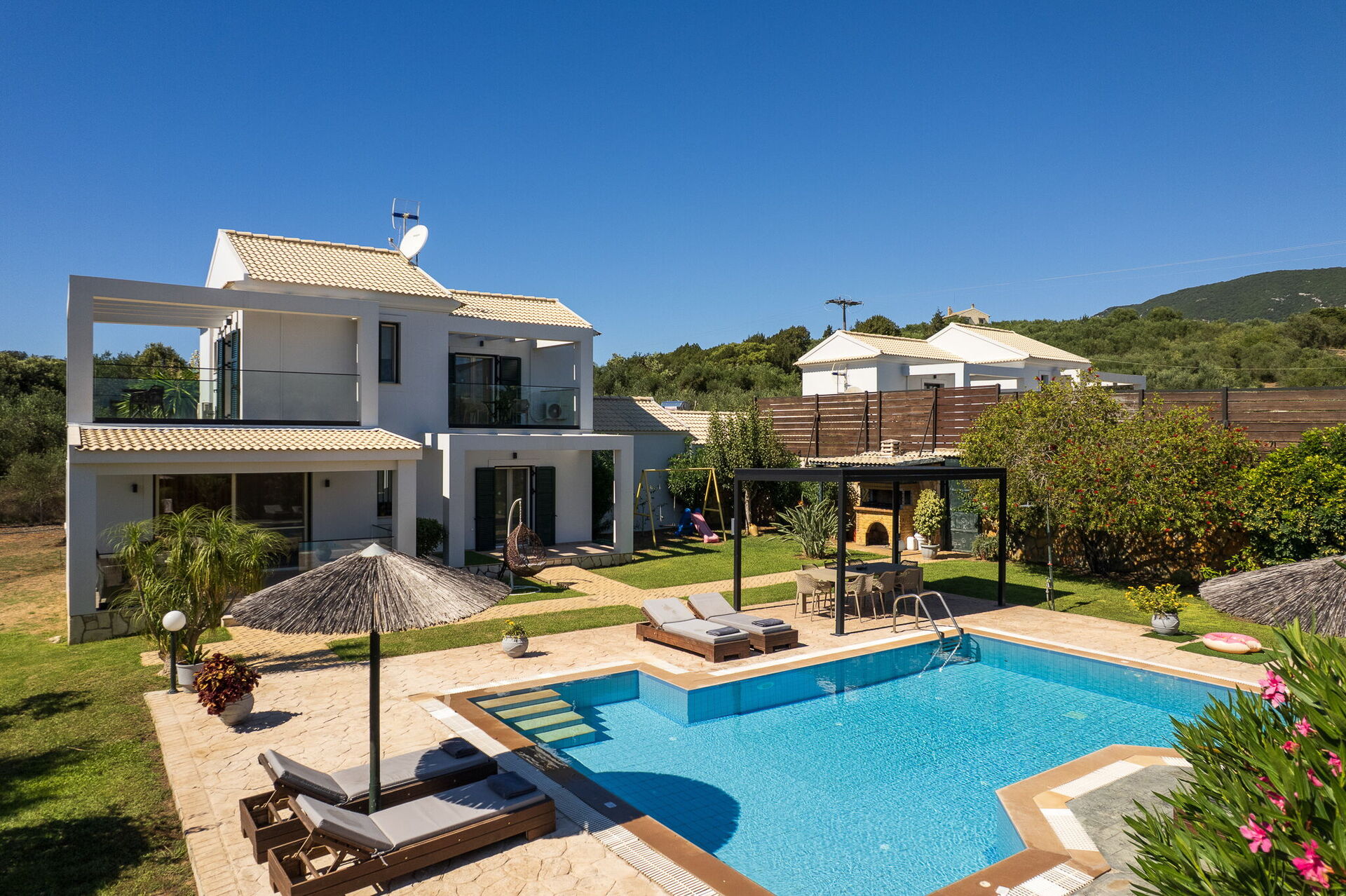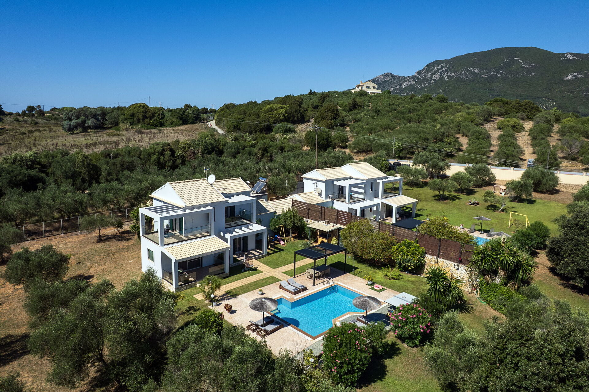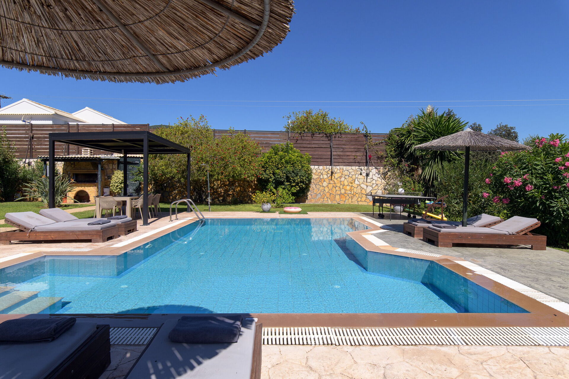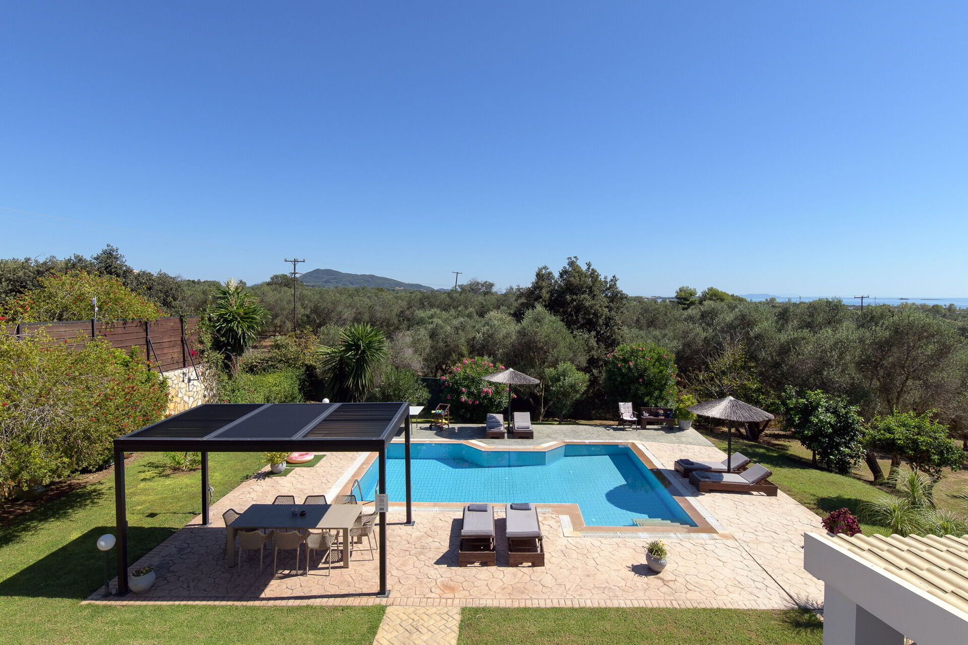 The grounds offer common areas where guests can enjoy time with friends or family, and spend unforgettable moments in the Corfu sun, whether relaxing at the gazebo’s outdoor dining area, or by the spacious pool area with a sunbathing space.