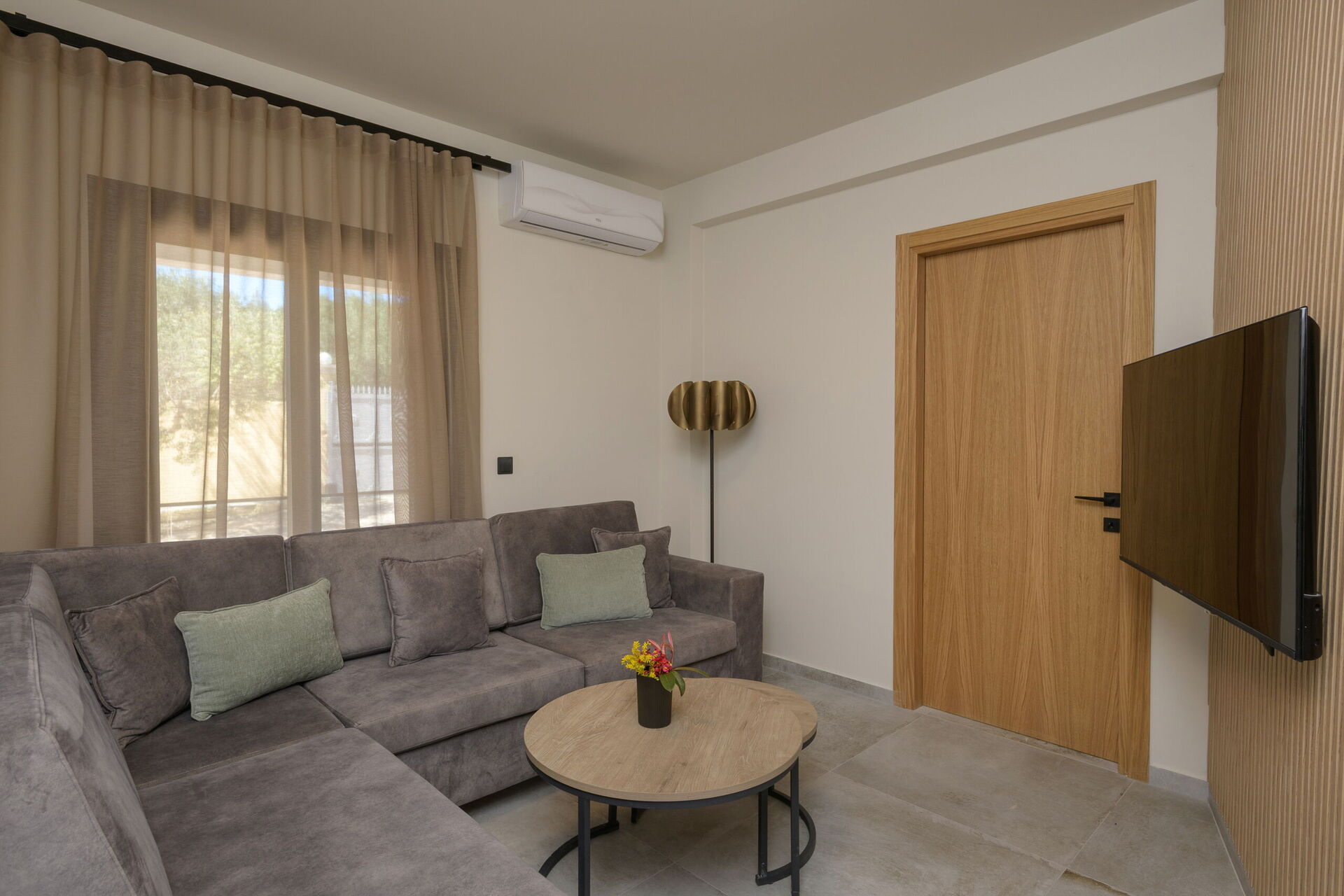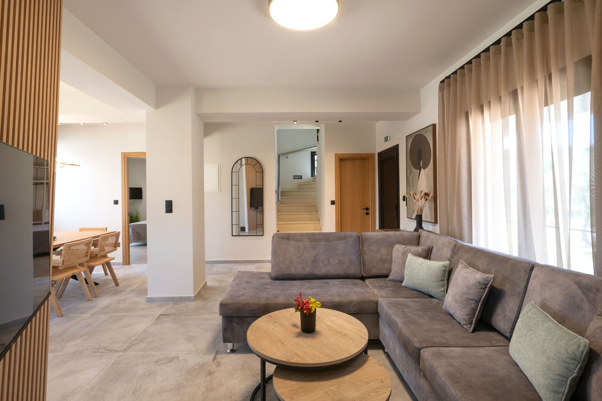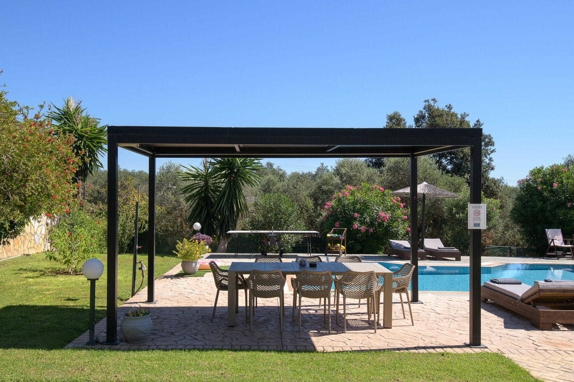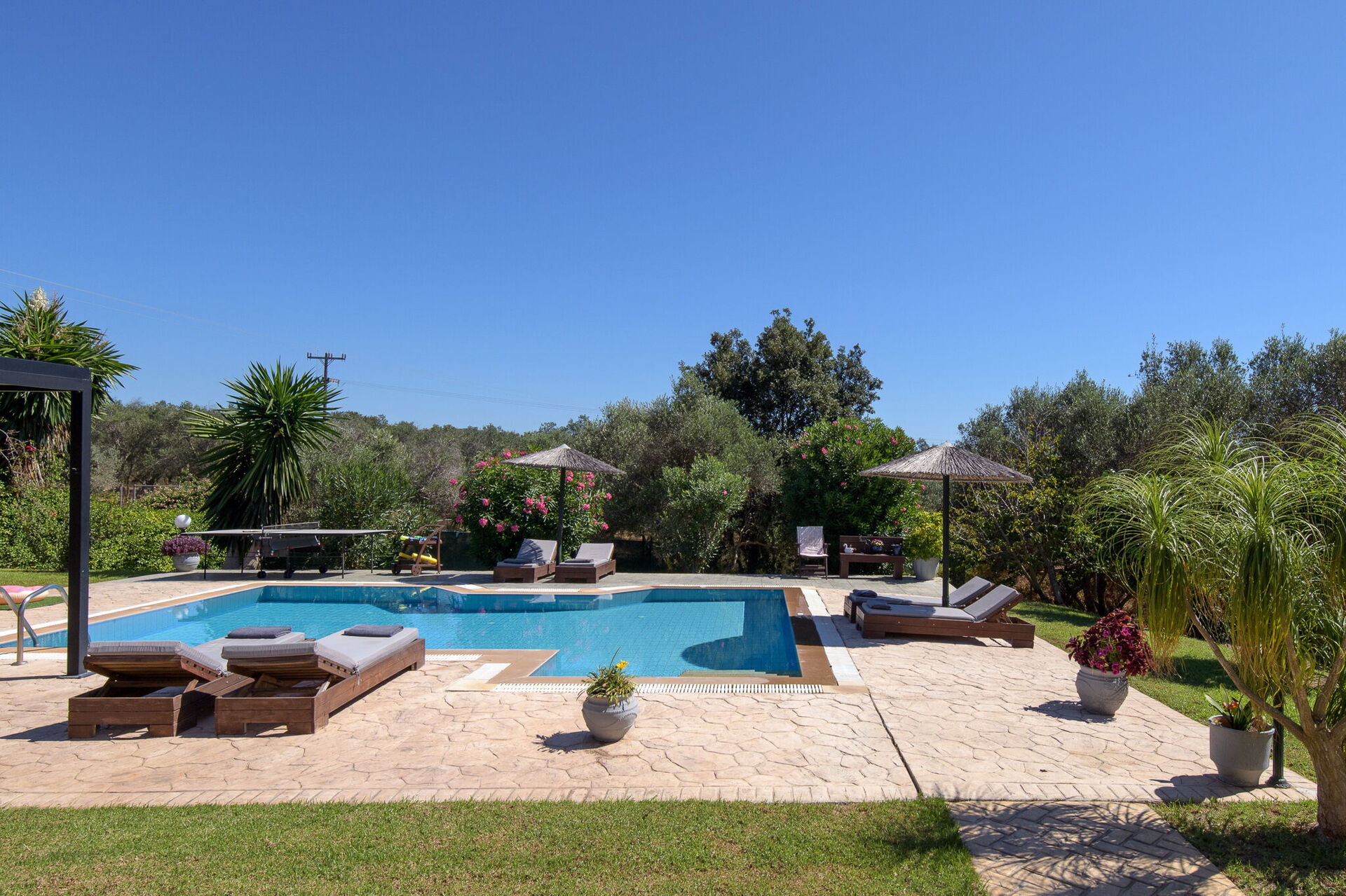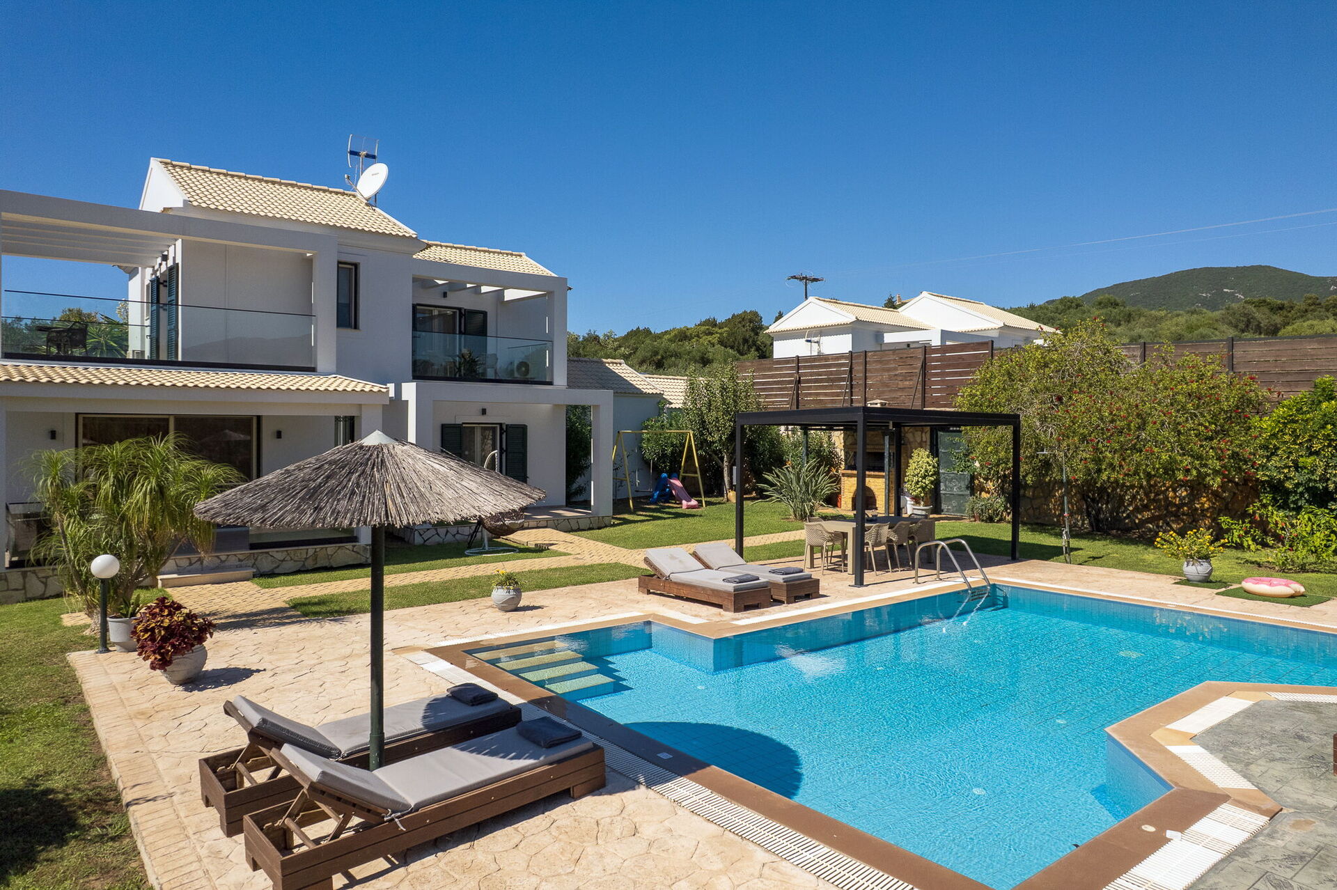 The grounds offer common areas where guests can enjoy time with friends or family, and spend unforgettable moments in the Corfu sun, whether relaxing at the gazebo’s outdoor dining area, or by the spacious pool area with a sunbathing space.