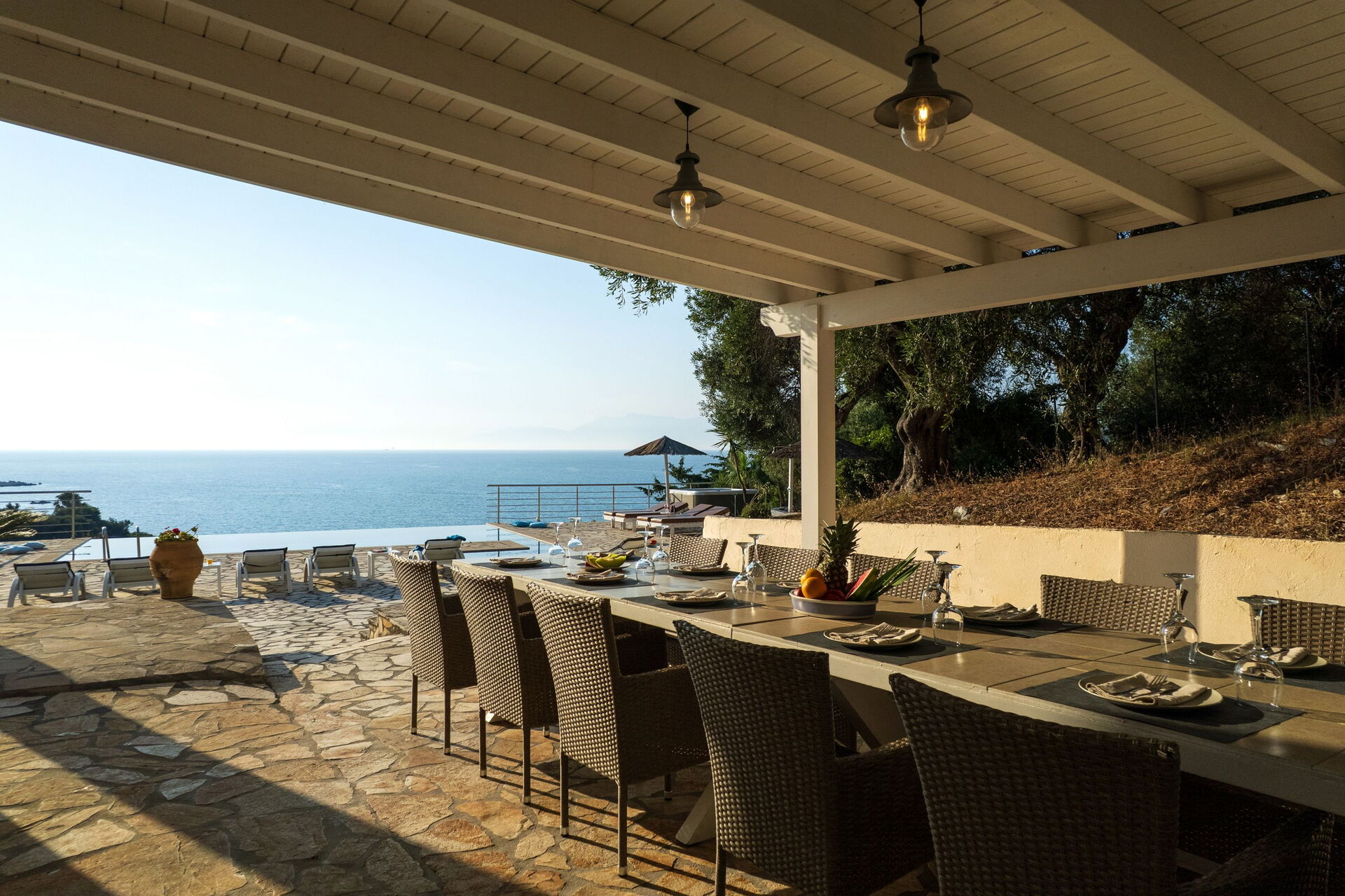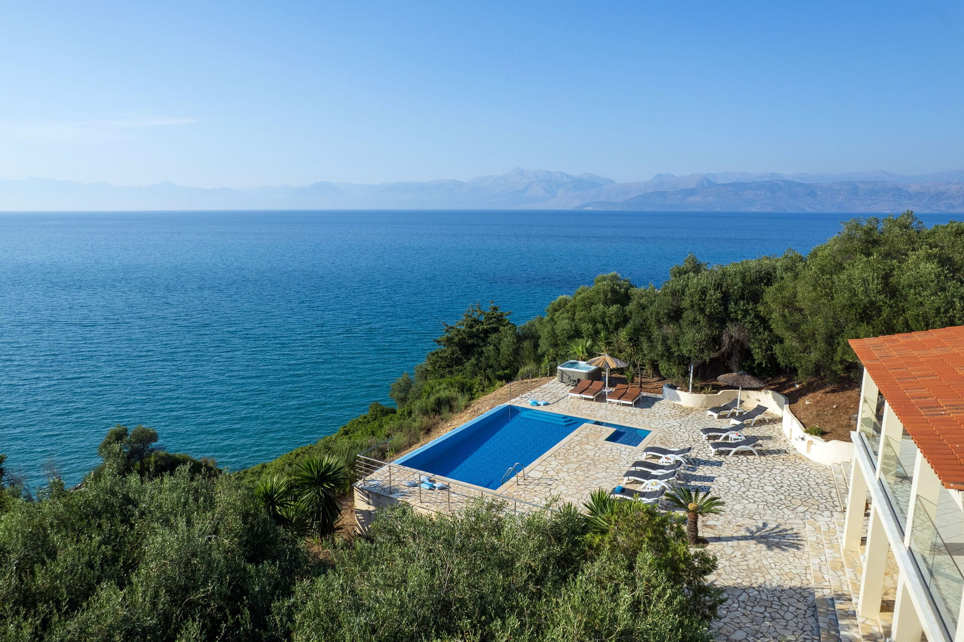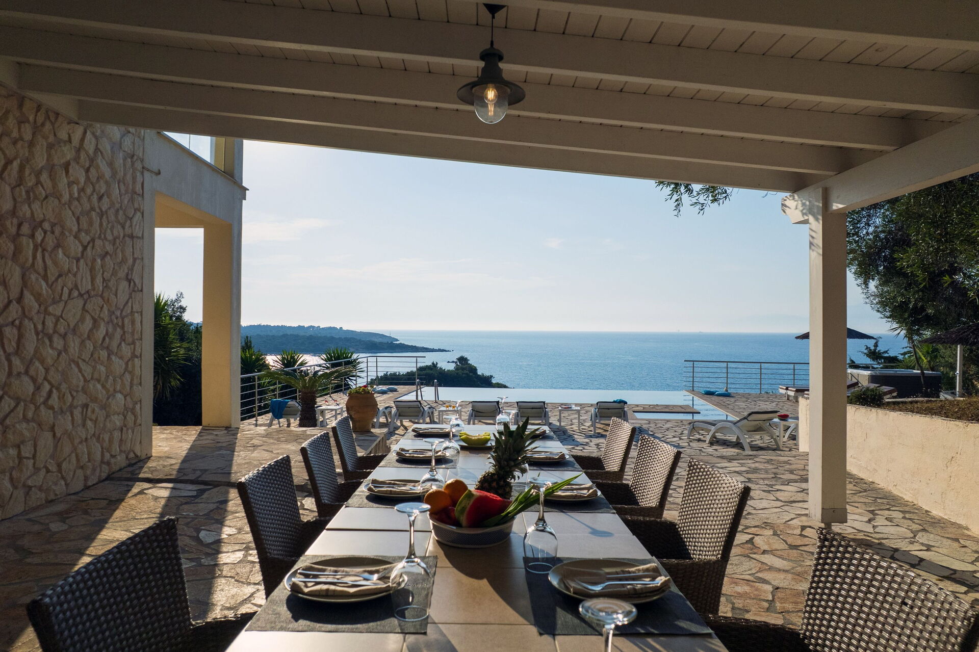 The first impressions of the Villa are the stunning views over the Ionian Sea to Albania and also over the lagoon towards north west Corfu. The sunsets are amazing.