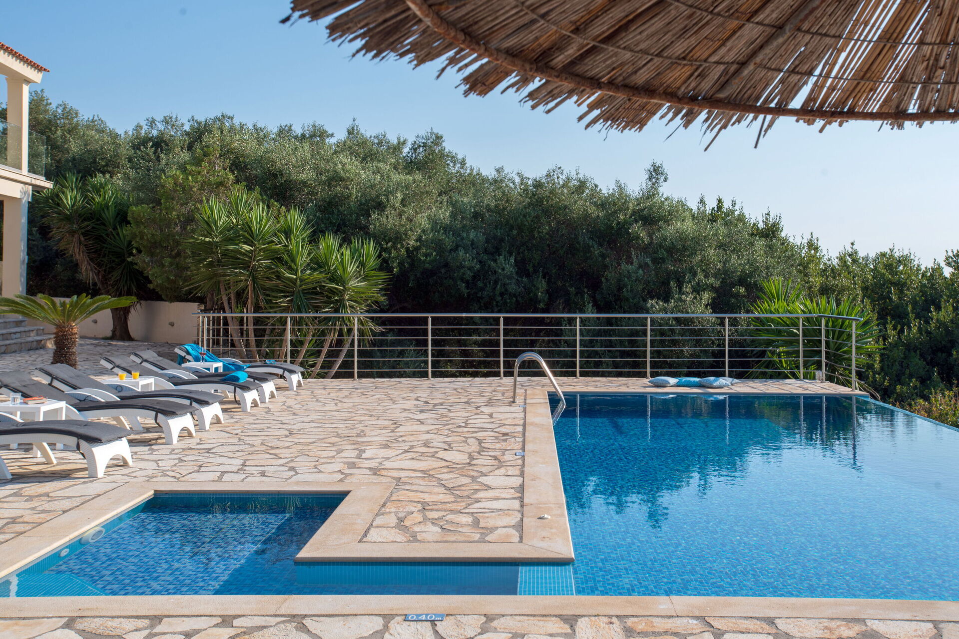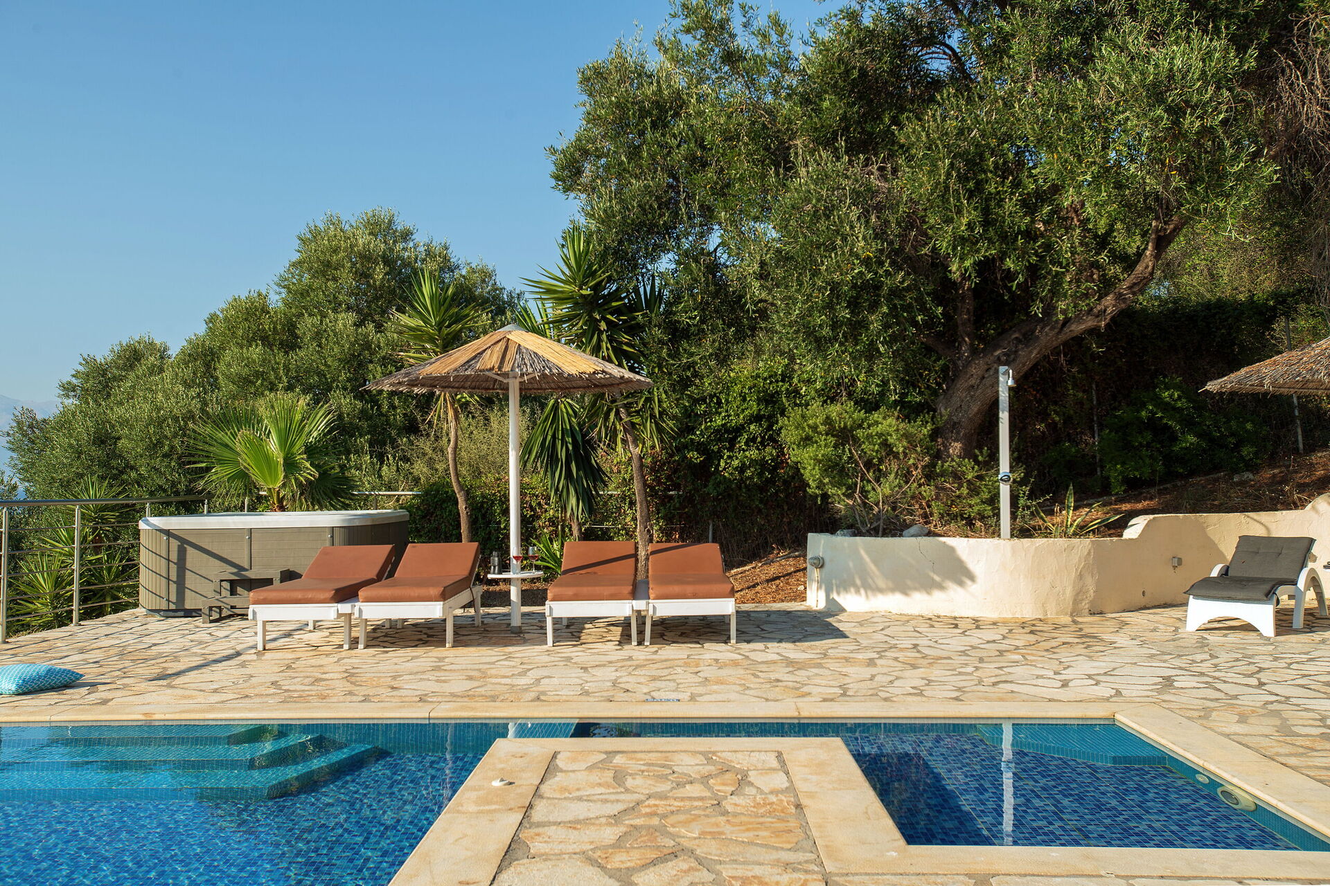 The irregularly-shaped pool (with separate children section), for the exclusive use of the guests, is set within extensive grounds surrounded by unspoilt nature. It measures 9.5 x 5m and depth is between 1.2m and 1.6m. Sunbeds and parasols are provided for lazy days under the shining Corfiot sun.