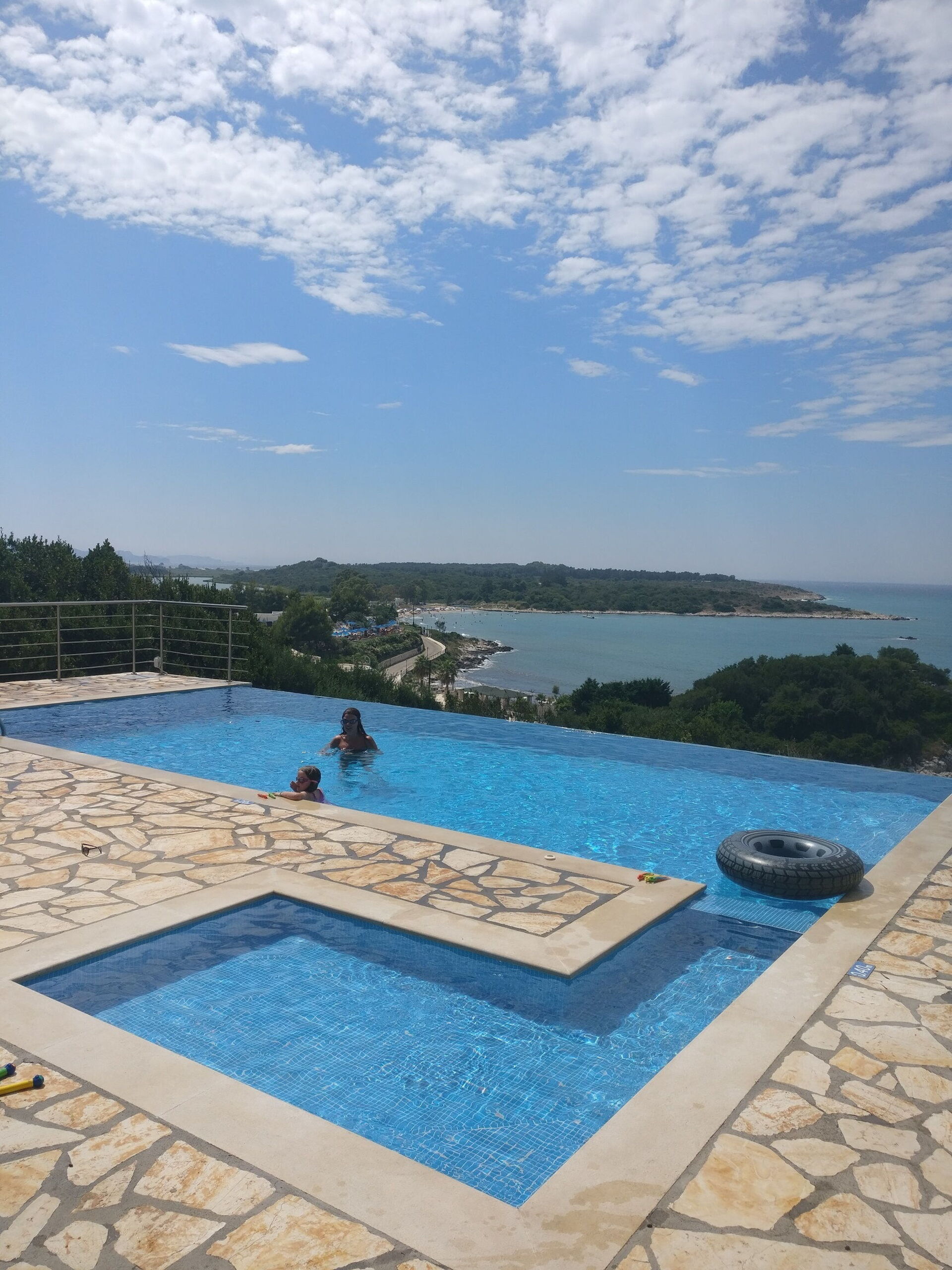 Fantastic view and a wonderful pool suitable for toddlers and adults. Plenty of space outside for children to run about and a large table where we could have our meals in the shade.