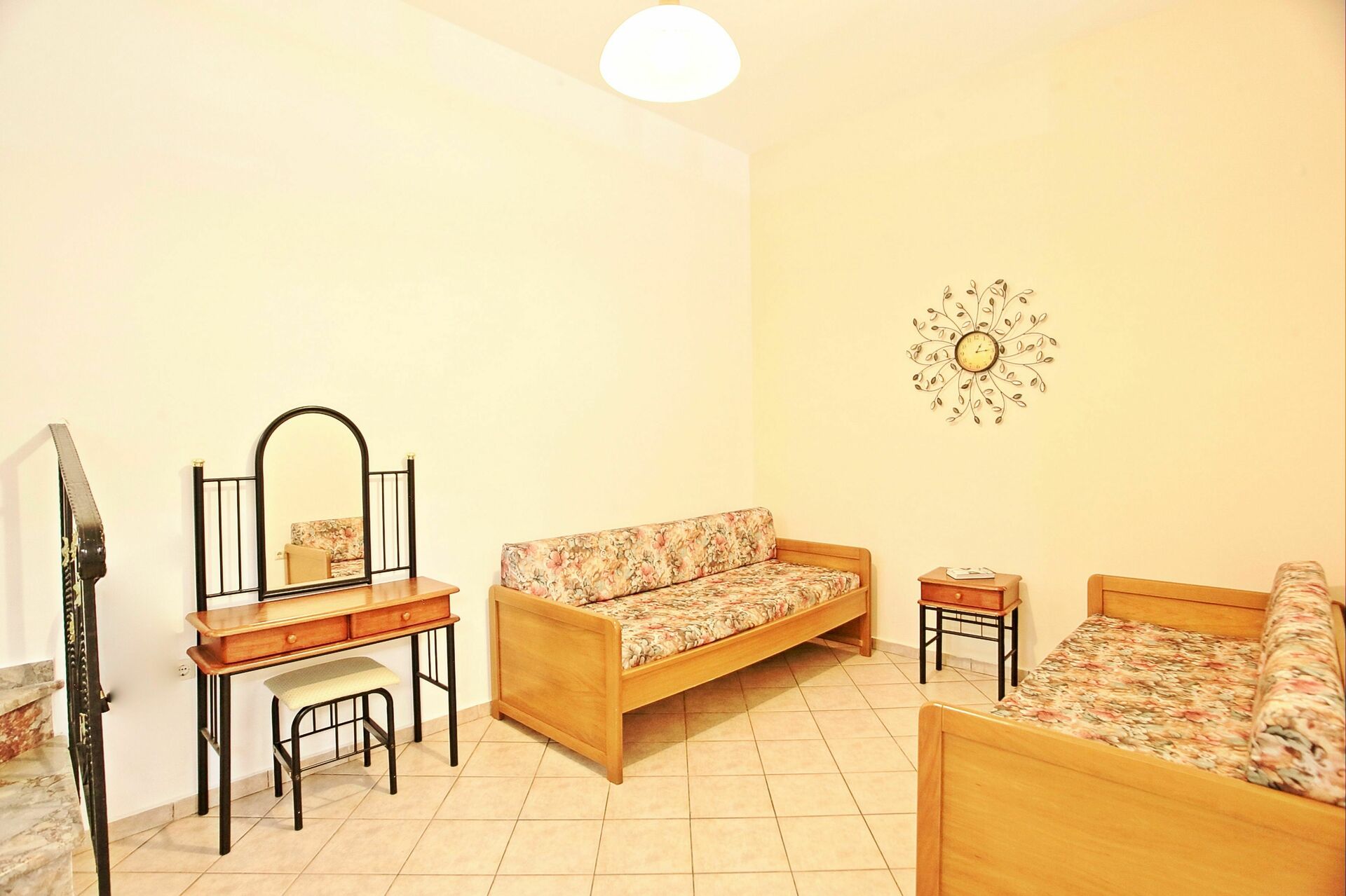 Partially underground floor: lounge (2 single beds / sofas), air-conditioned double bedroom, air-conditioned twin bedroom, bathroom with bathtub and washing machine.