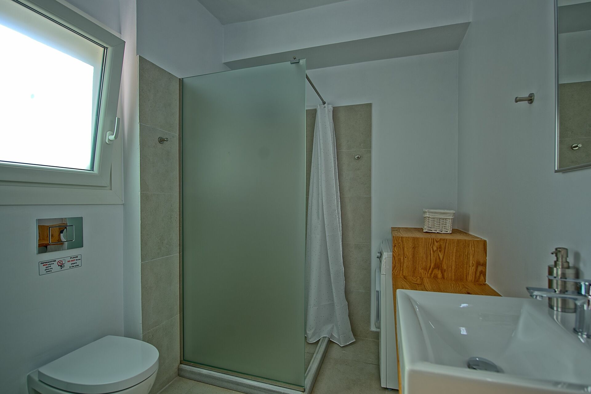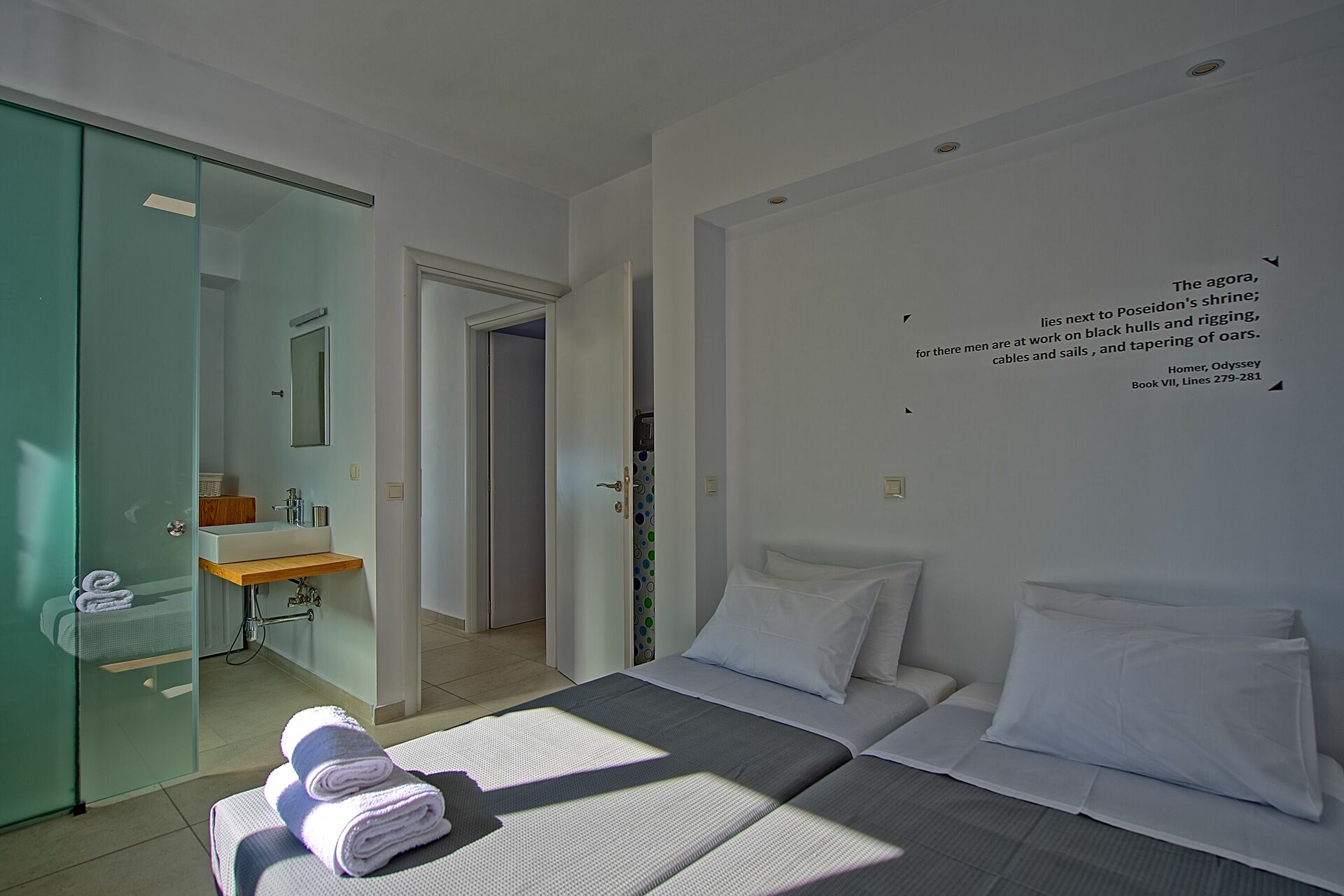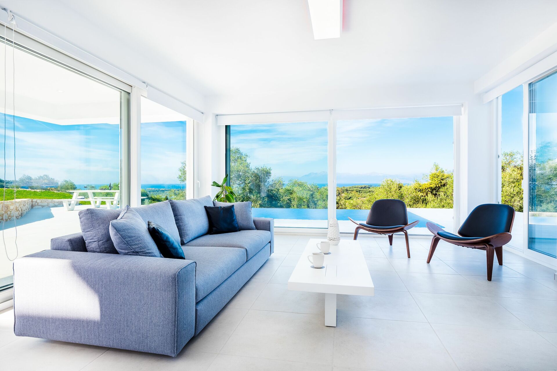 Inside, this modern villa is set over 2 floors connected via a side staircase. With huge patio doors, large windows, and designer furniture, Villa Nafsika enjoys all the sun and light that Greece can offer. On the ground floor there is a spacious lounge (sofas, wi-fi, air-conditioning) with adjoining kitchen (fully equipped) as well as 2 bedrooms (both en-suite). One bedroom has a double bed + a sofa (that can be turned into a full size single sofa bed) while the other bedroom is a twin. The upper floor is identical to the lower one, except that the master bedroom has just a double bed and not an extra sofa bed. Extensive terraces on both floors provide magical views over the ionian Sea and Albanian coastline beyond.