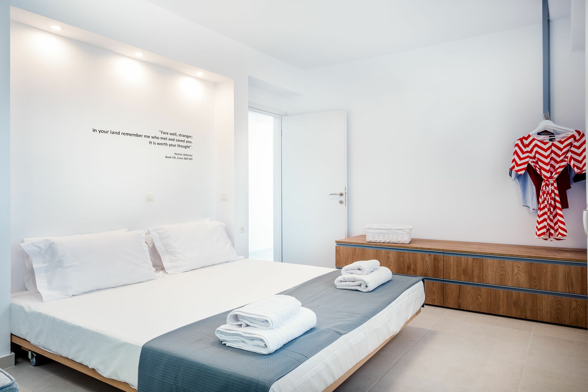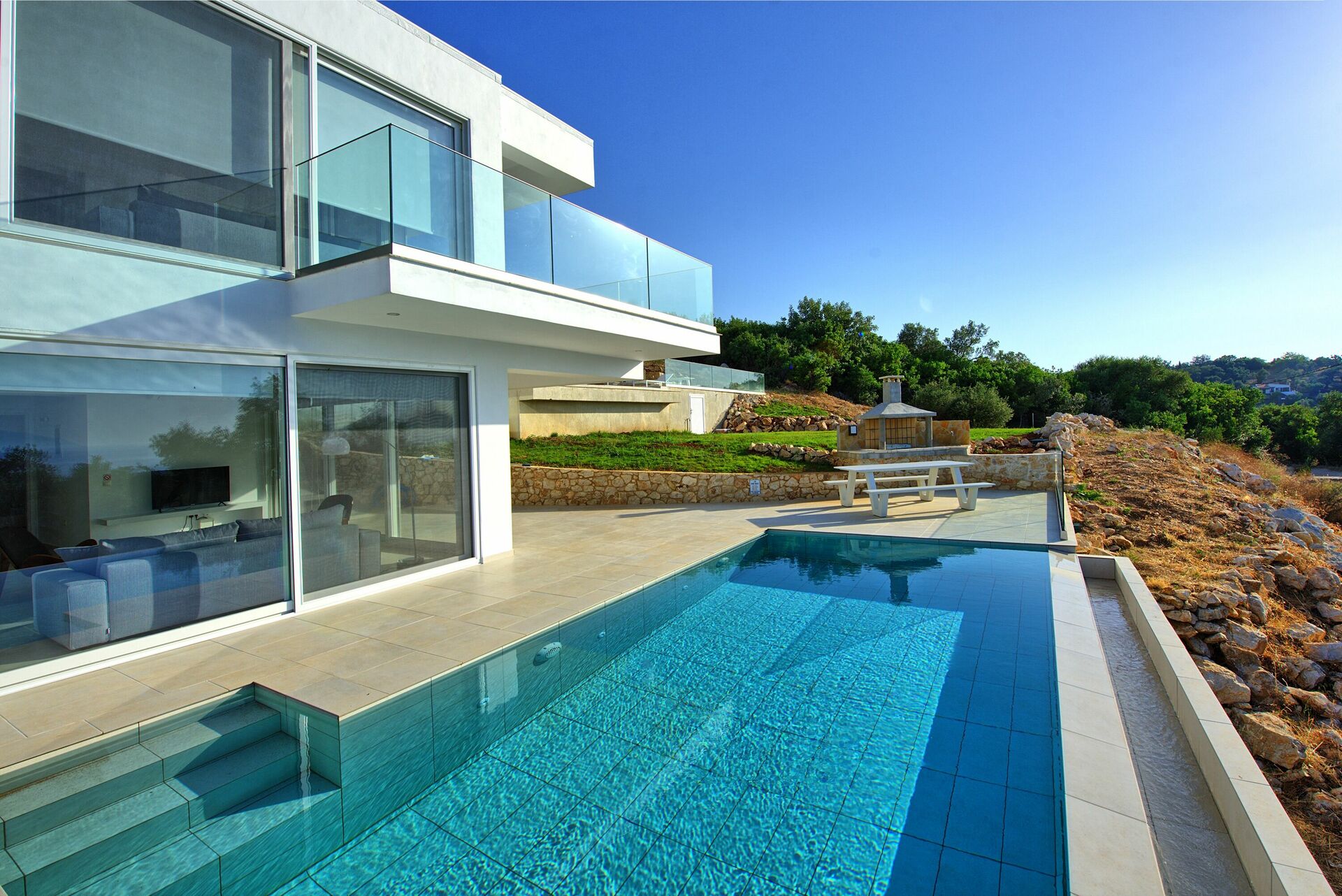 Outside, beautifully paved patios with sunbeds for all the guests to enjoy all the most sensational views and the breeze of the coastline. A dining area for the guests together with barbecue is available, for delicious al-fresco meals. The private pool measures 7.5m x 5.7m (depth 1.5m) and is beautifully lit at night (access via Roman Steps). Villa Nafsika is the perfect spot to enjoy a refreshing dip or a drink while admiring the sun going down in the sea.
