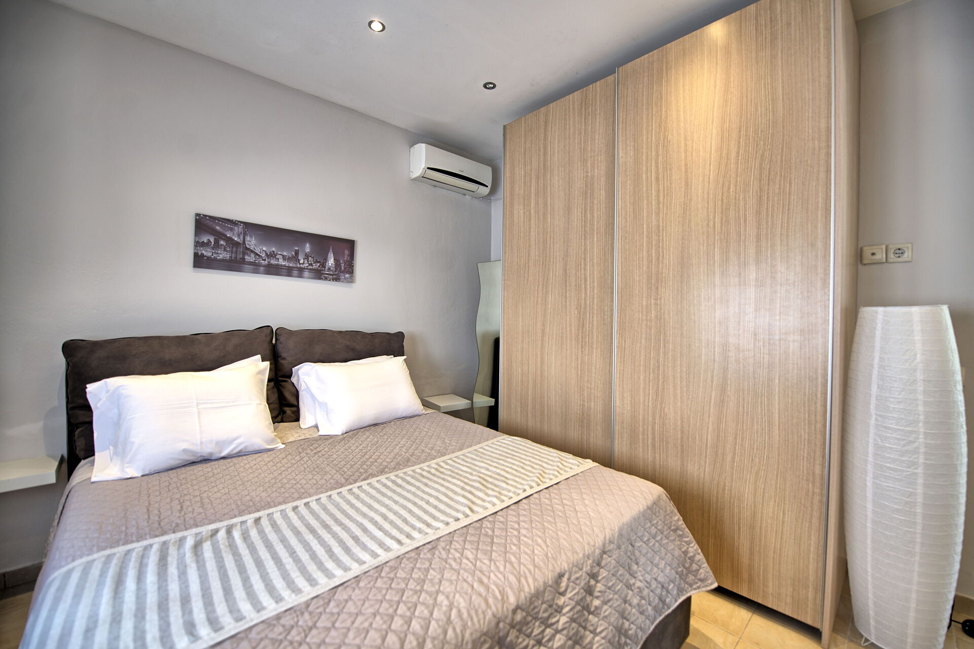 Ground floor (access is 4 steps up): living room (air conditioning) with dining area and kitchen corner (oven, freezer, microwave); 1 double bedroom (air conditioning); single bedroom; bathrooms with shower; double bedroom (air conditioning) with private bathroom with shower.
